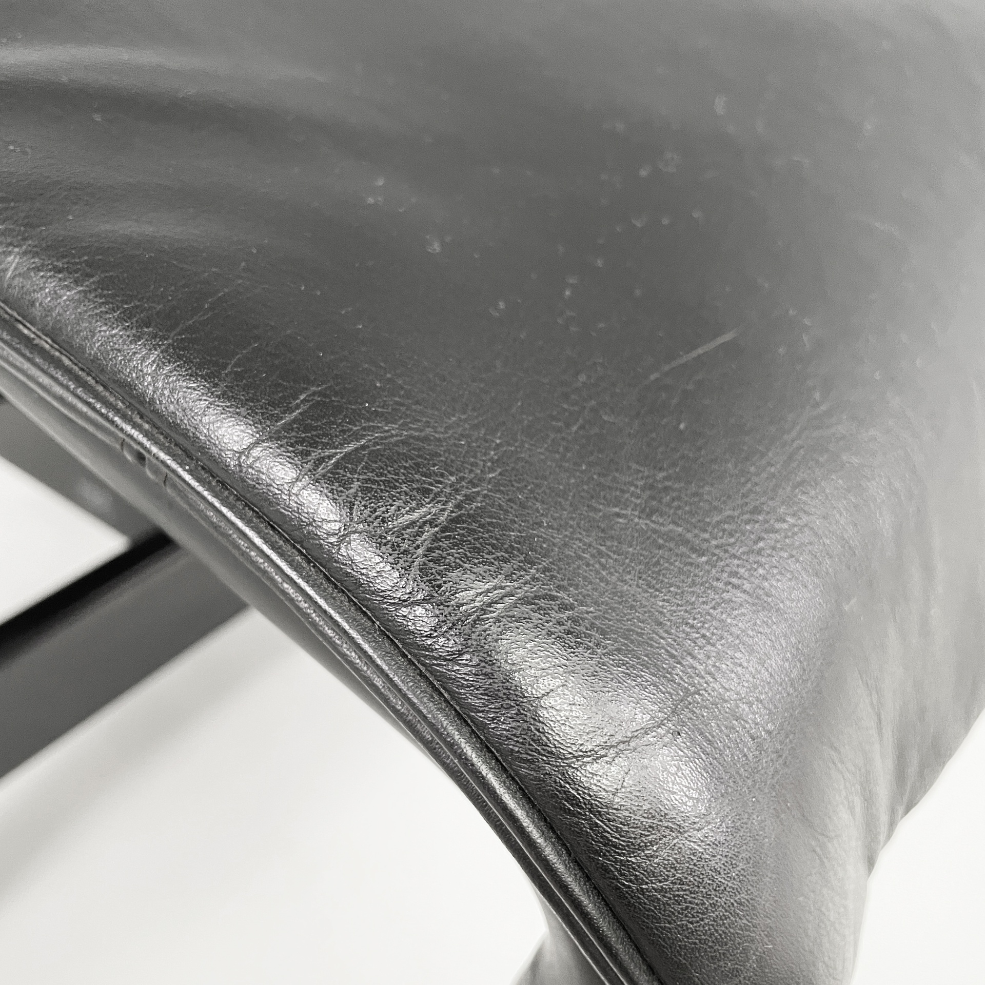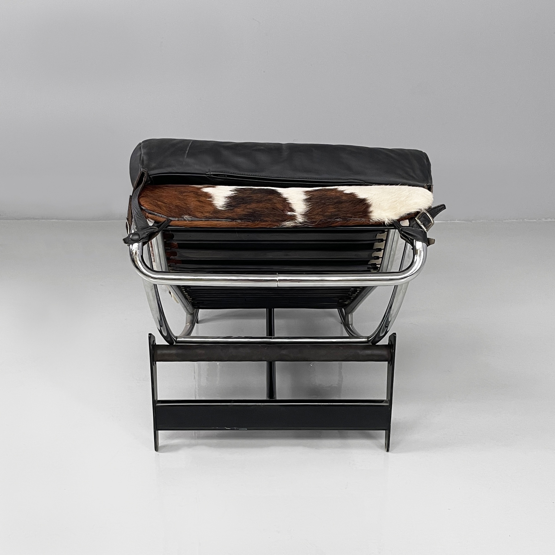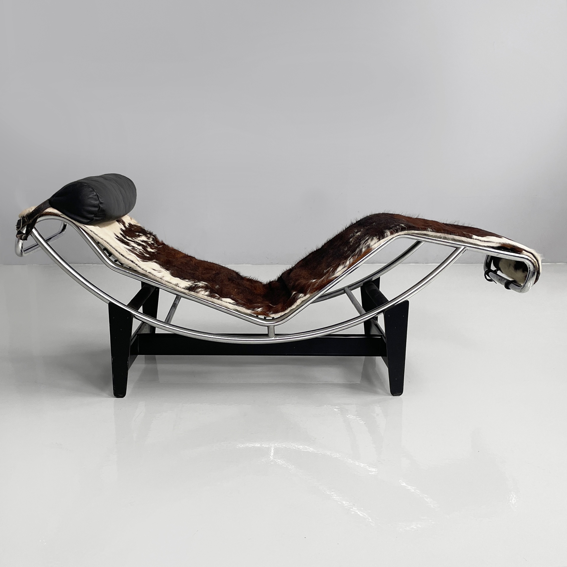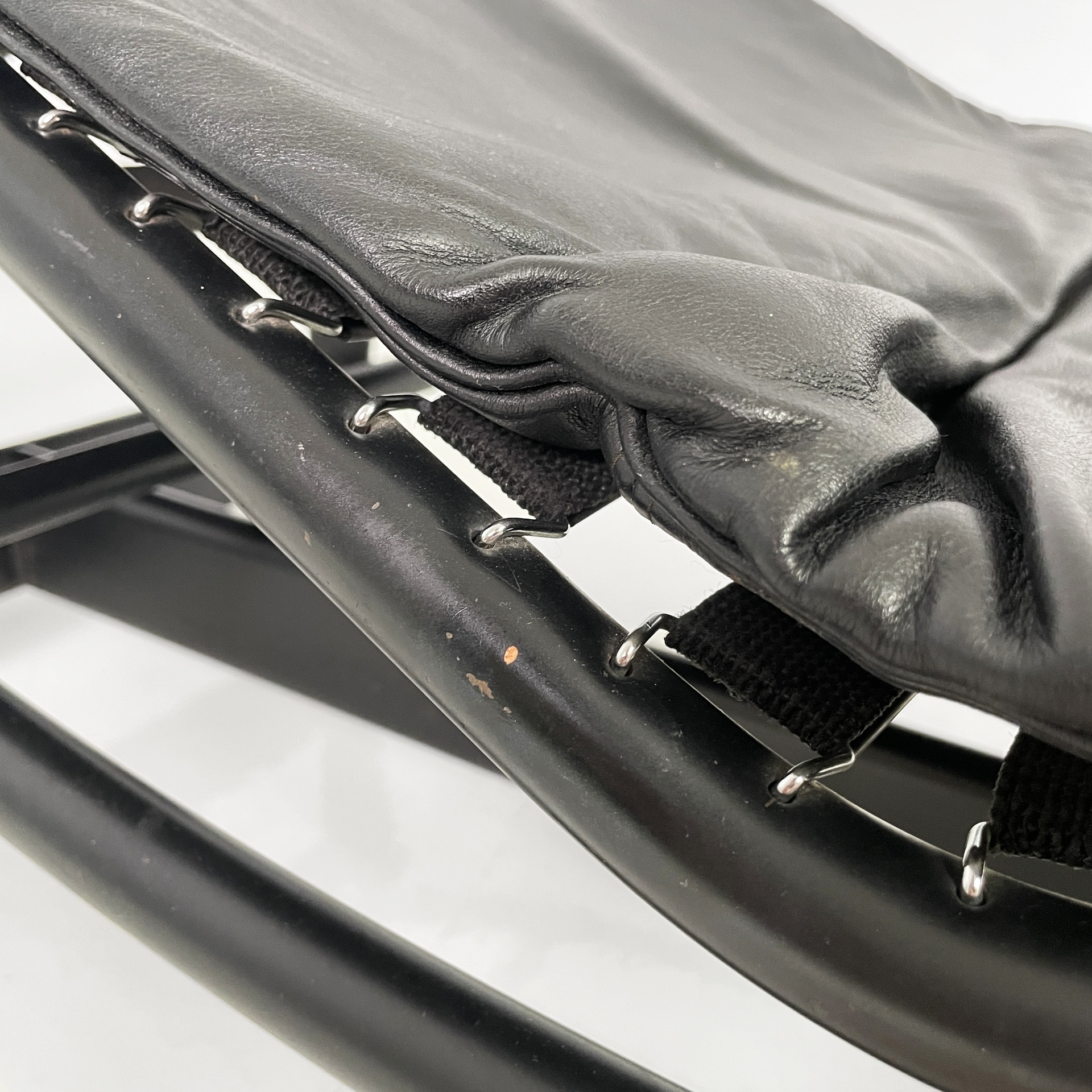 Poltrona o chaise longue modello LC4 con struttura in metallo nero a supporto della seduta curvata composta dal telaio in tubolare d’acciaio e dal cuscino in pelle nera a coprire l’intera struttura. Poggiatesta sempre in pelle di forma cilindrica agganciato alla struttura con maniglia posteriore sempre in tubolare d’acciaio utilizzata per il posizionamento della seduta rendendola più da relax o da lettura.