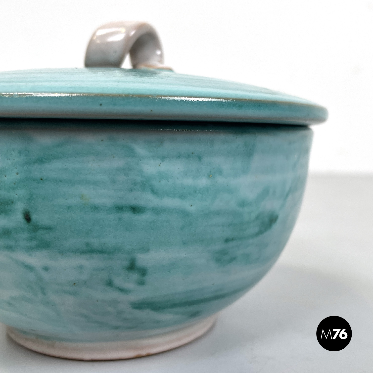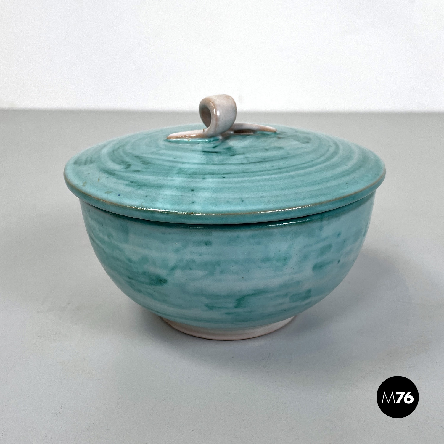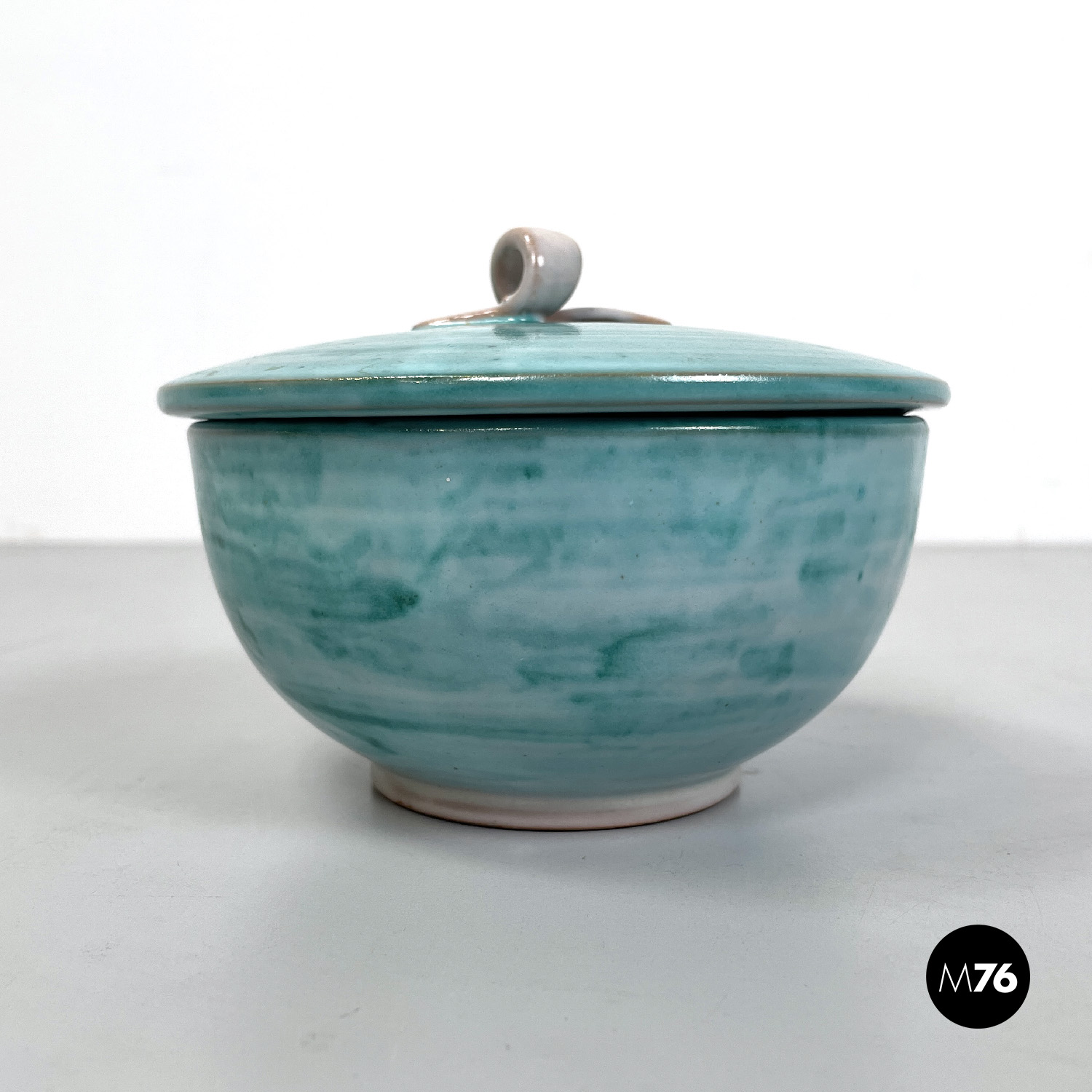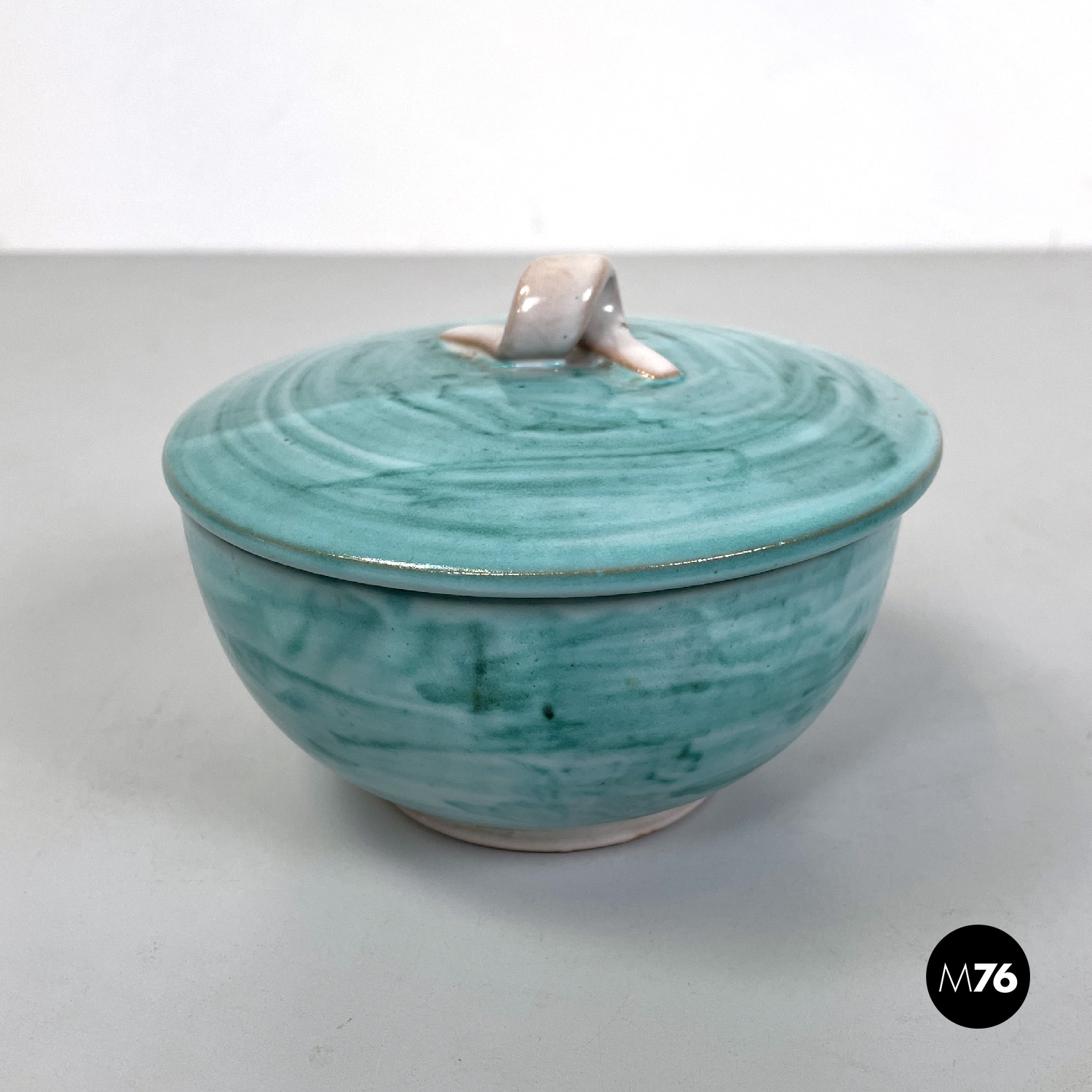 Ciotola a base tonda in ceramica. Presenta una smaltatura sui toni del celeste e dell’azzurro all’esterno e beige all’interno. Sul tappo di trova un elemento a forma di laccio annodato che fa da maniglia, ed è della stessa finitura di colore dell’interno della ciotola.