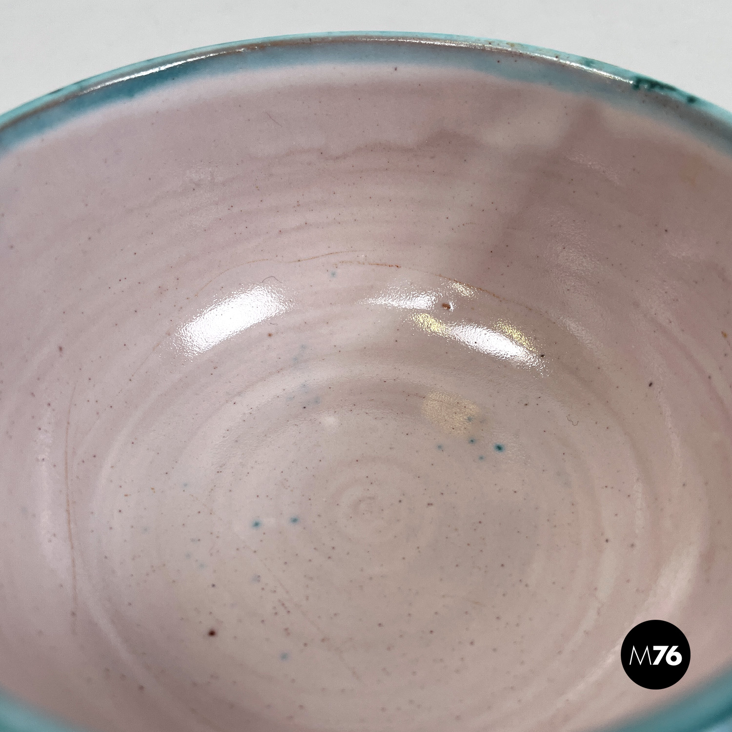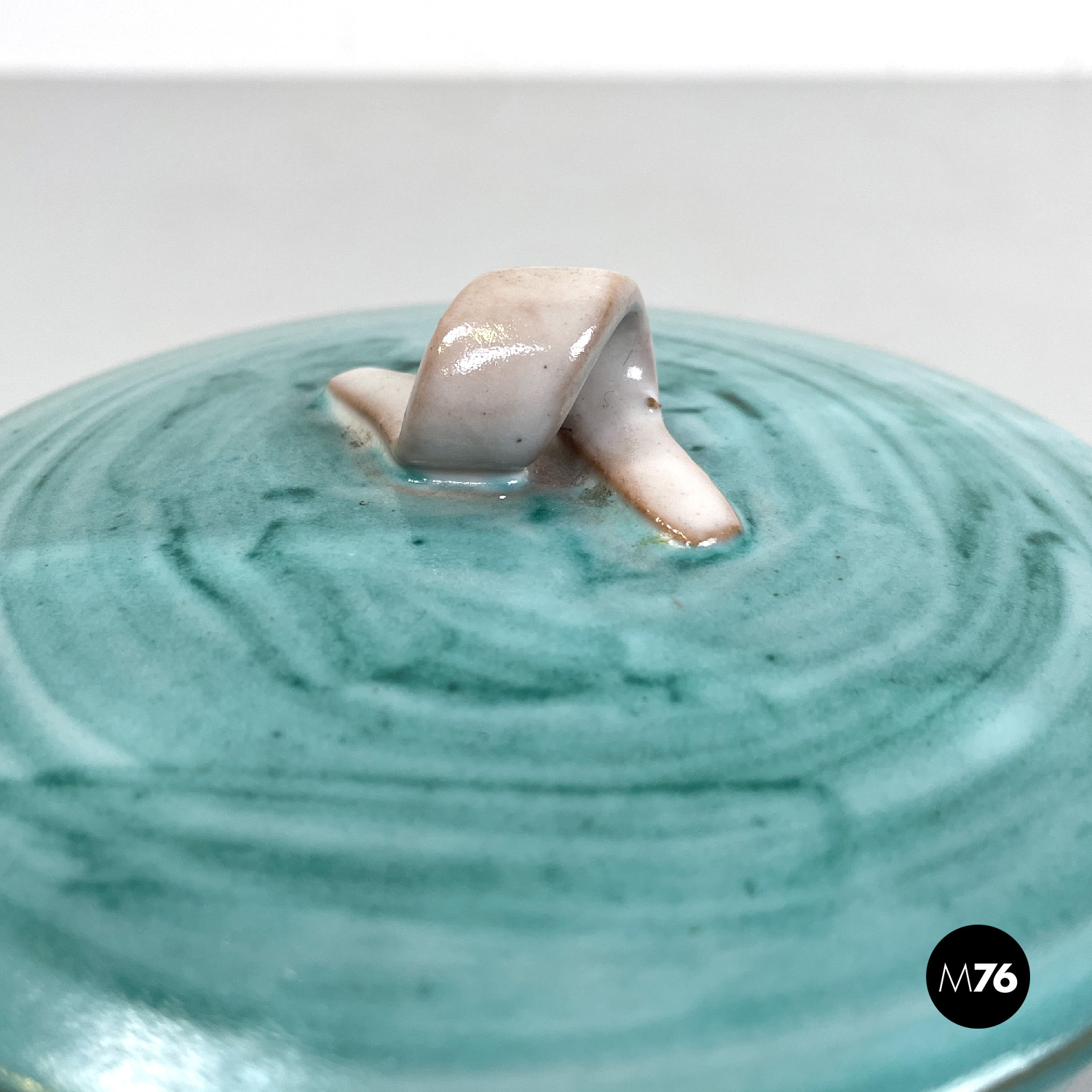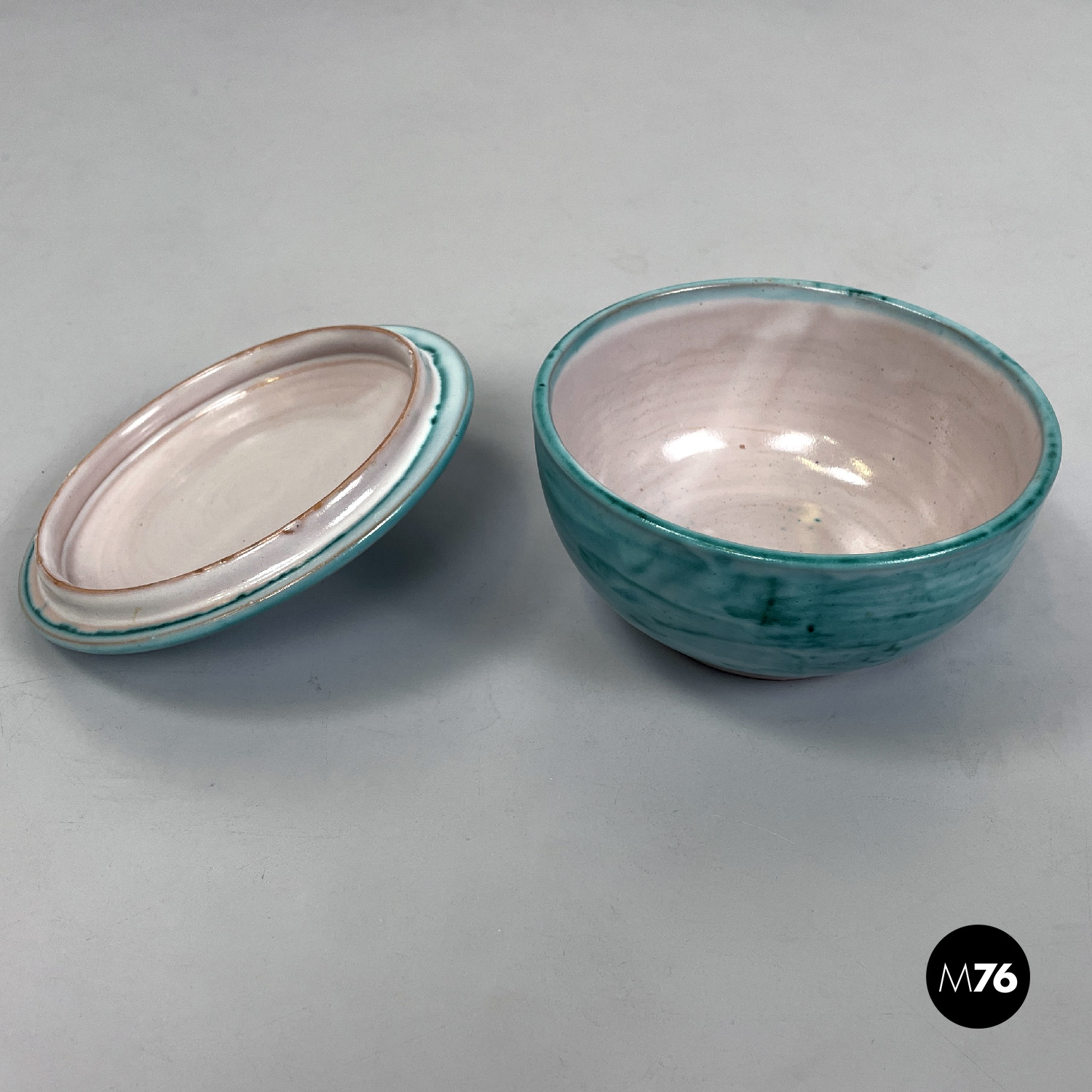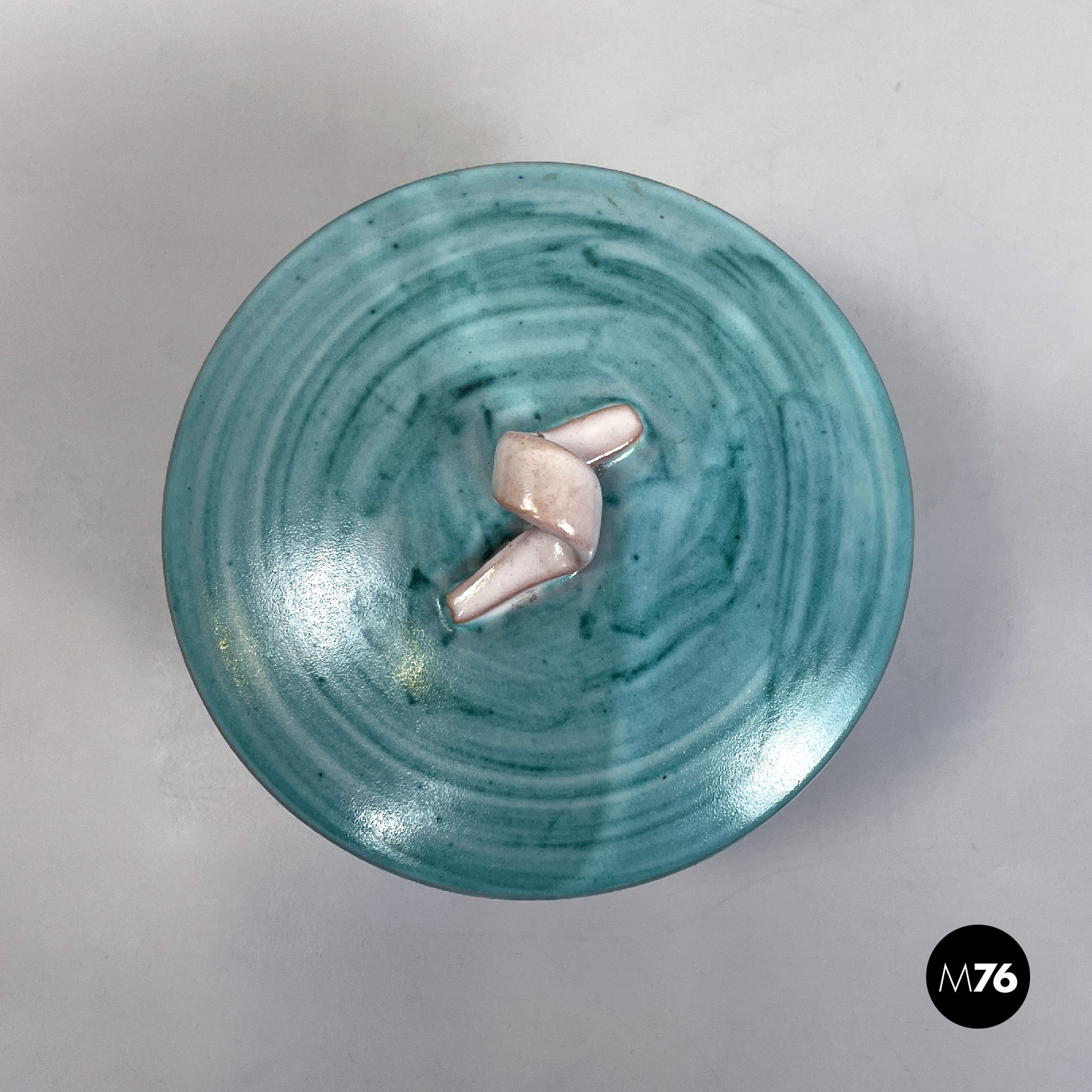 Ciotola a base tonda in ceramica. Presenta una smaltatura sui toni del celeste e dell’azzurro all’esterno e beige all’interno. Sul tappo di trova un elemento a forma di laccio annodato che fa da maniglia, ed è della stessa finitura di colore dell’interno della ciotola.