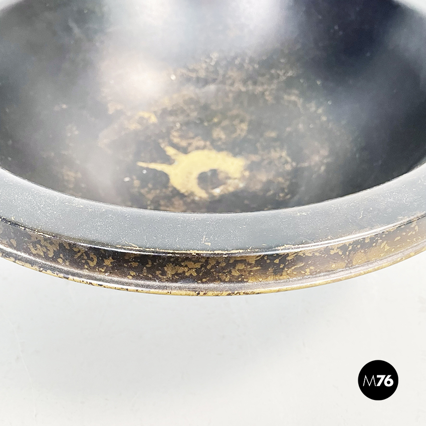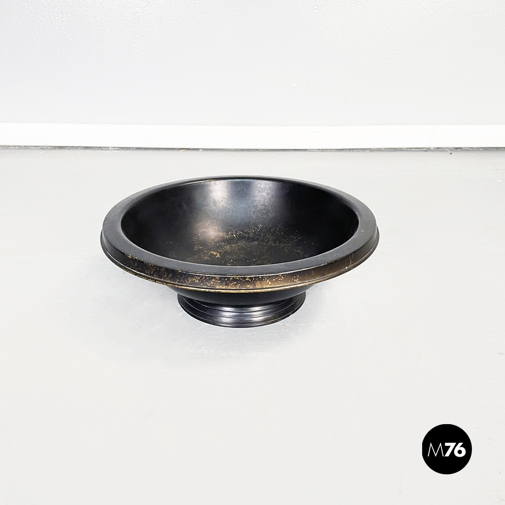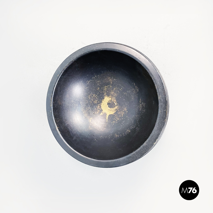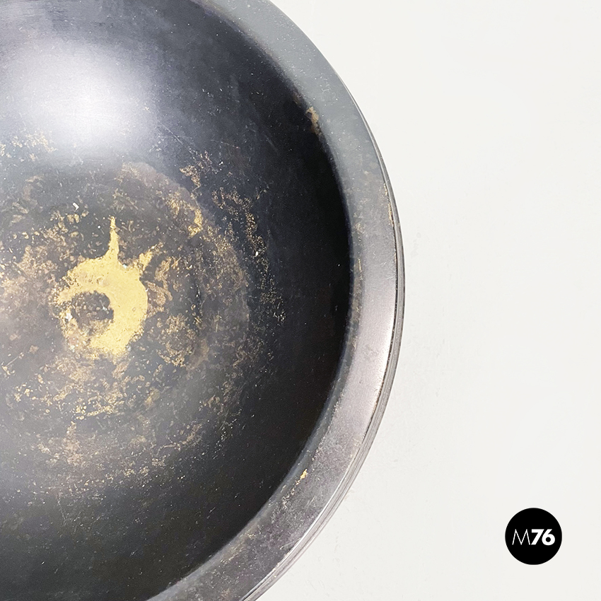 Ciotola tonda in metallo verniciato nero. La parte centrale composta da una semisfera con profilo sporgente, poggiata sulla base tonda. Utilizzabile come centrotavola.