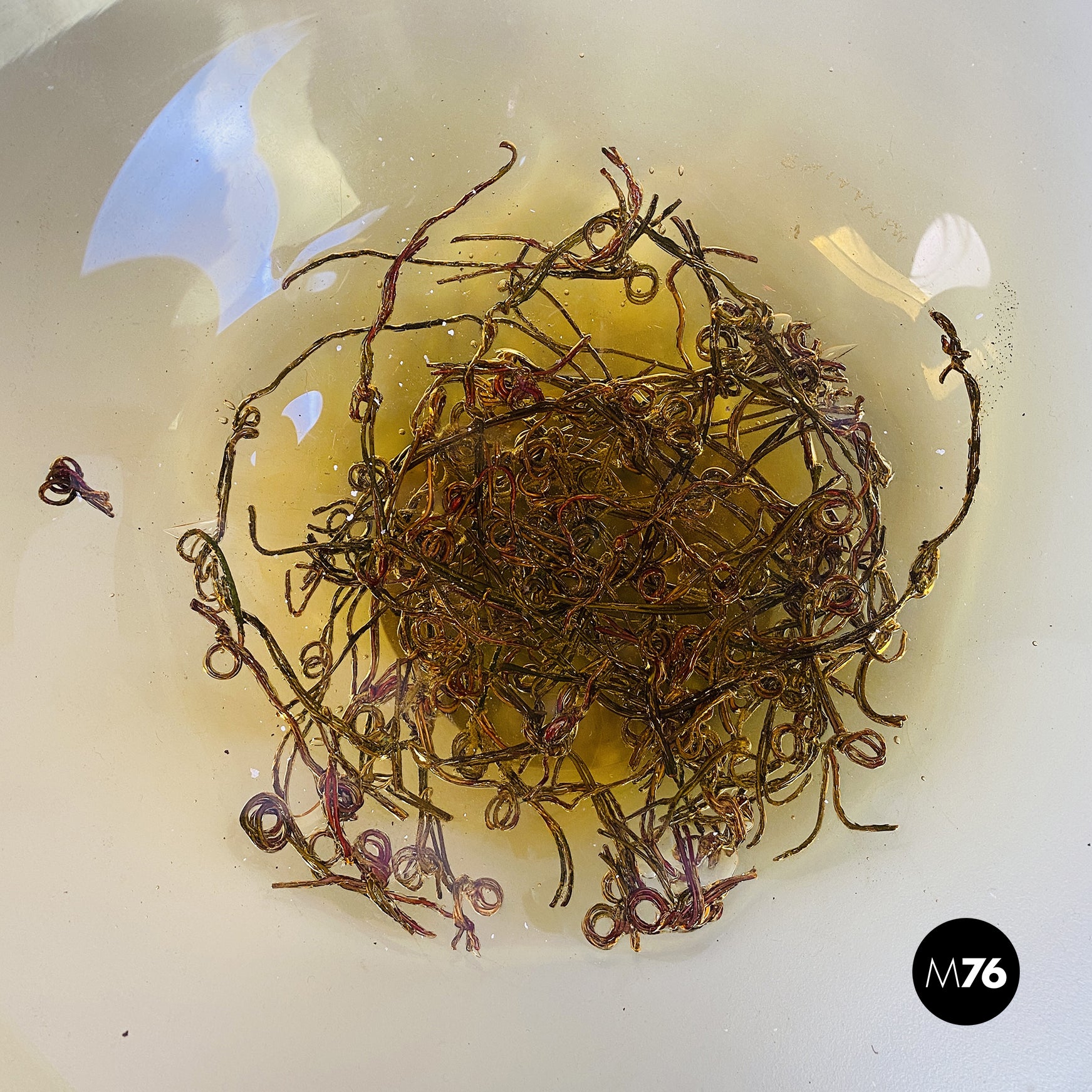 Ciotola dalla forma irregolare in vetro di Murano giallo con decorazione in metallo inglobata all’interno del vetro.