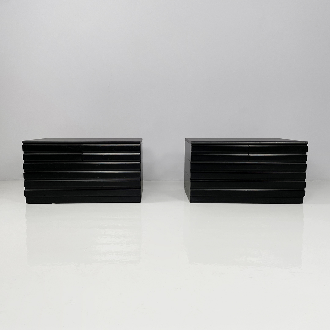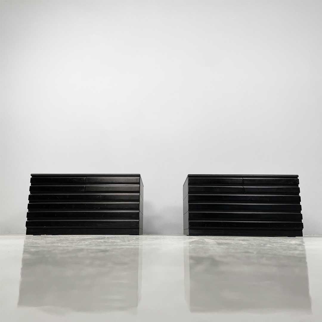 Coppia di comodini con cassetti in legno. Il piano ad angoli arrotondati è in pelle nera.
