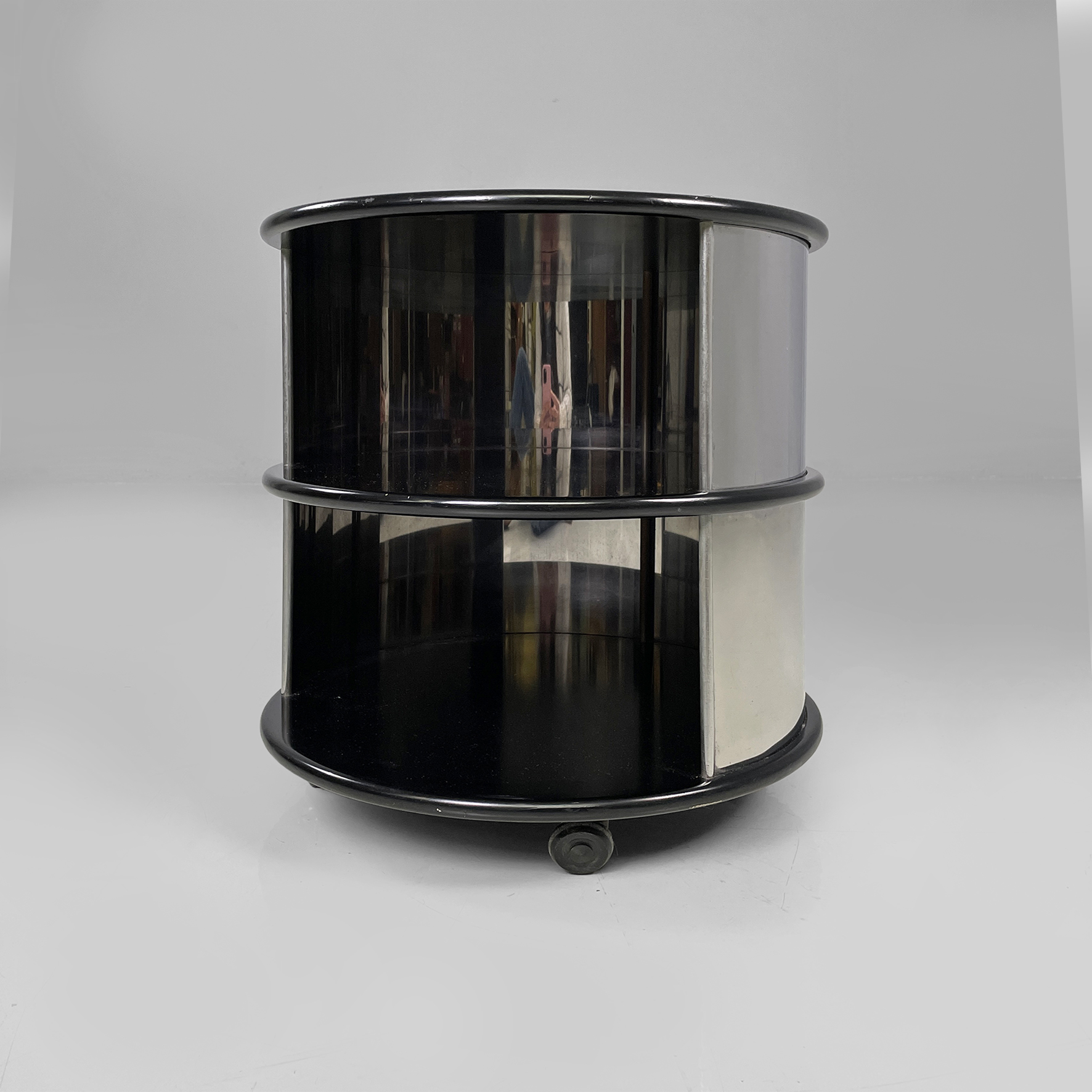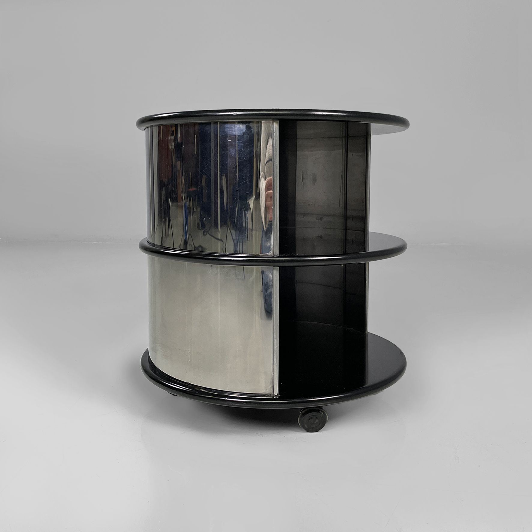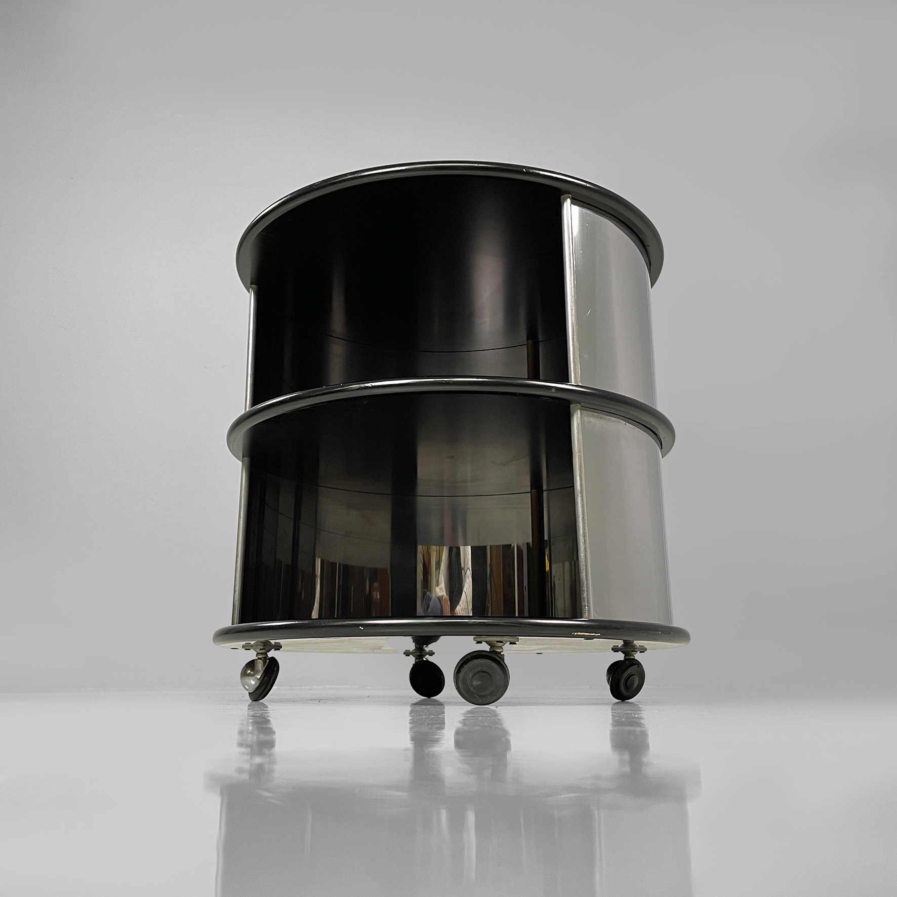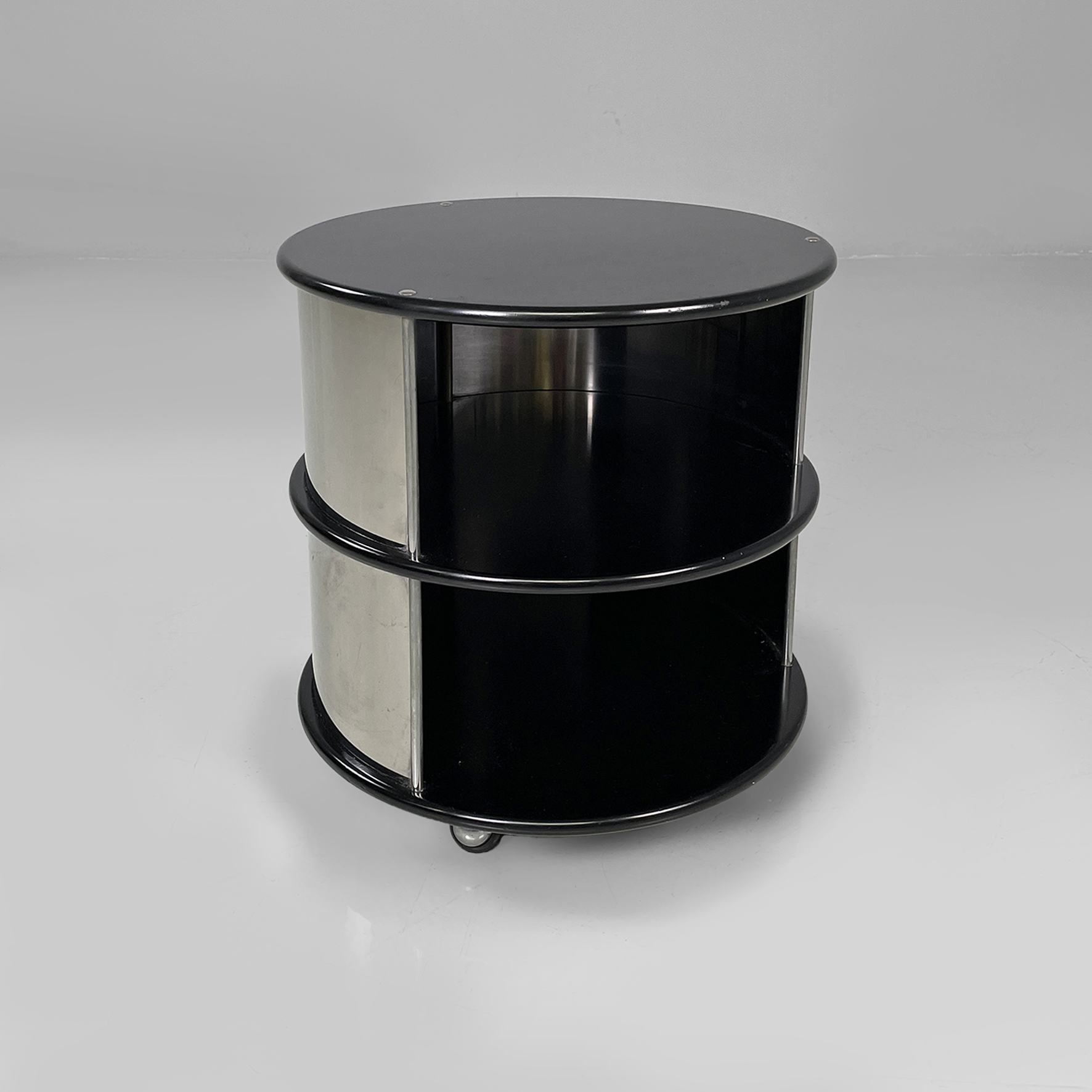 Comodino o tavolo da caffè in metallo e legno con ruote. La struttura cilindrica è in acciaio mentre i ripiani sono in legno laccato nero. Il corpo è suddiviso in due vani contenitivi.