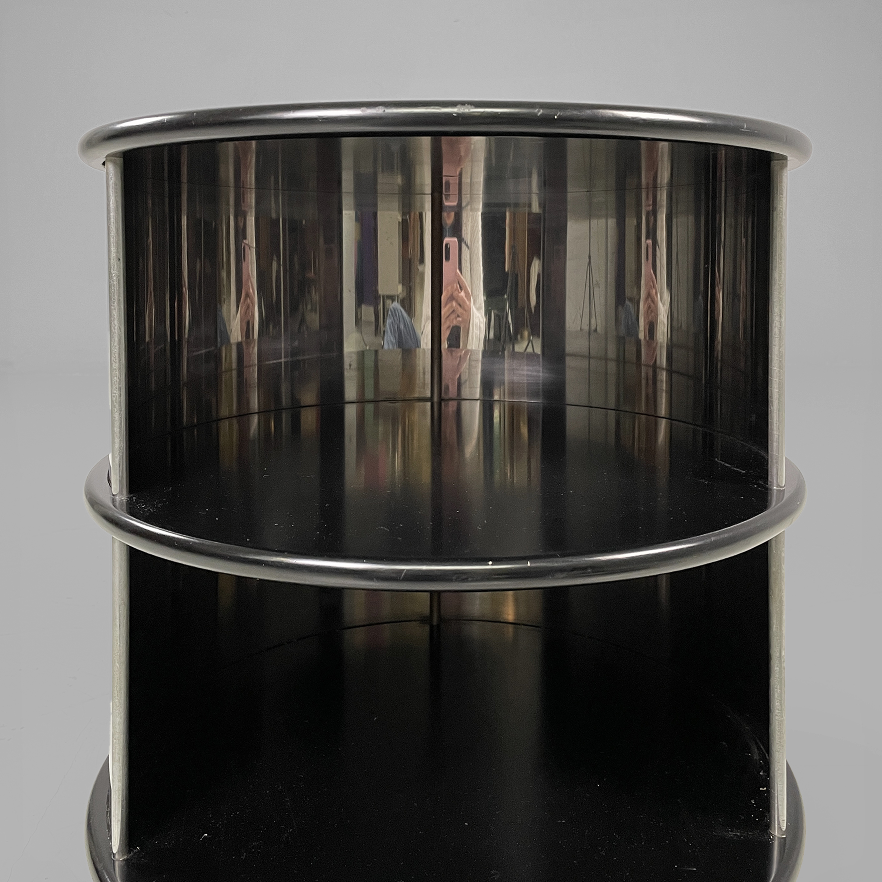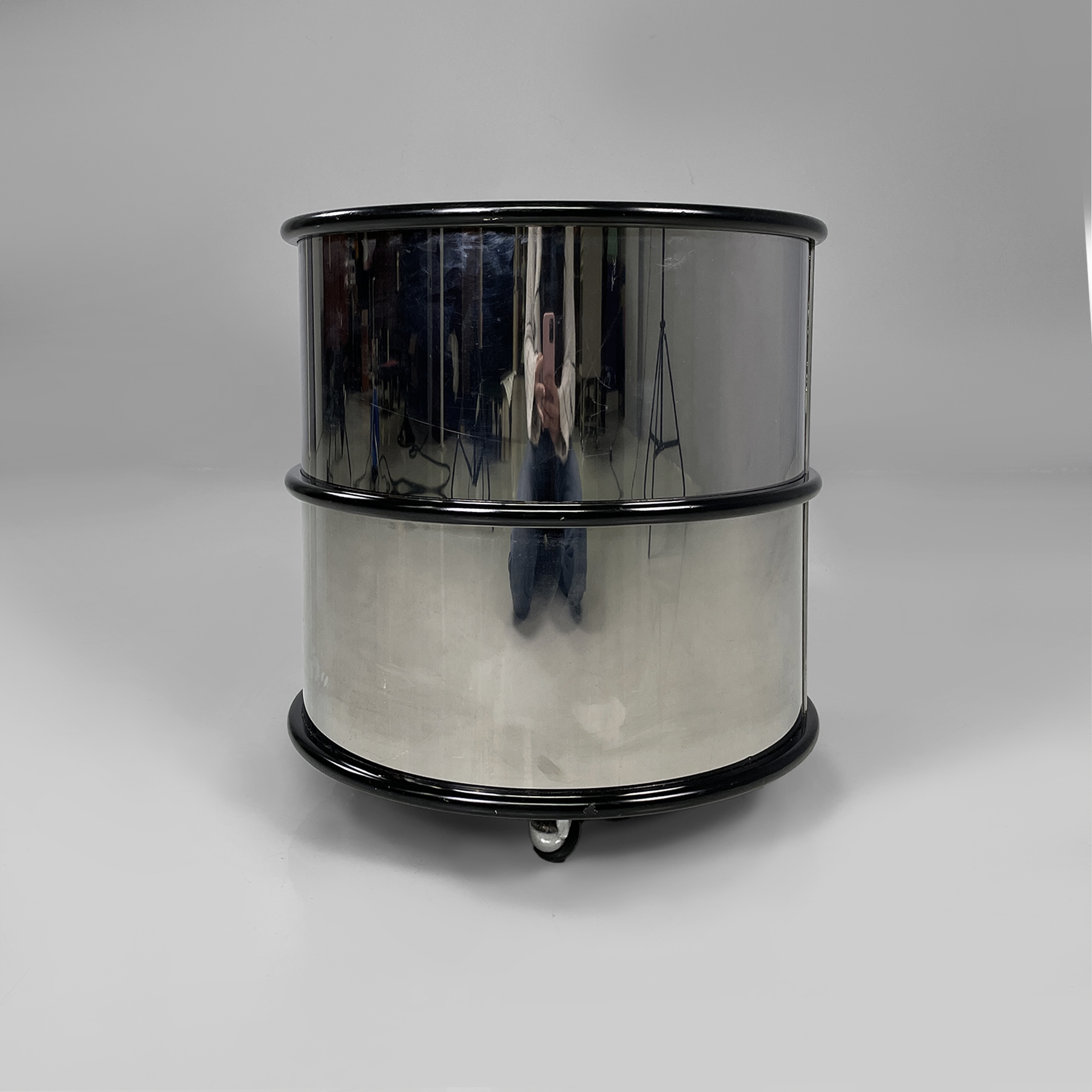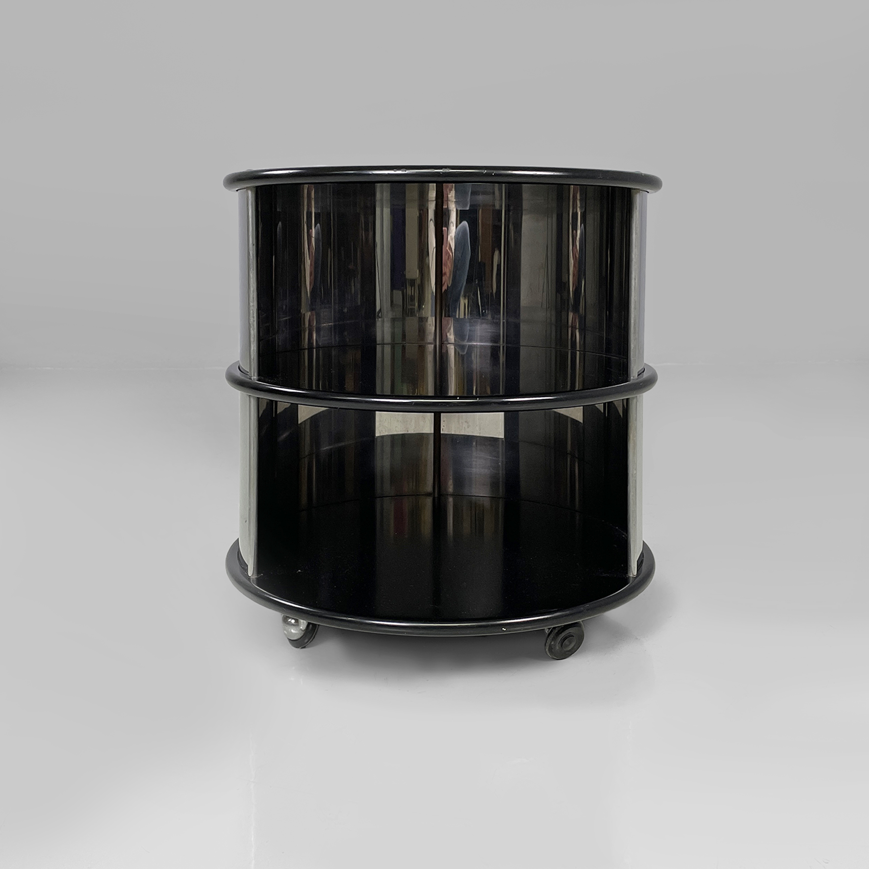 Comodino o tavolo da caffè in metallo e legno con ruote. La struttura cilindrica è in acciaio mentre i ripiani sono in legno laccato nero. Il corpo è suddiviso in due vani contenitivi.