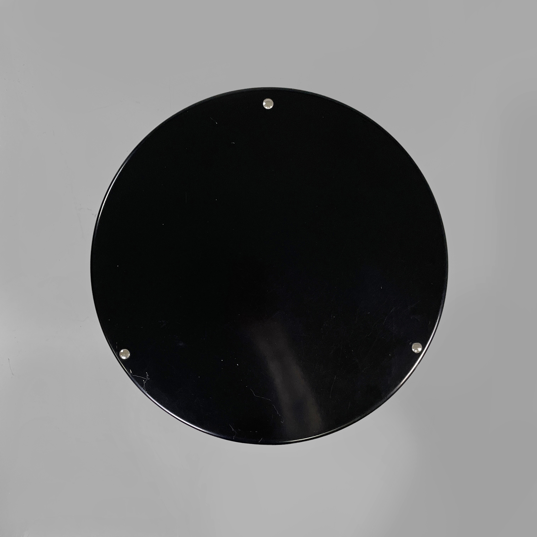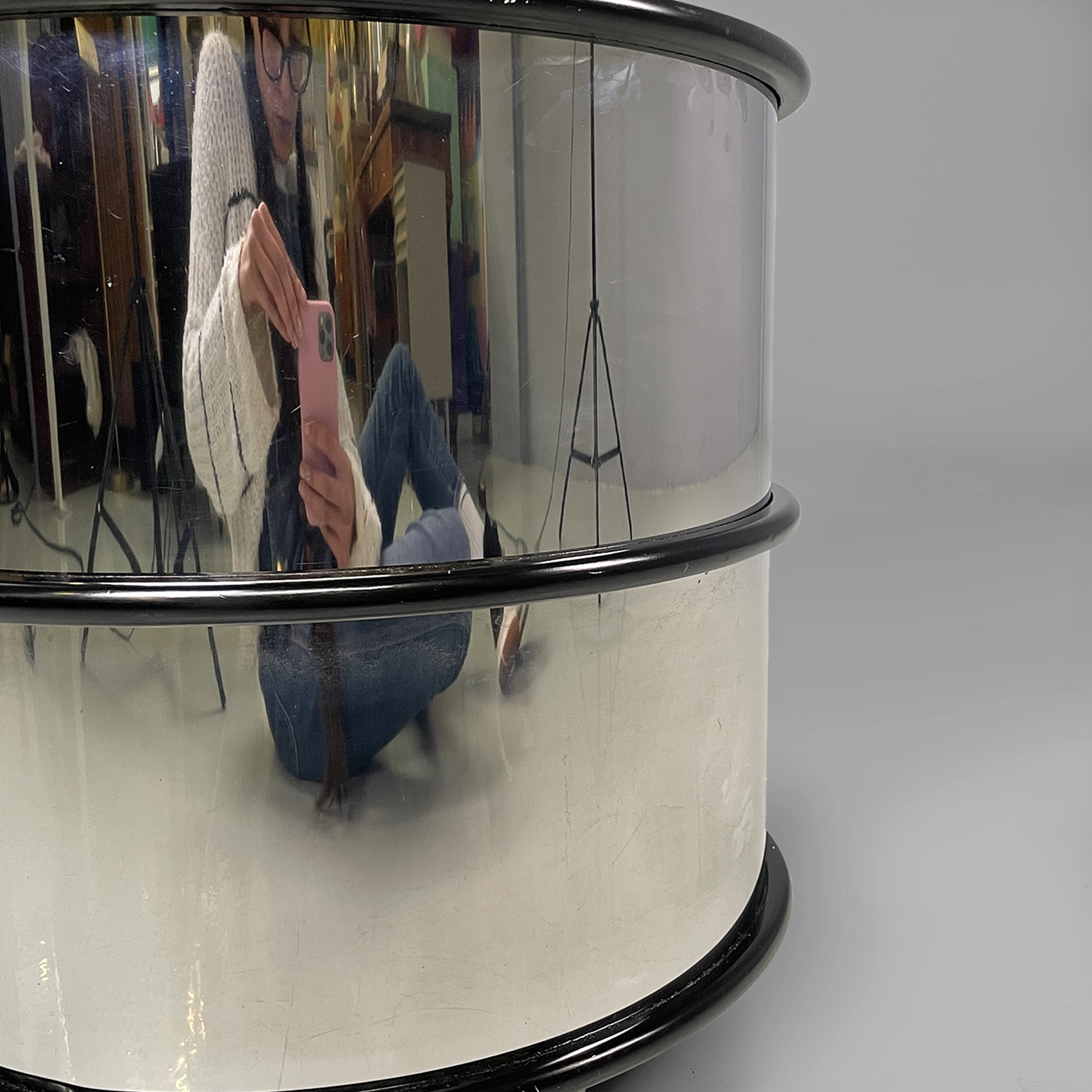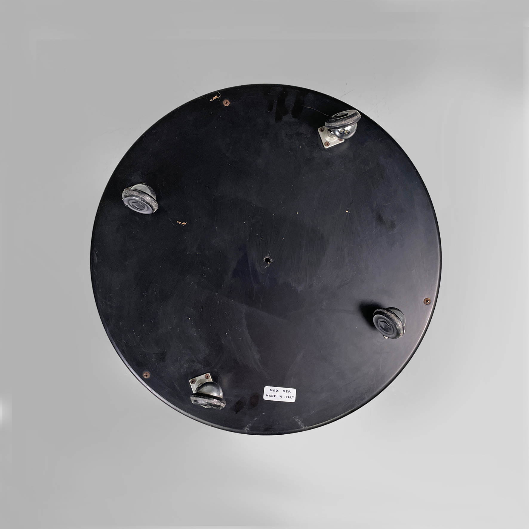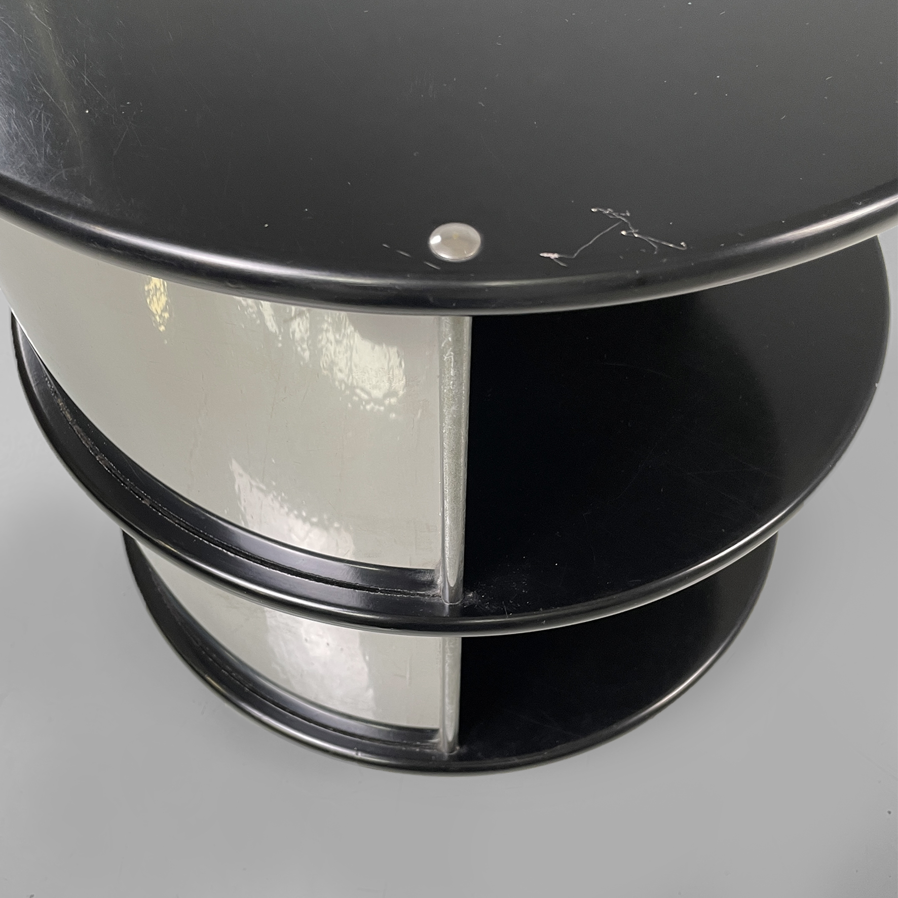 Comodino o tavolo da caffè in metallo e legno con ruote. La struttura cilindrica è in acciaio mentre i ripiani sono in legno laccato nero. Il corpo è suddiviso in due vani contenitivi.