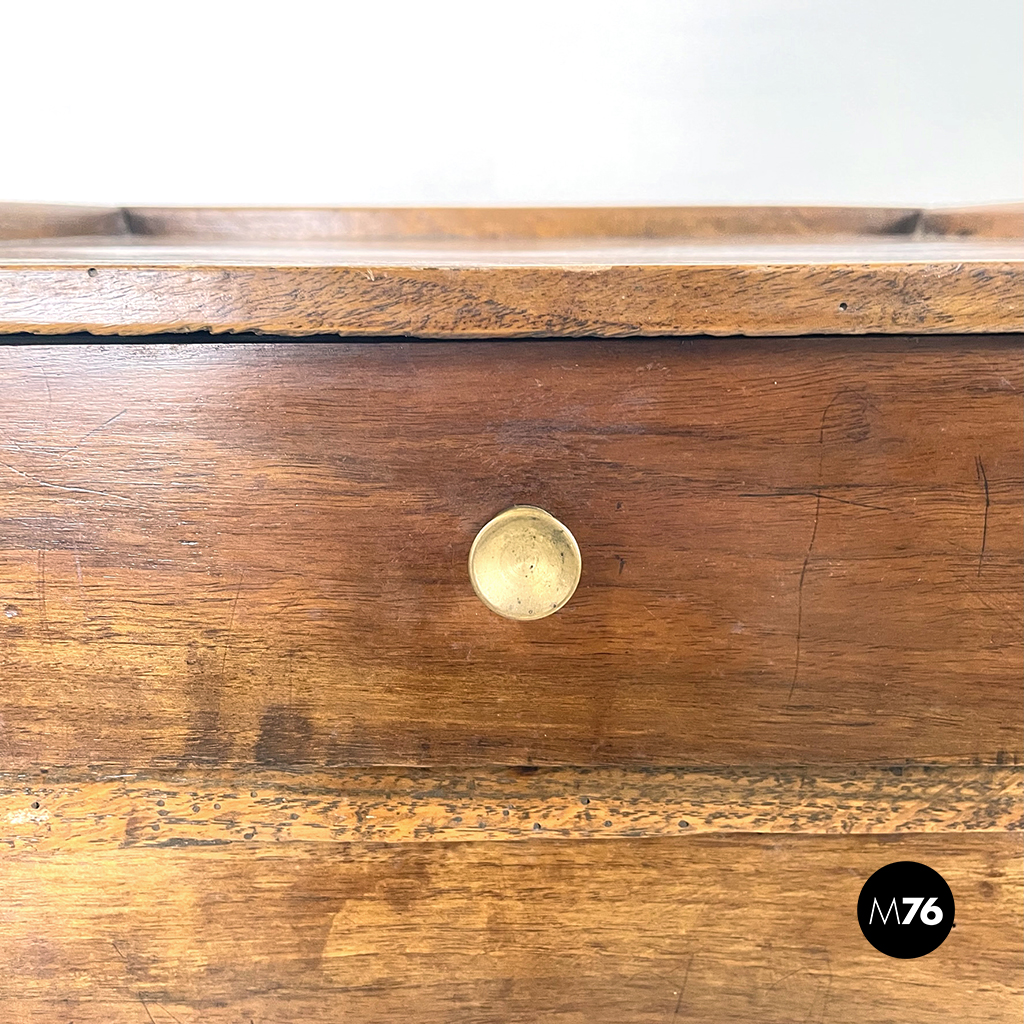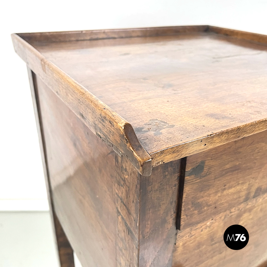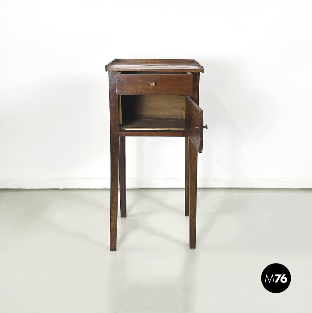 Comodino o tavolo di servizio con piano rettangolare interamente in legno massello. Sul fronte presenta un cassetto e un vano con anta a battente. Maniglie a base tonda in ottone brunito. Zampe a sezione quadrata.