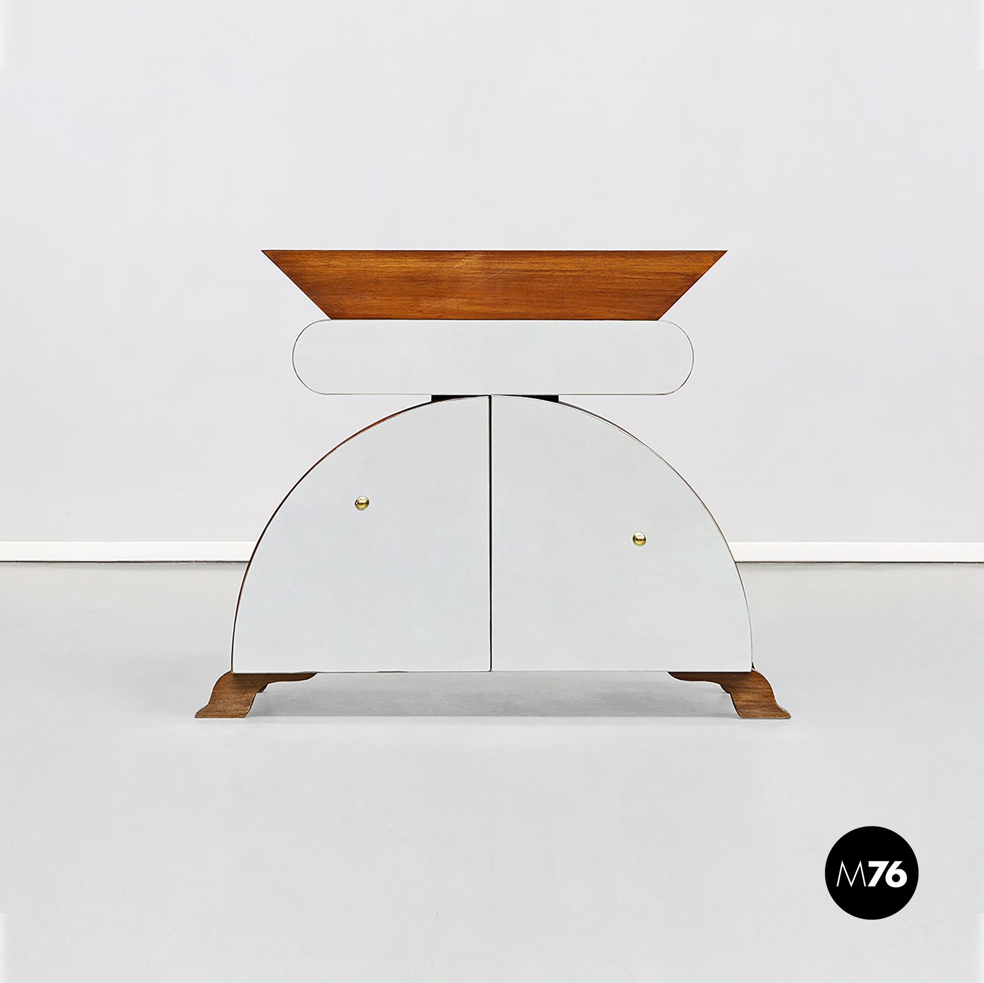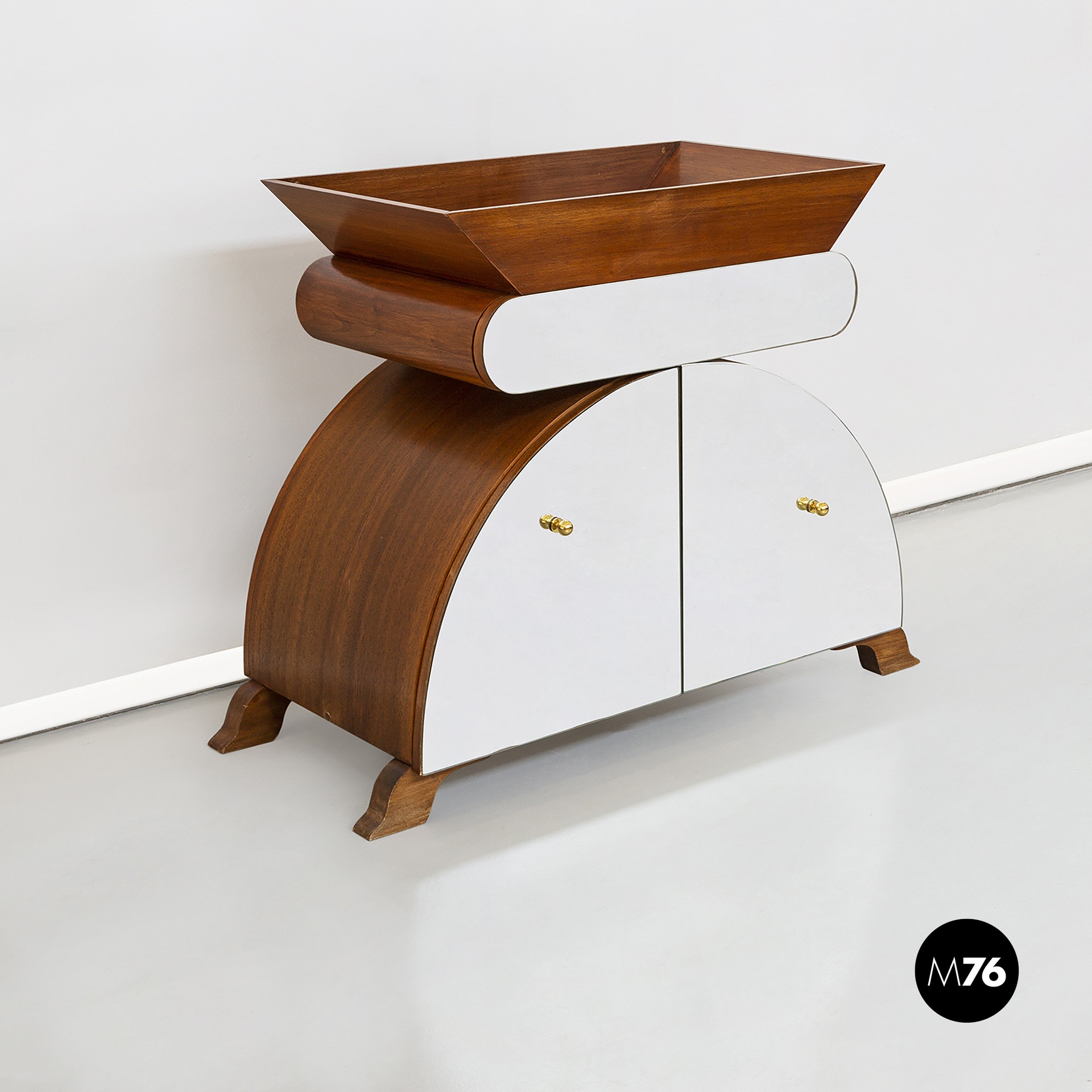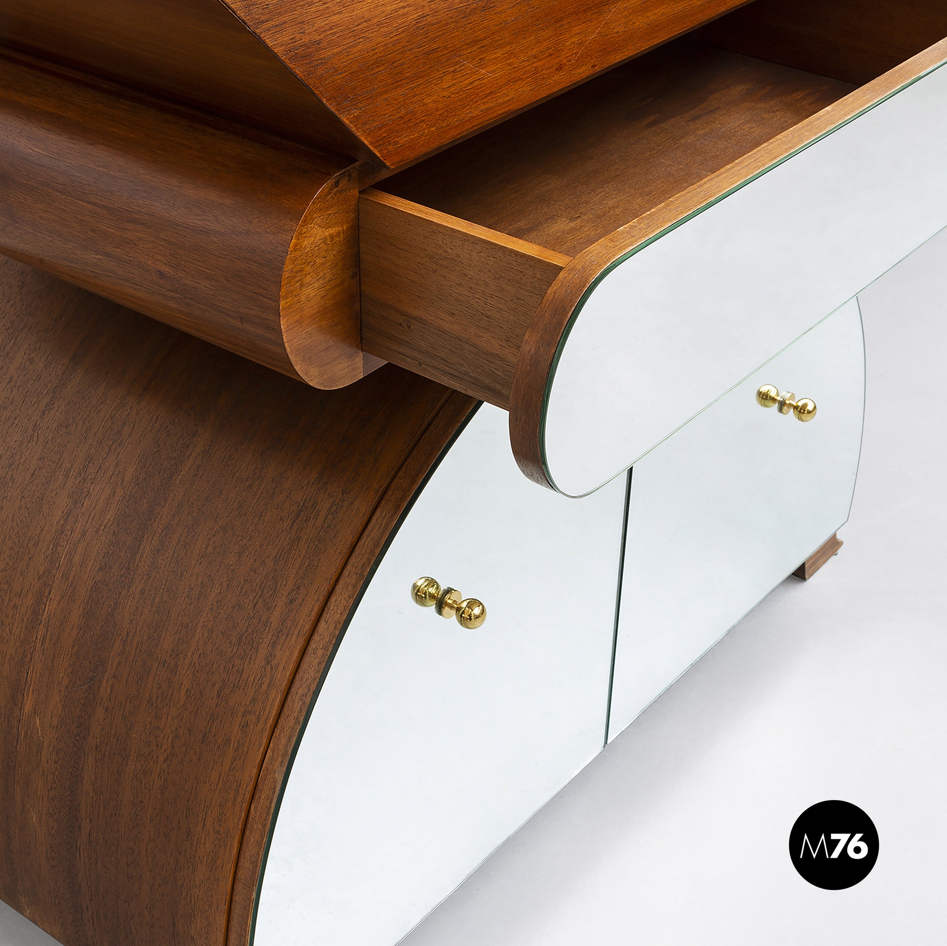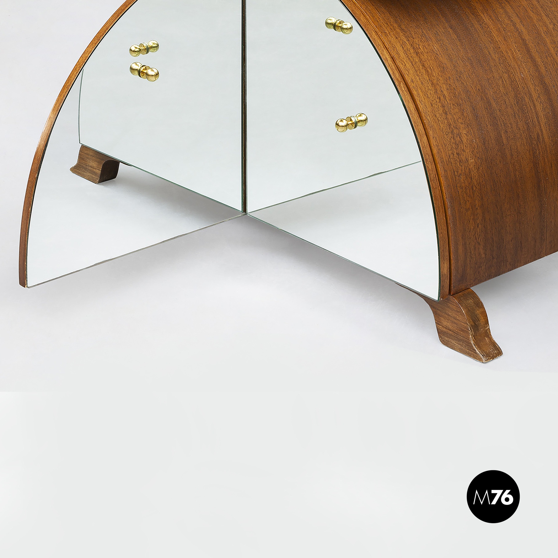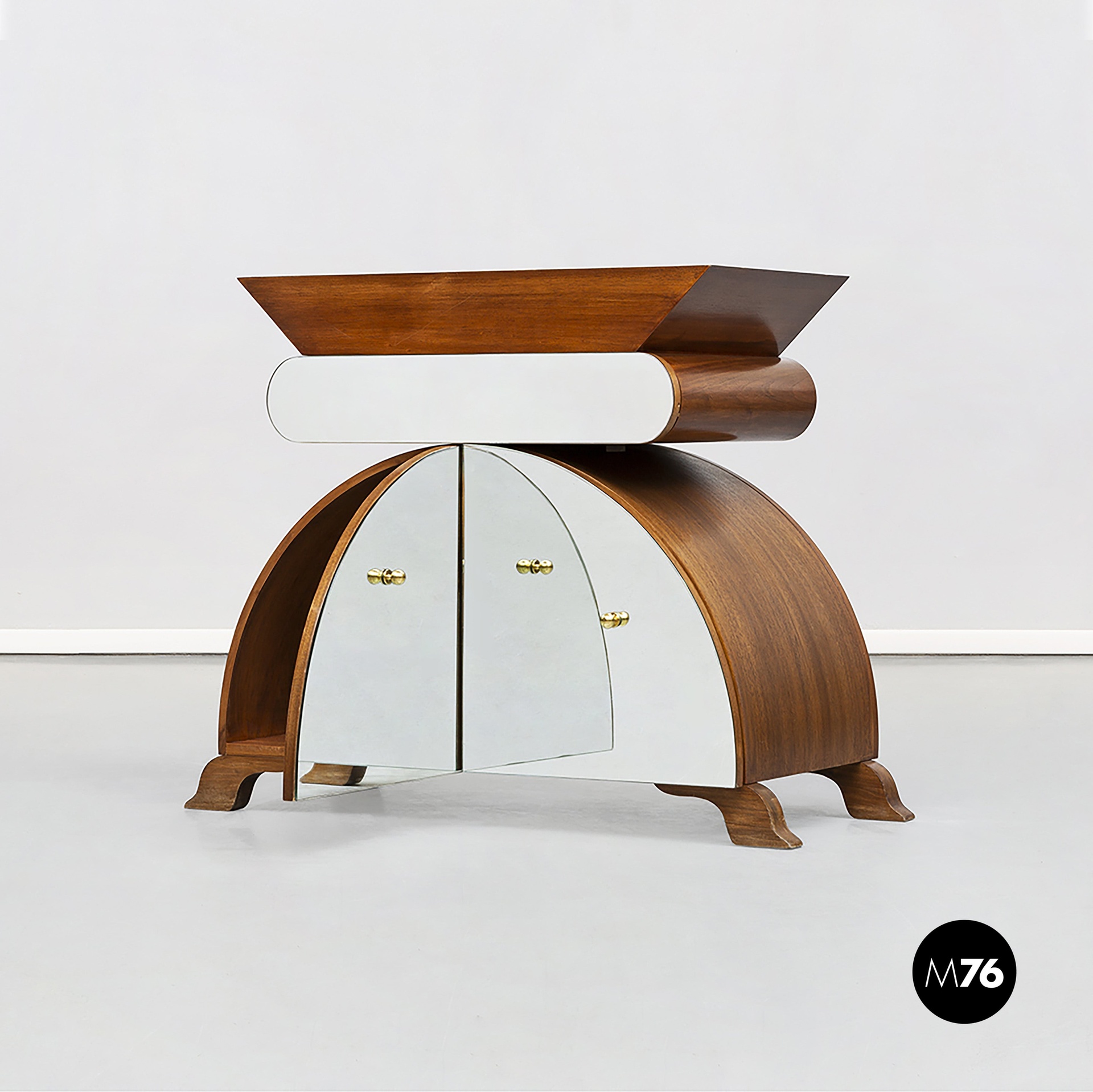Consolle in legno curvato e agglomerato impiallacciato noce, con cassetto centrale e due ante battenti a specchio con maniglie asimmetriche.