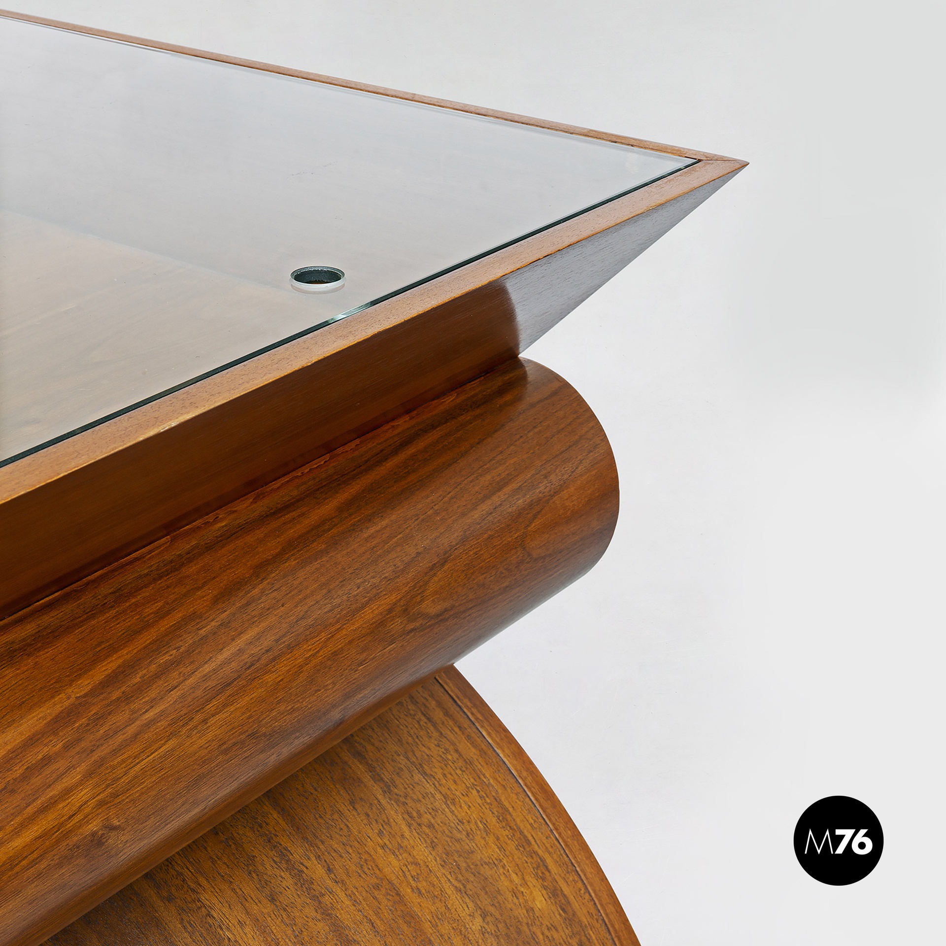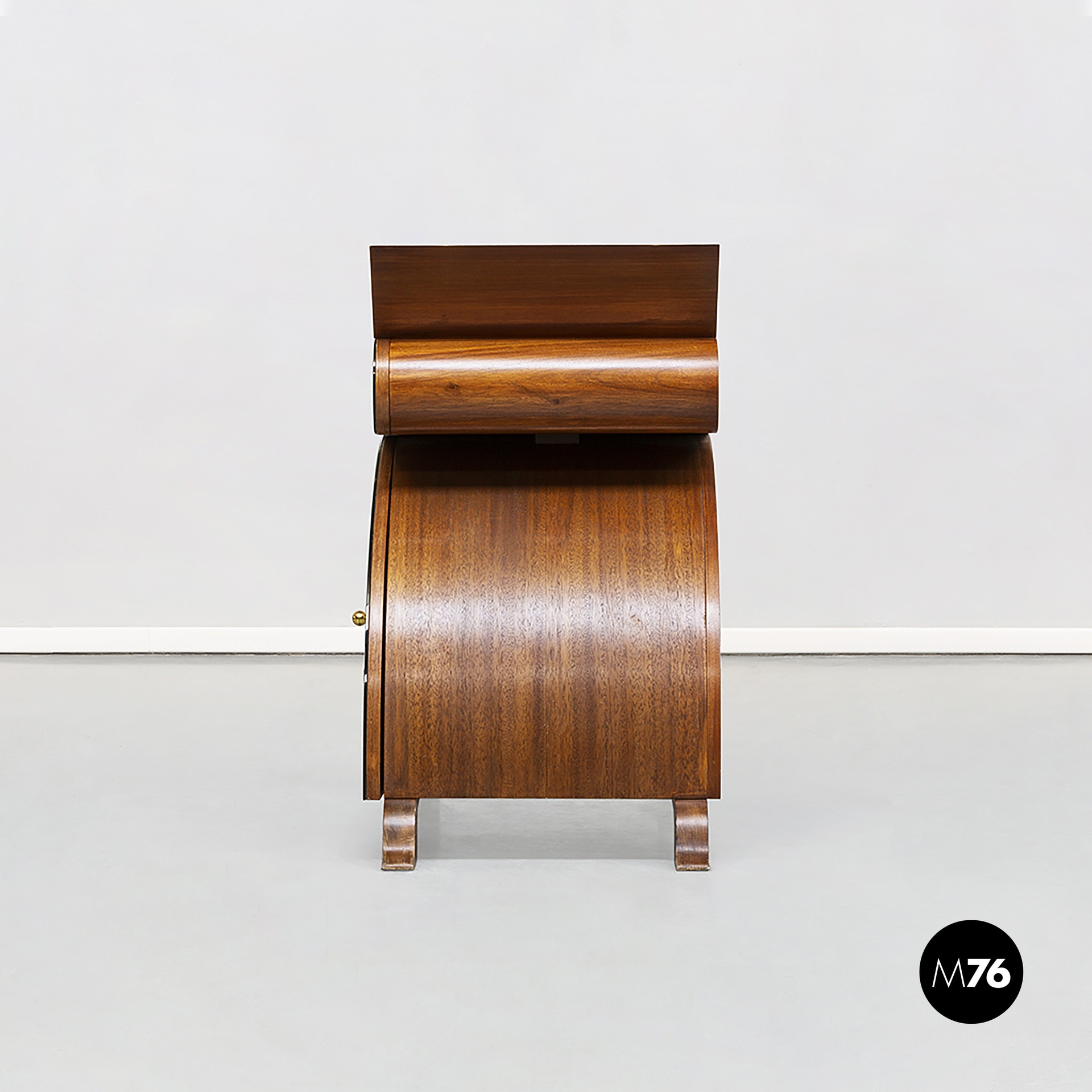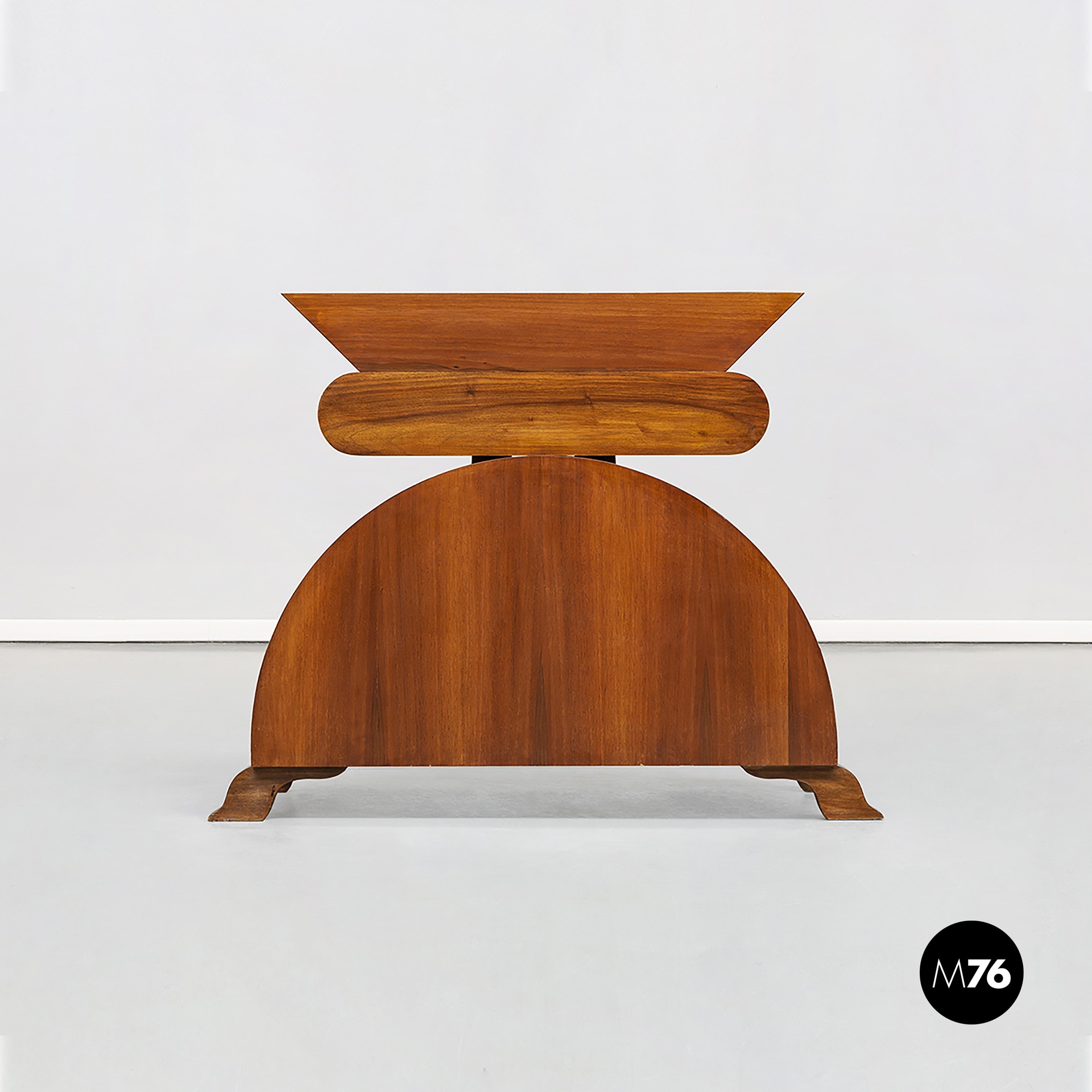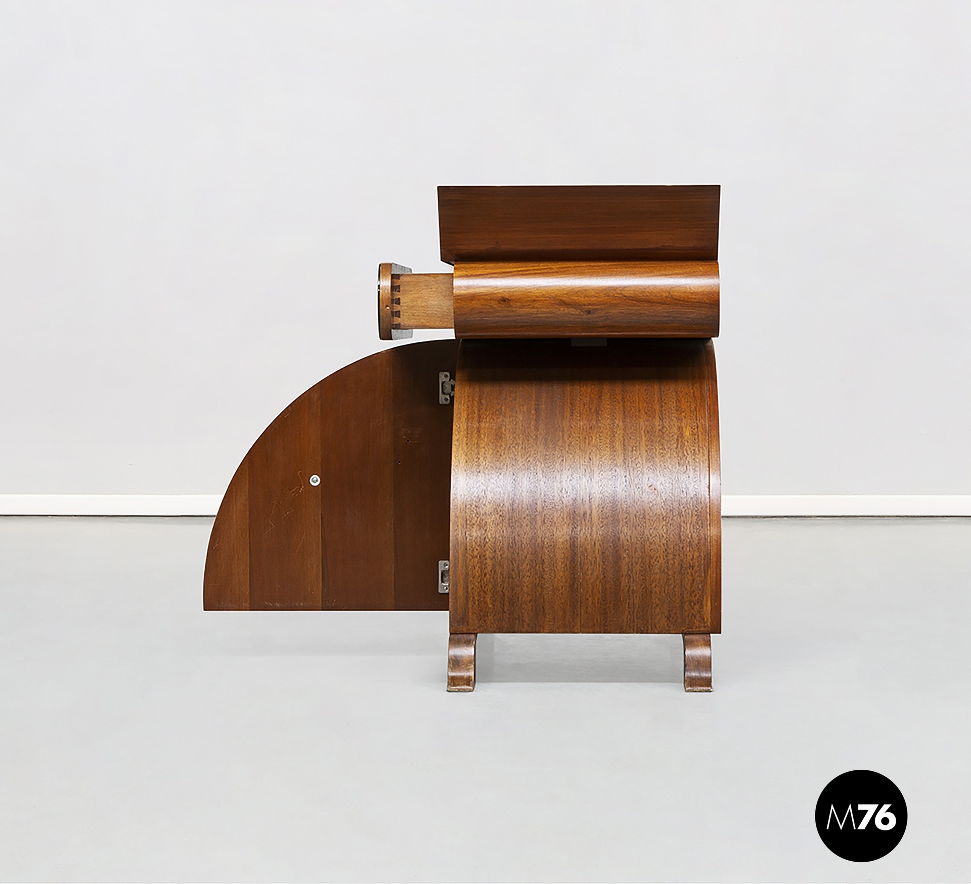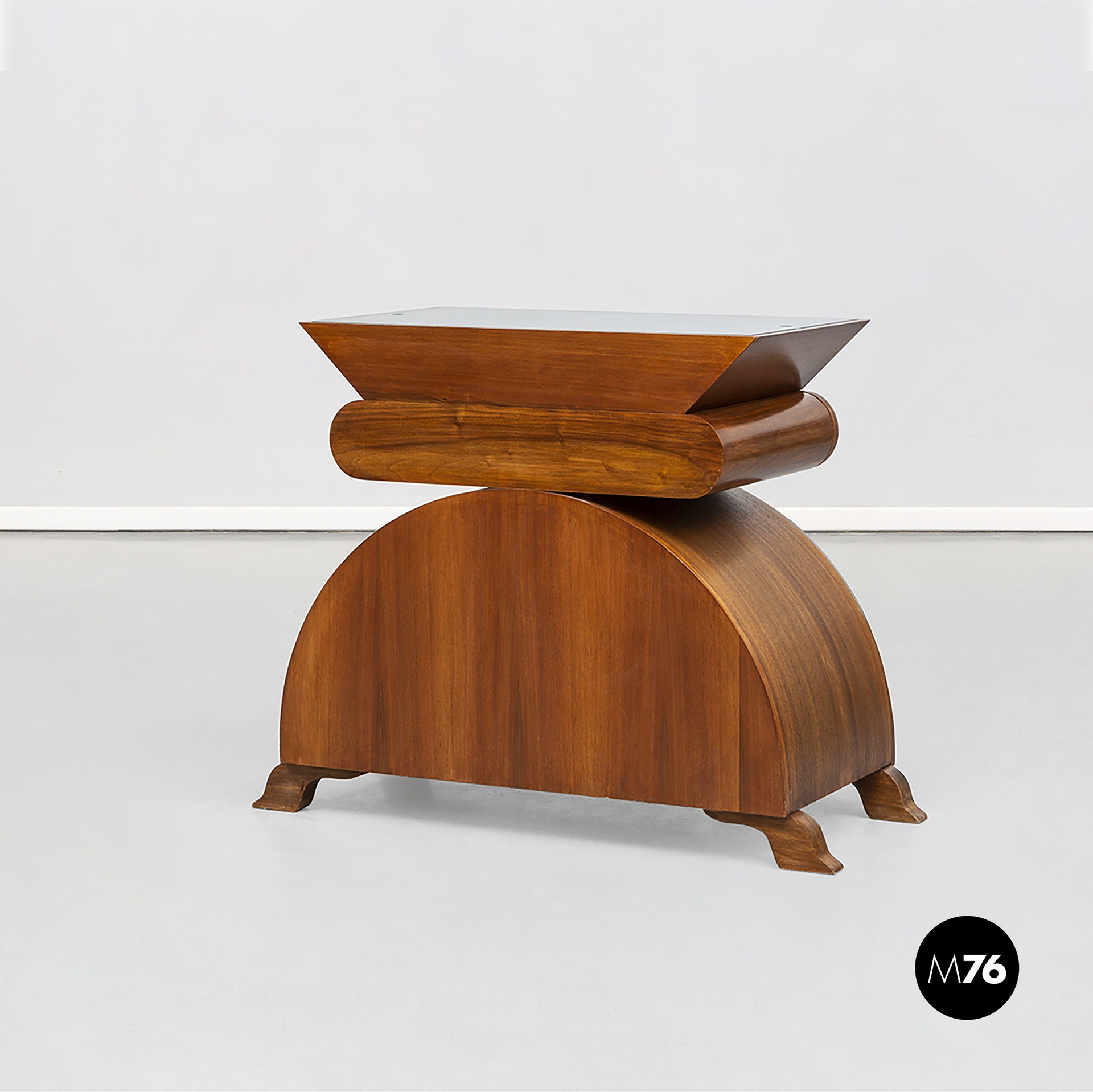 Consolle in legno curvato e agglomerato impiallacciato noce, con cassetto centrale e due ante battenti a specchio con maniglie asimmetriche.