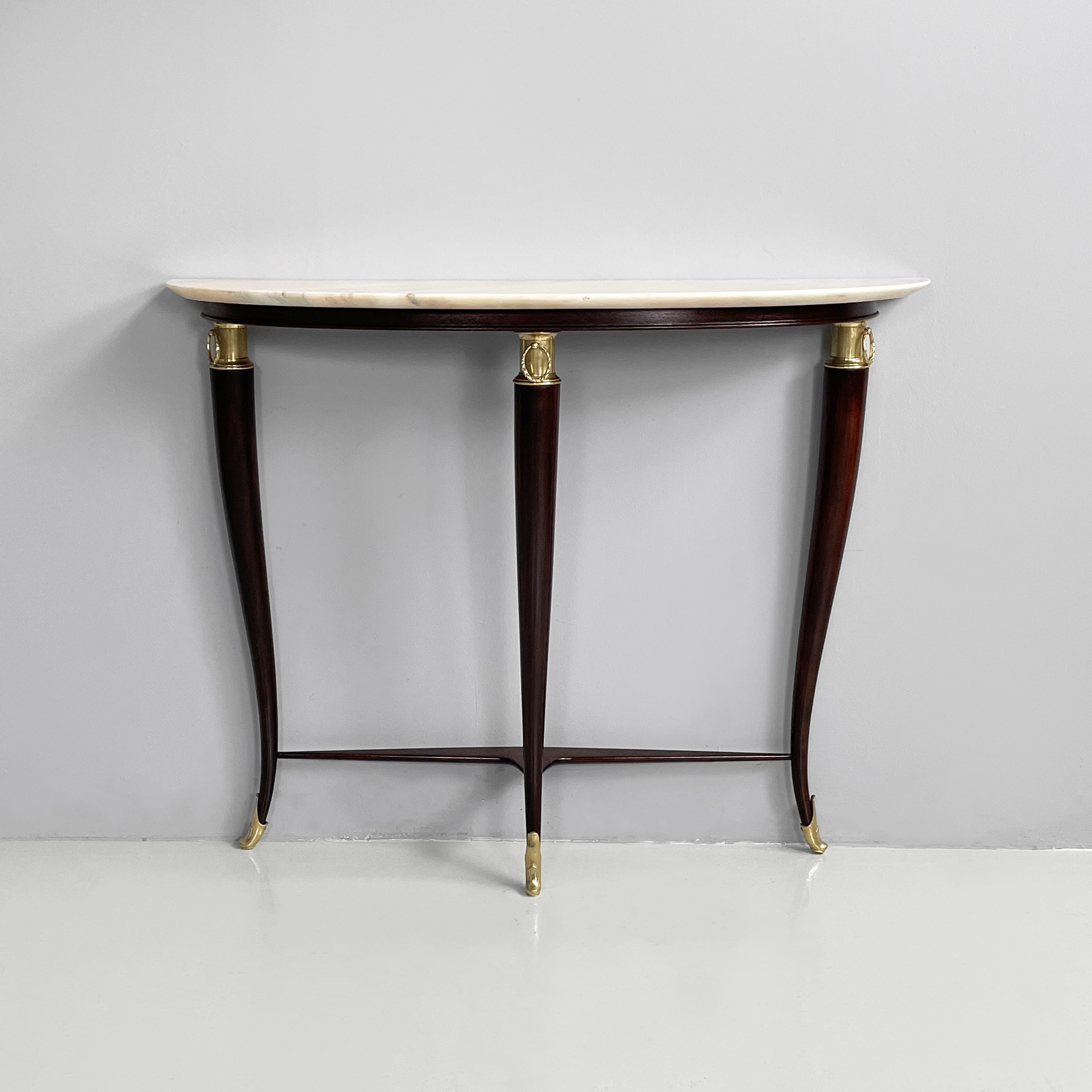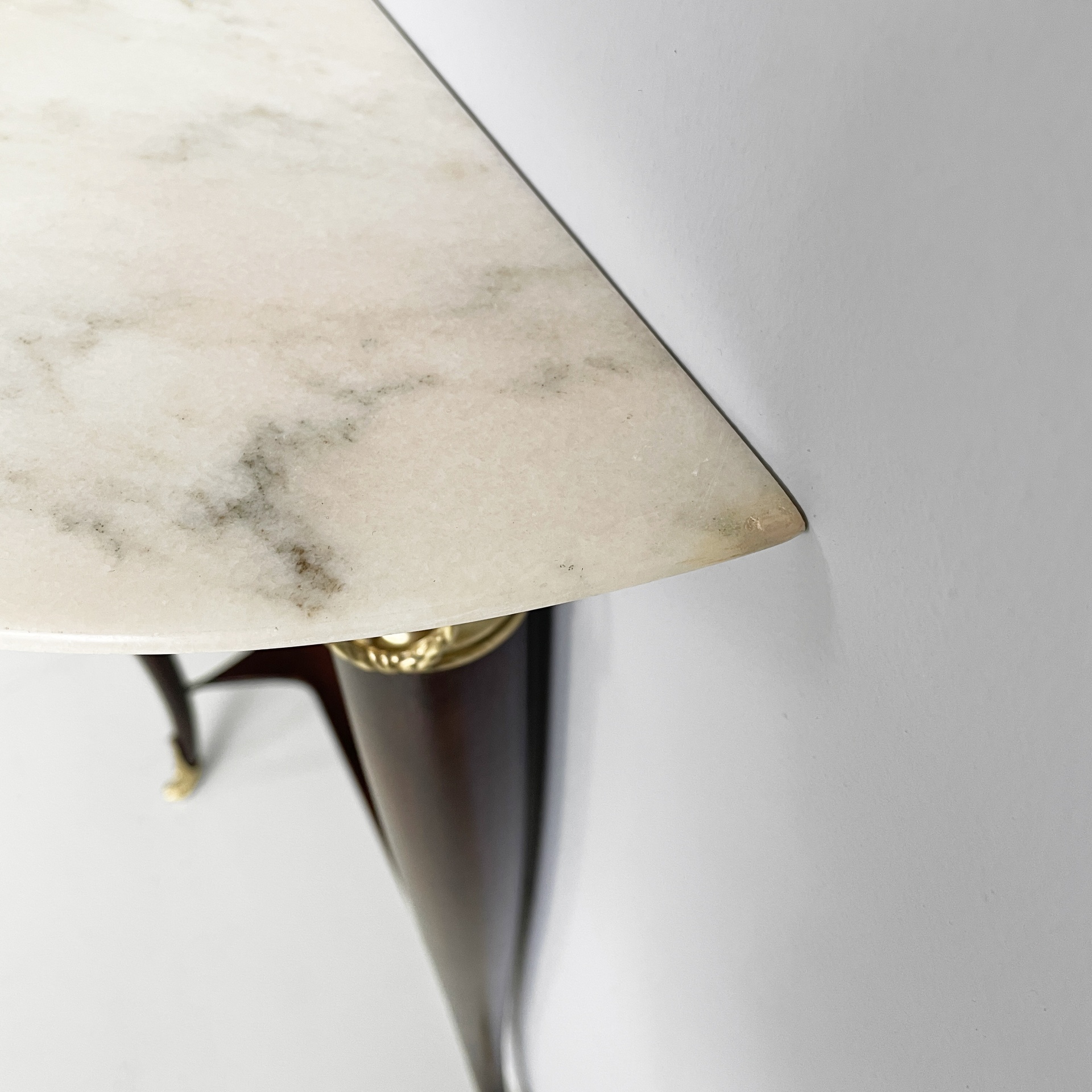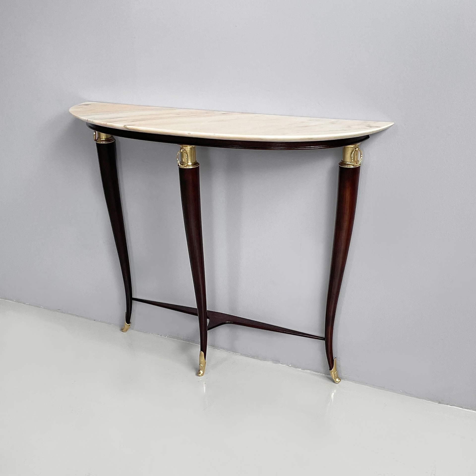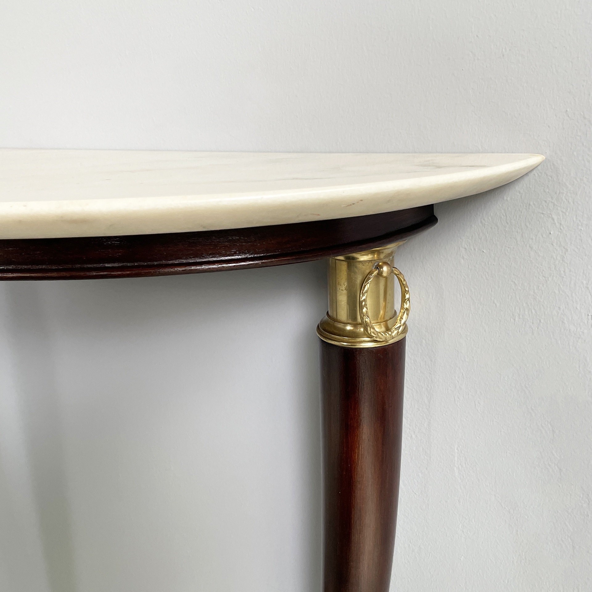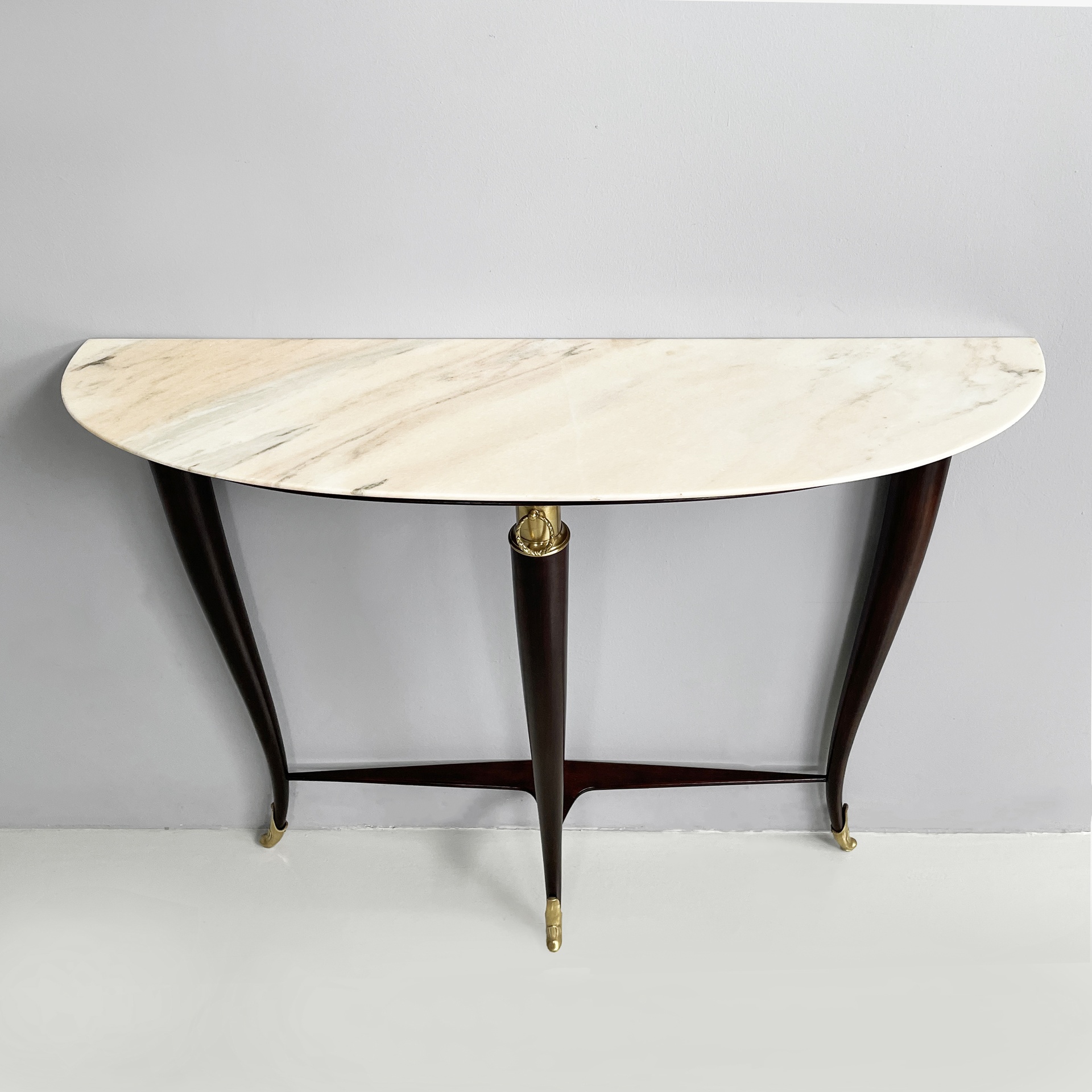Consolle da parete con piano semitondo in marmo bianco-rosa. La struttura a tre zampe è in legno scuro con dettagli e piedini in ottone lavorato.