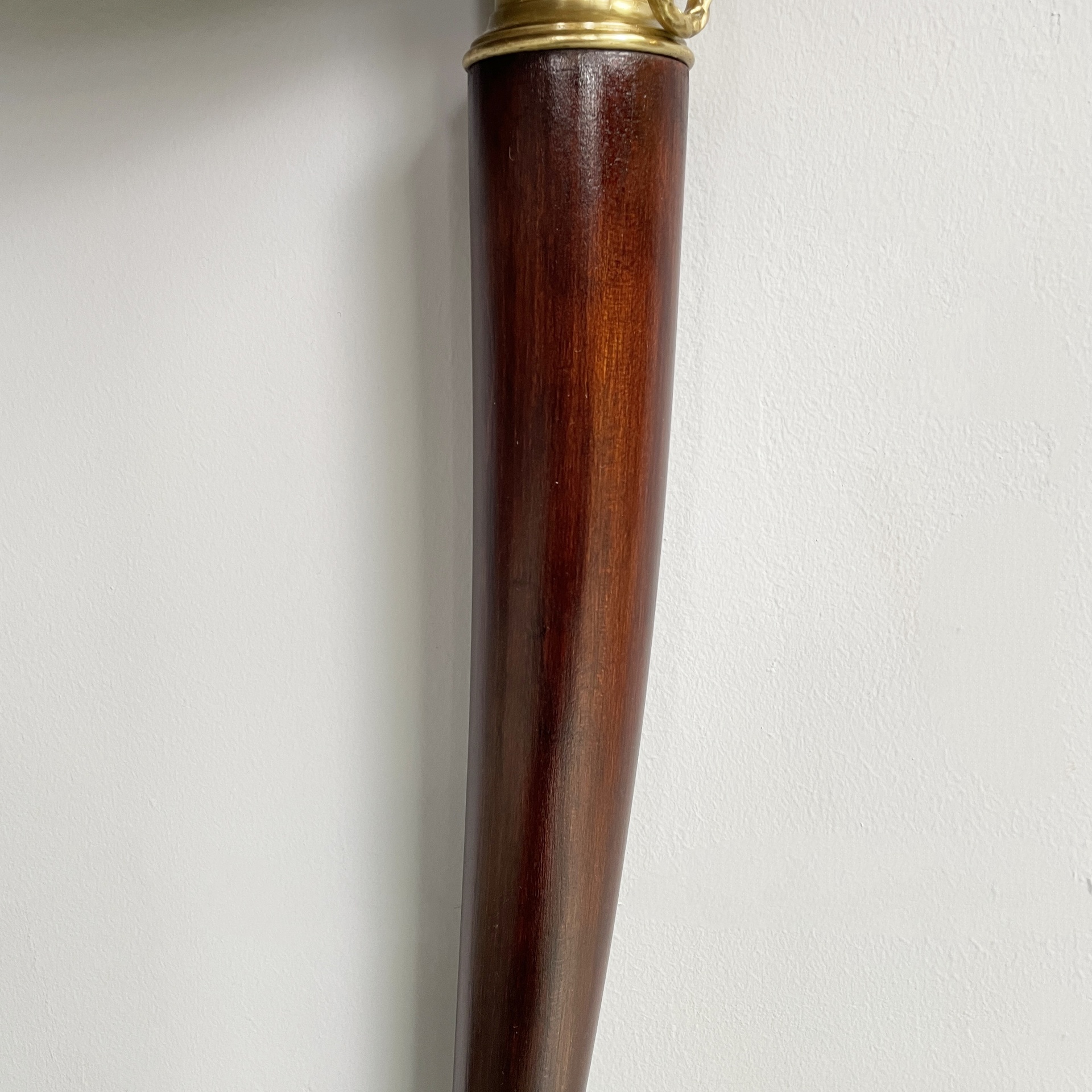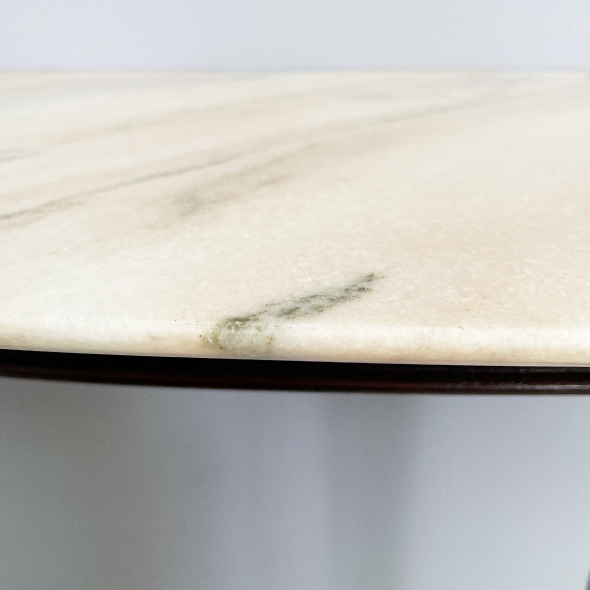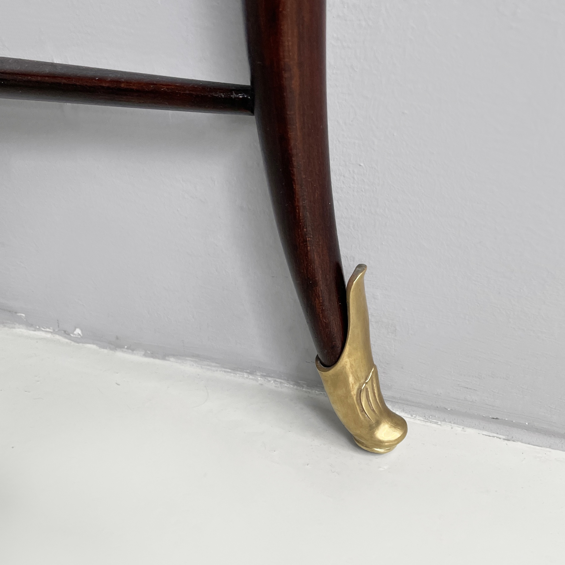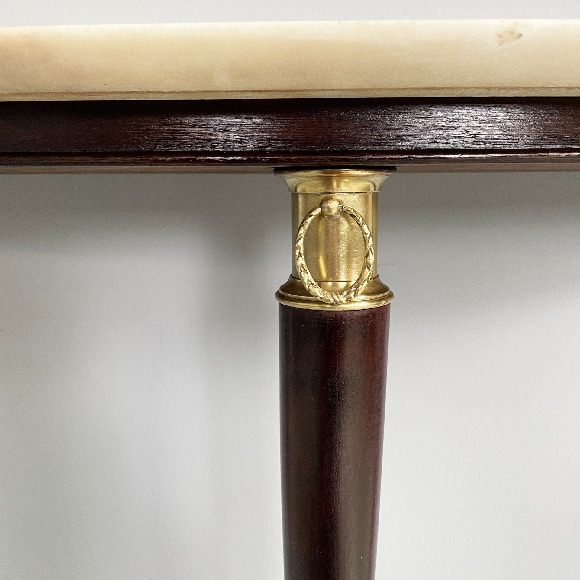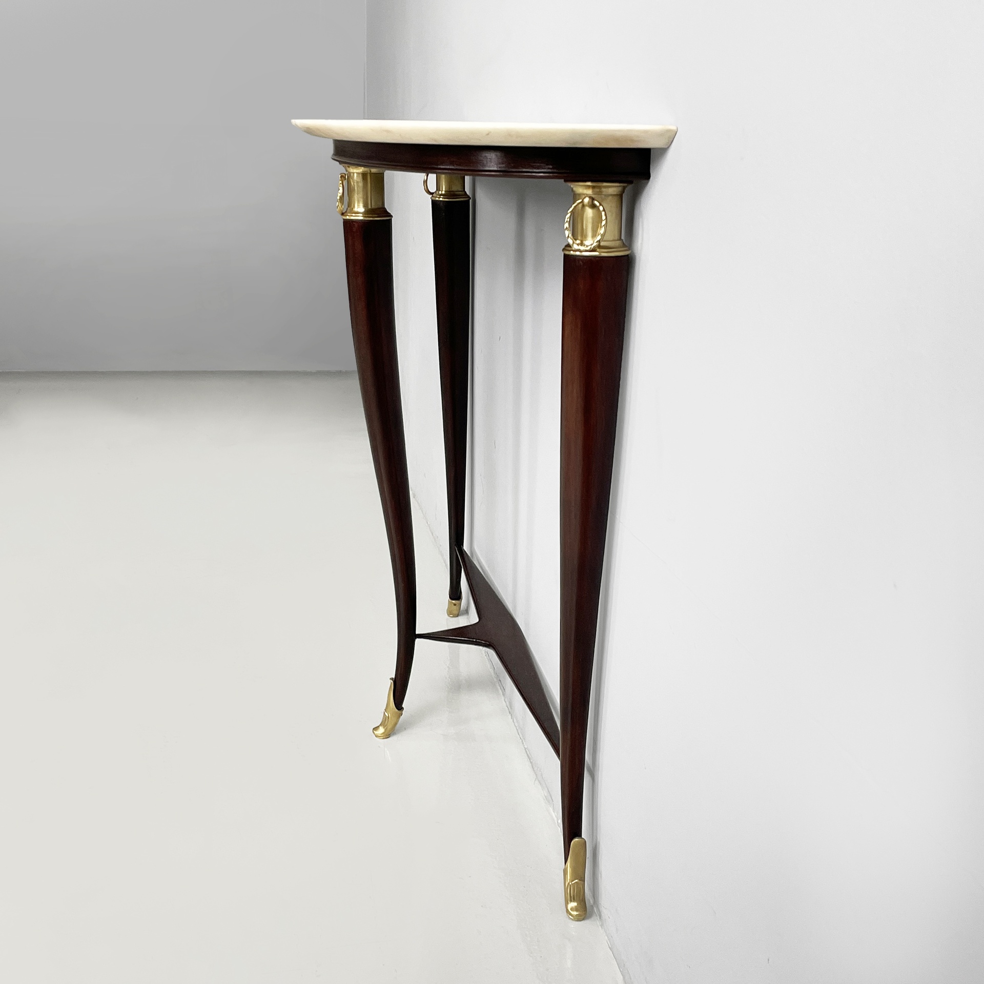 Consolle da parete con piano semitondo in marmo bianco-rosa. La struttura a tre zampe è in legno scuro con dettagli e piedini in ottone lavorato.