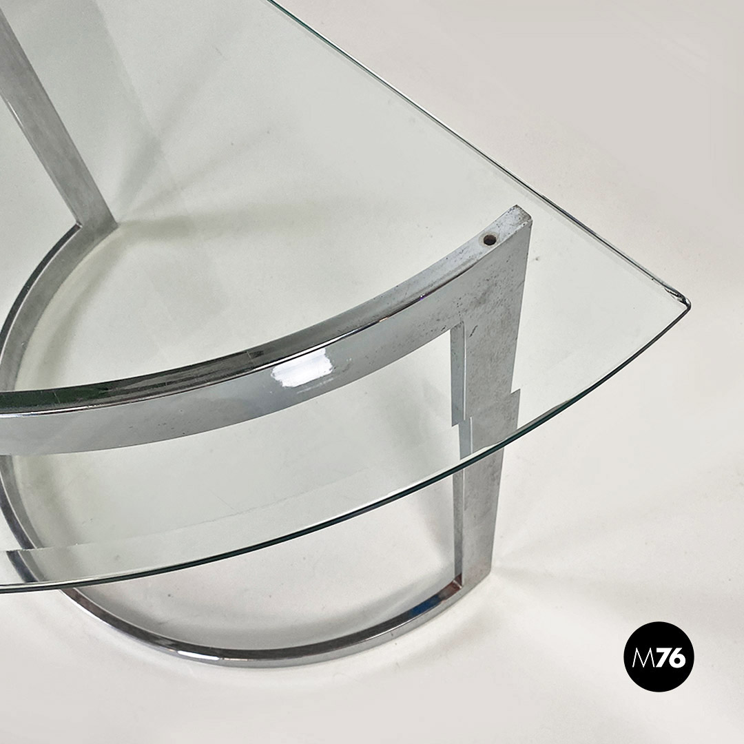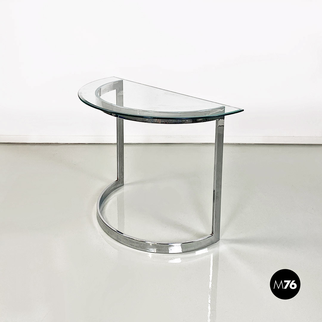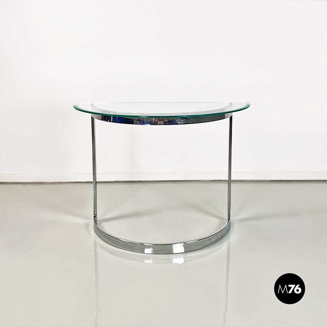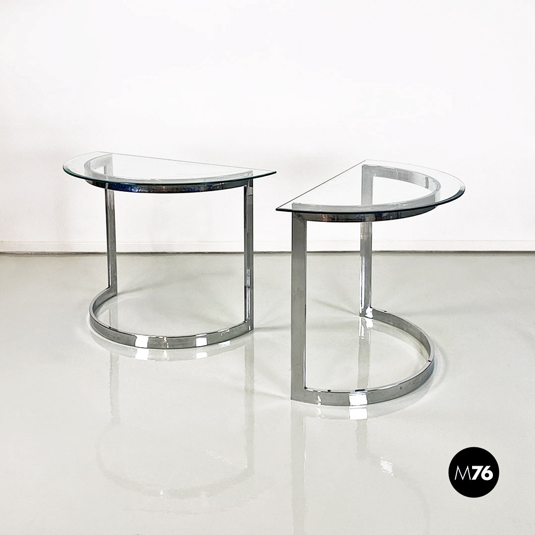 Coppia di consolle di provenienza parigina, con struttura in acciaio cromato, con piano di forma semicircolare in vetro bisellato.