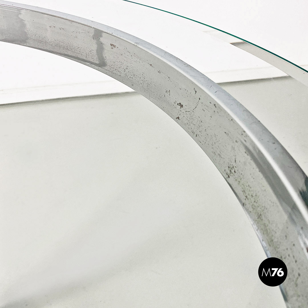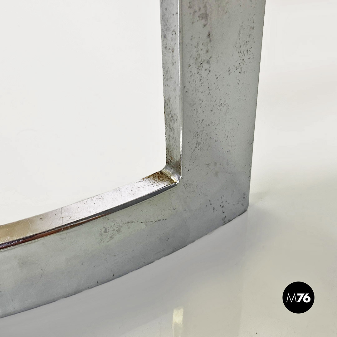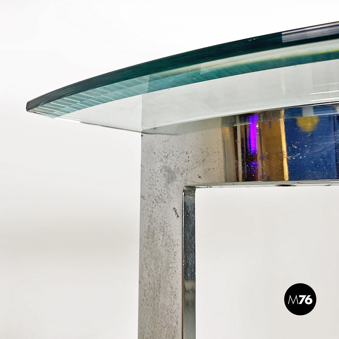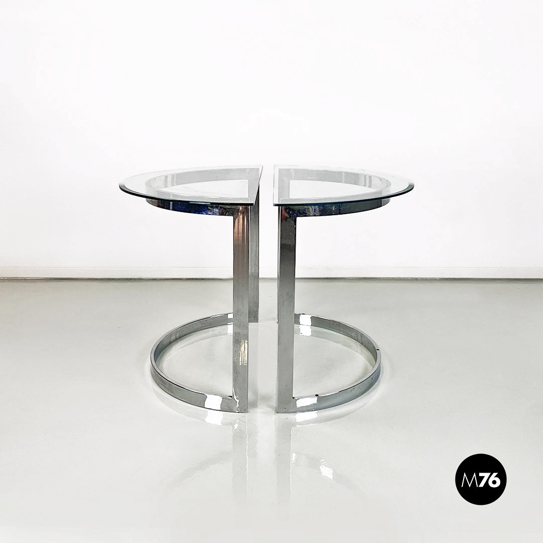 Coppia di consolle di provenienza parigina, con struttura in acciaio cromato, con piano di forma semicircolare in vetro bisellato.