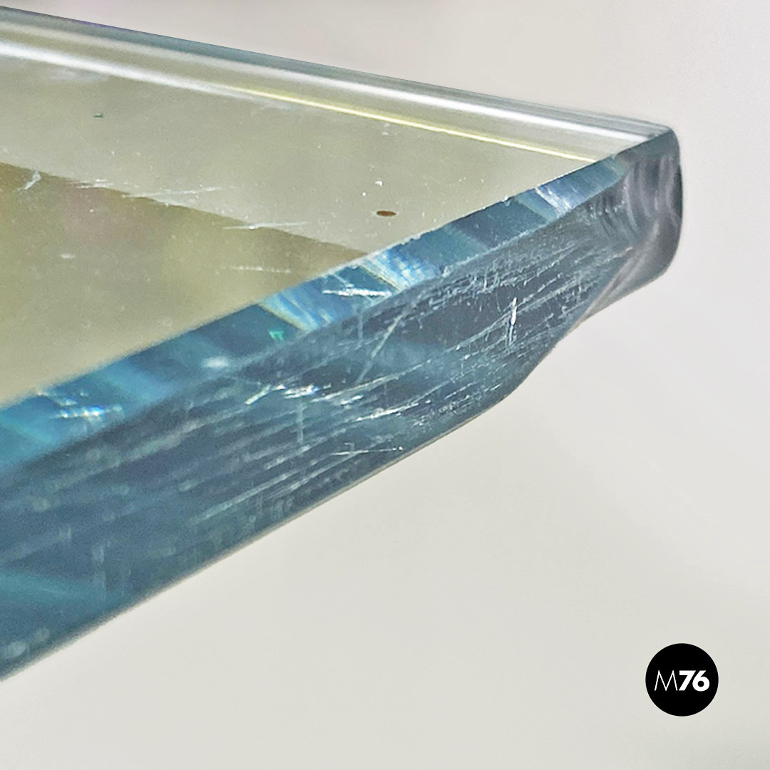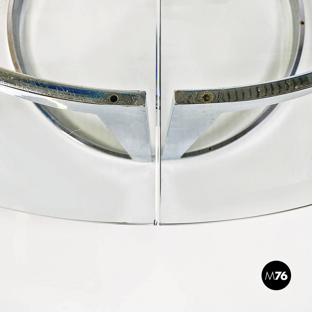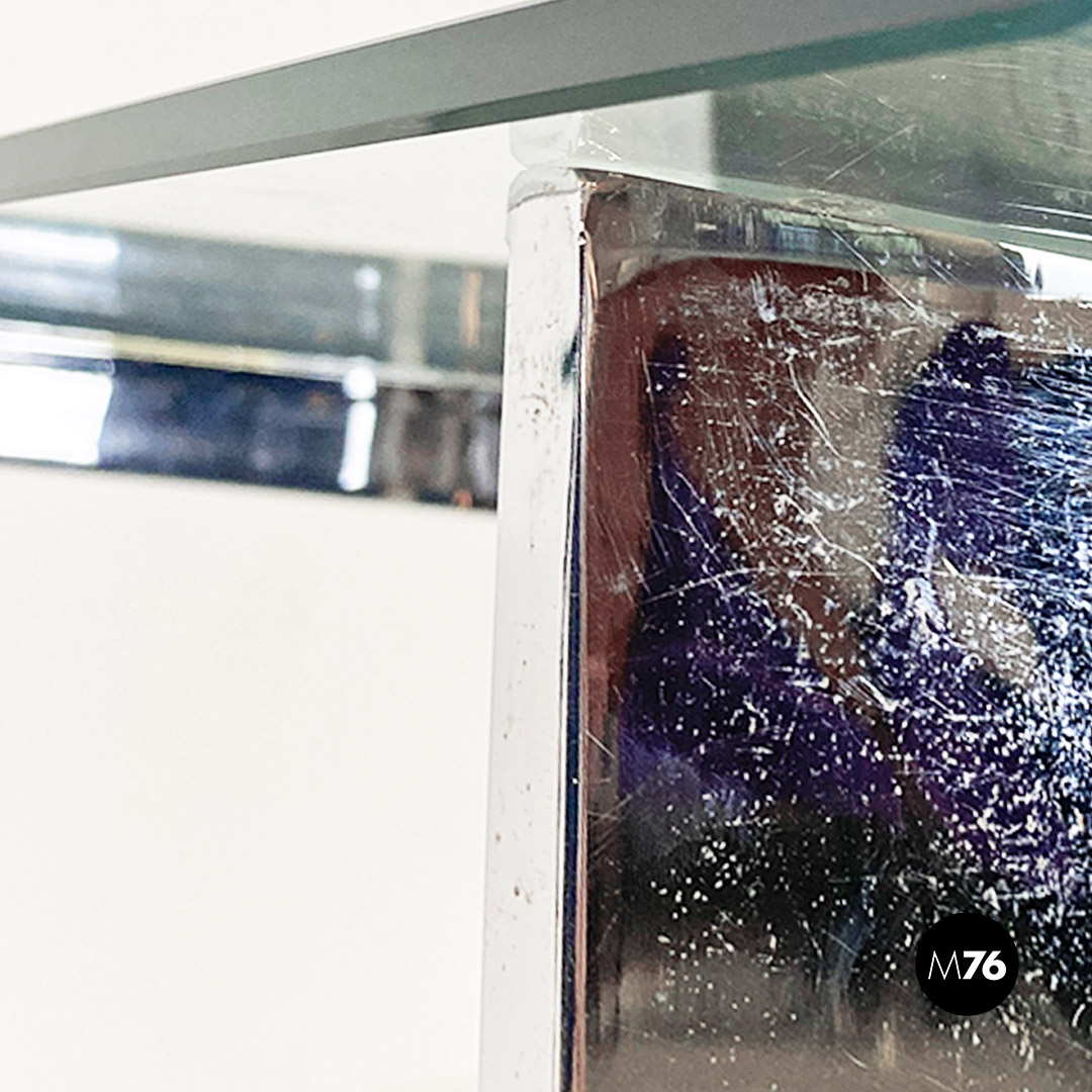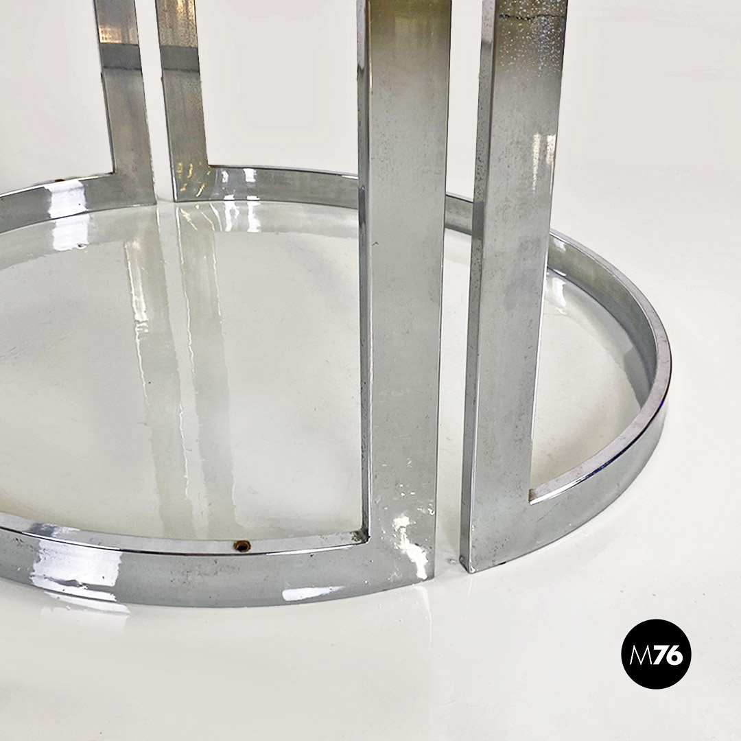 Coppia di consolle di provenienza parigina, con struttura in acciaio cromato, con piano di forma semicircolare in vetro bisellato.