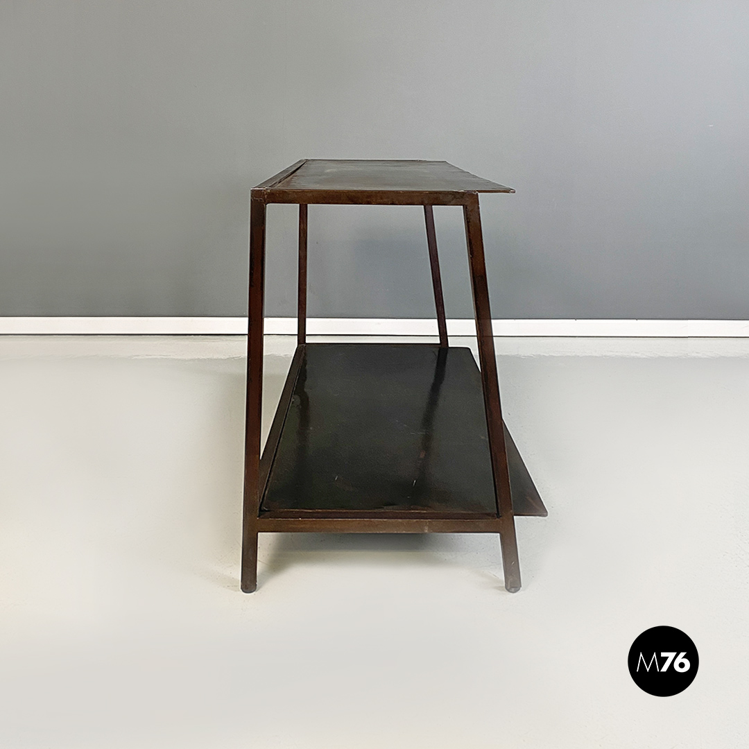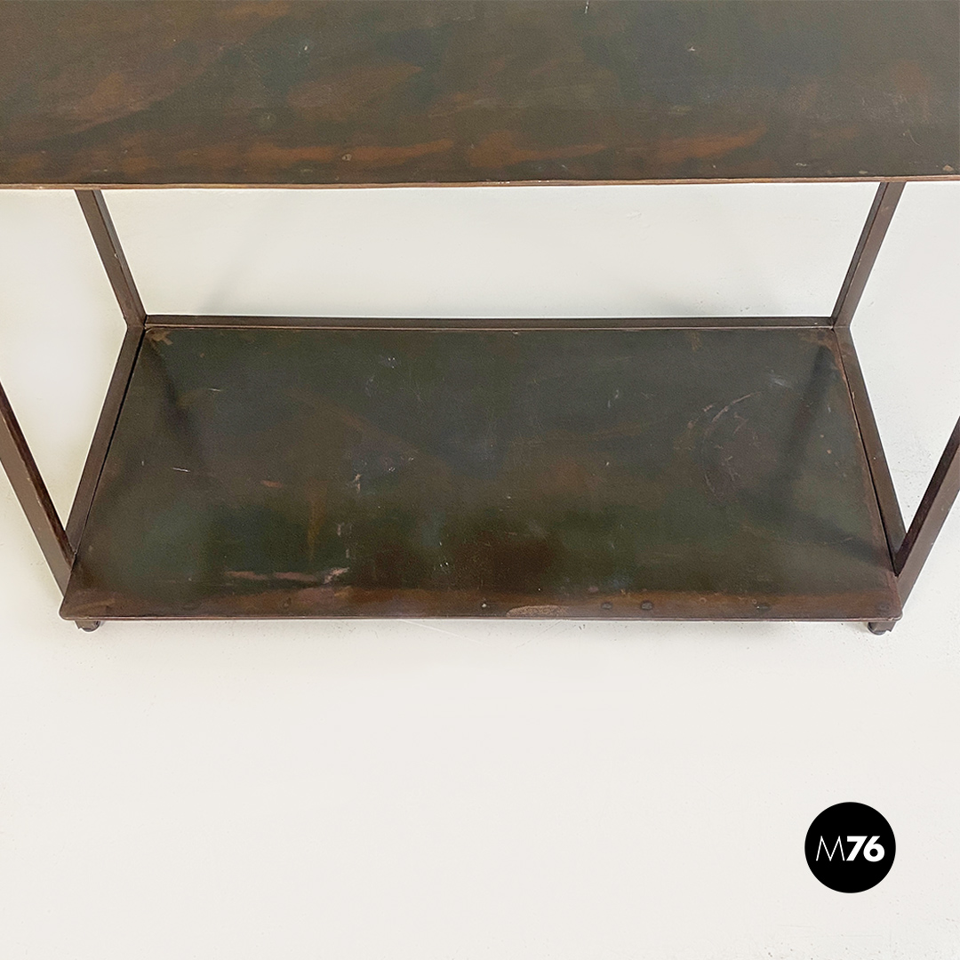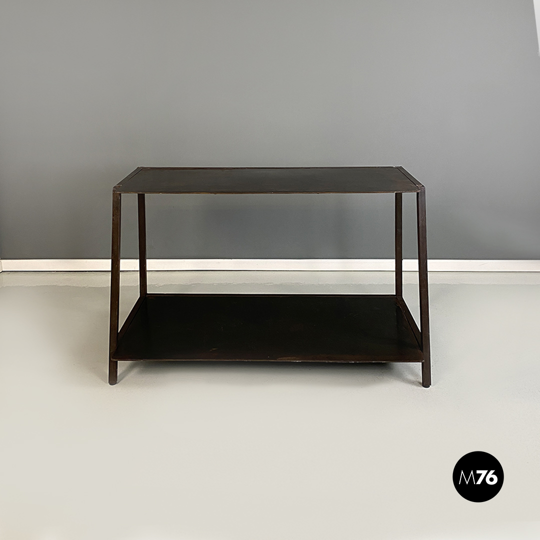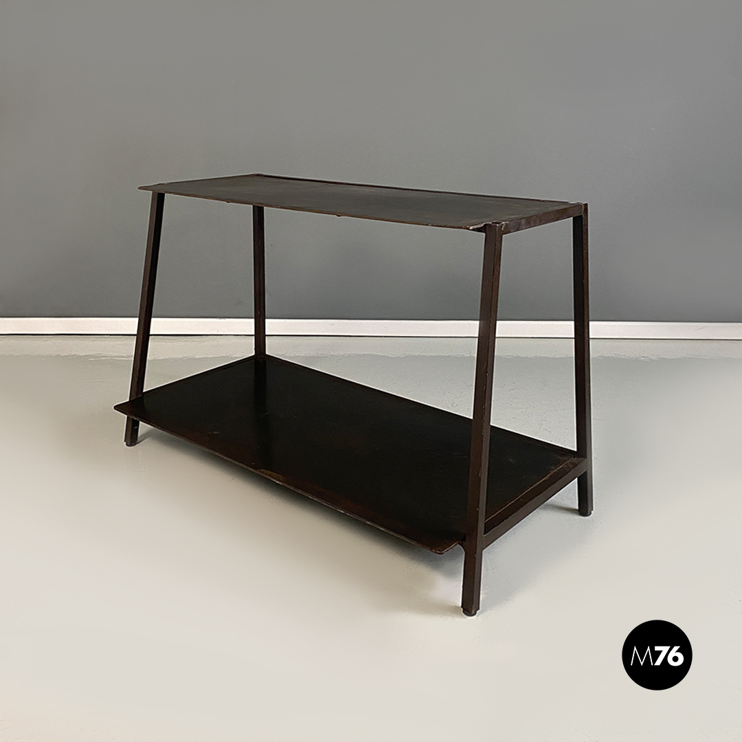 Tavolo o consolle con struttura interamente in metallo, con quattro zampe a sezione quadrata e tiranti che rendono la struttura più forte e impediscono alle mensole di flettere. Il piano superiore non alloggia perfettamente nel suo spazio per via di un probabile restauro al telaio, eseguito in passato, ma senza che questo ne comprometta la stabilità.