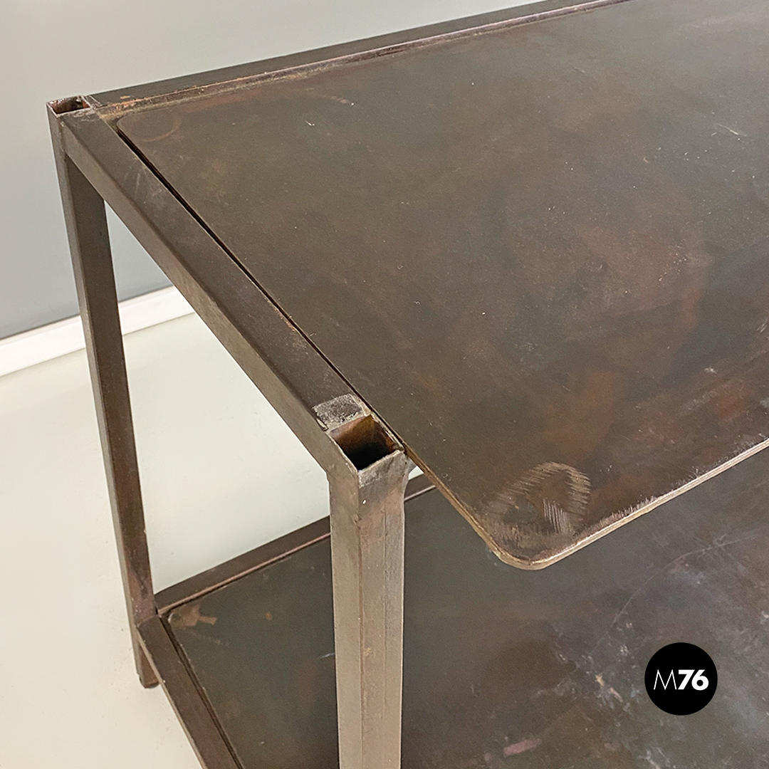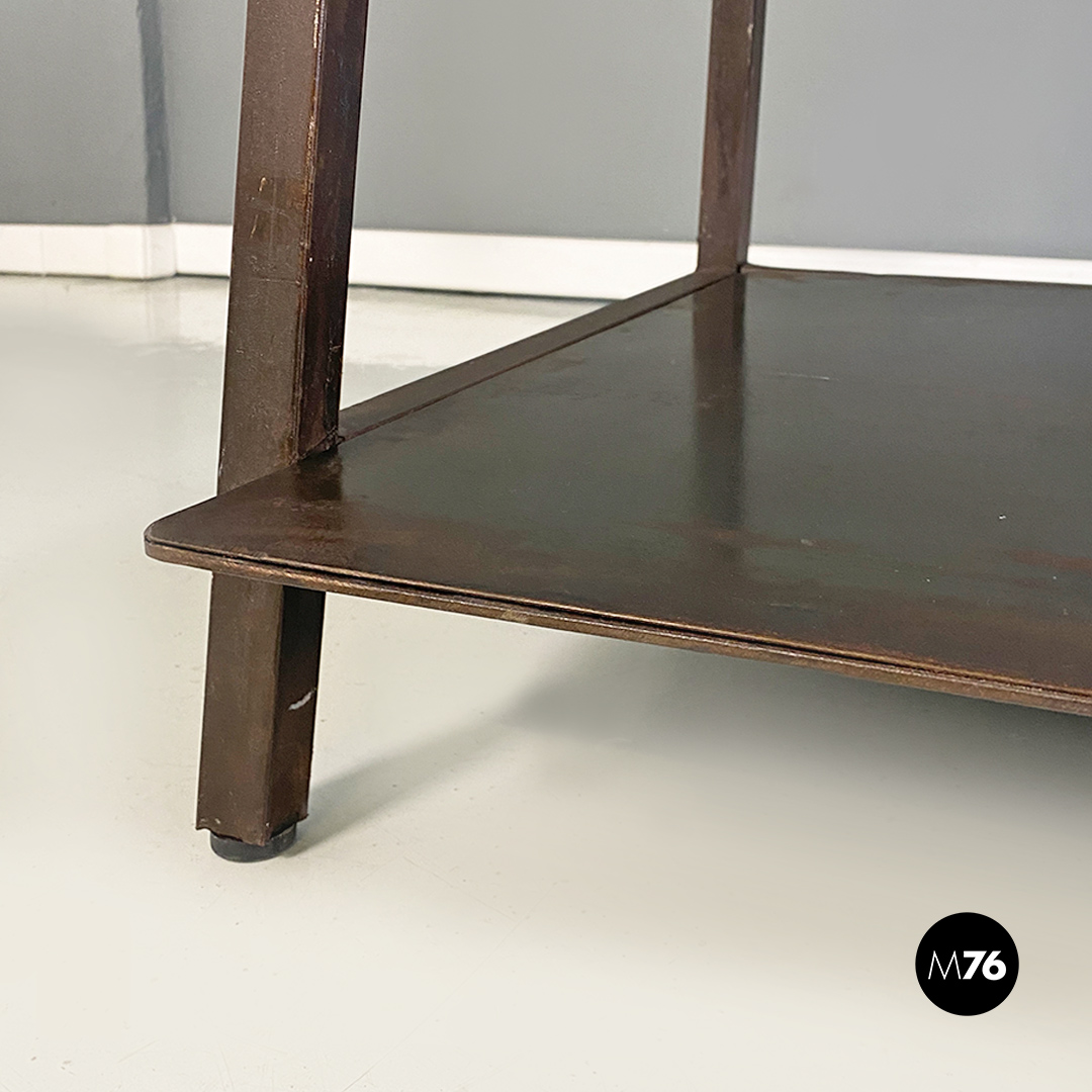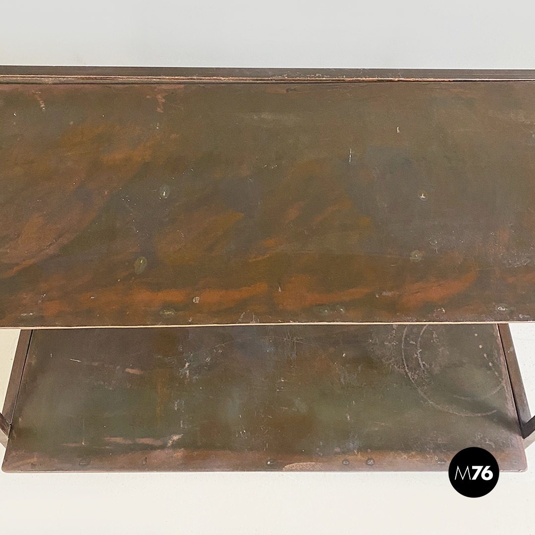 Tavolo o consolle con struttura interamente in metallo, con quattro zampe a sezione quadrata e tiranti che rendono la struttura più forte e impediscono alle mensole di flettere. Il piano superiore non alloggia perfettamente nel suo spazio per via di un probabile restauro al telaio, eseguito in passato, ma senza che questo ne comprometta la stabilità.