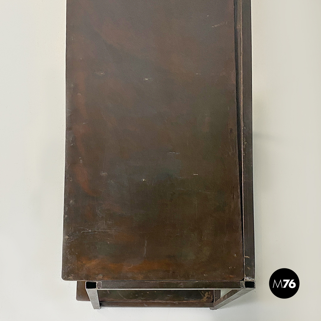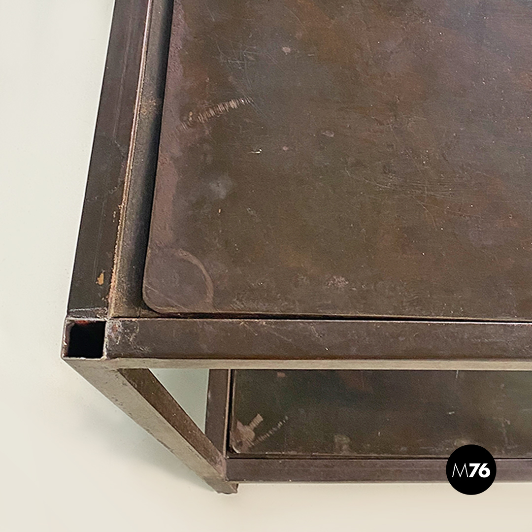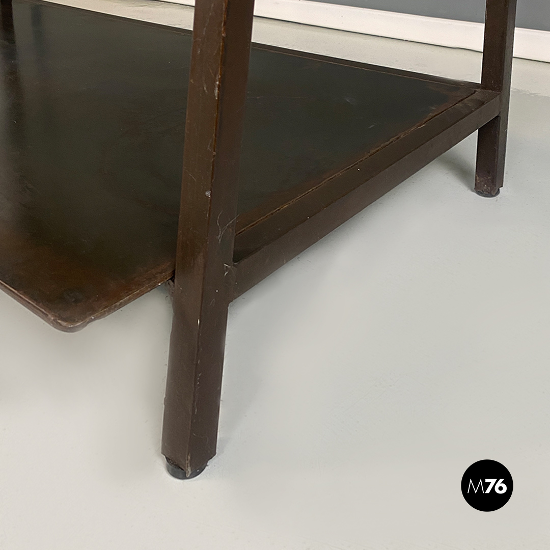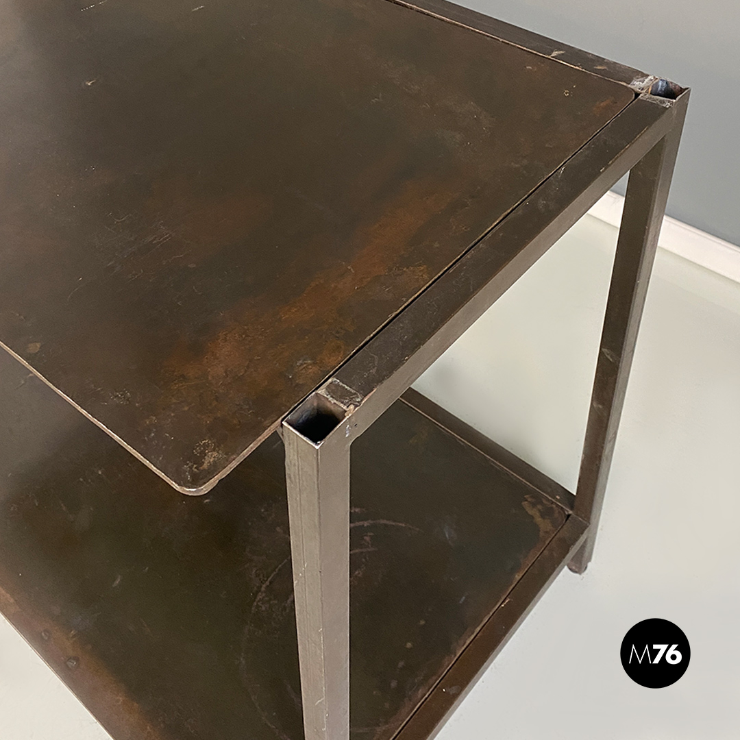 Tavolo o consolle con struttura interamente in metallo, con quattro zampe a sezione quadrata e tiranti che rendono la struttura più forte e impediscono alle mensole di flettere. Il piano superiore non alloggia perfettamente nel suo spazio per via di un probabile restauro al telaio, eseguito in passato, ma senza che questo ne comprometta la stabilità.