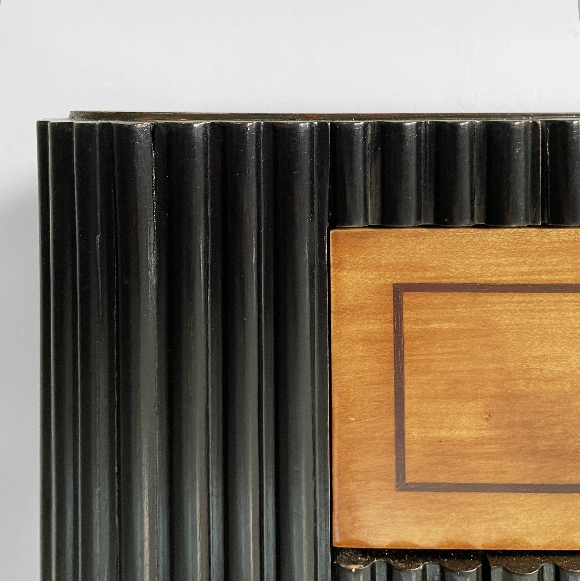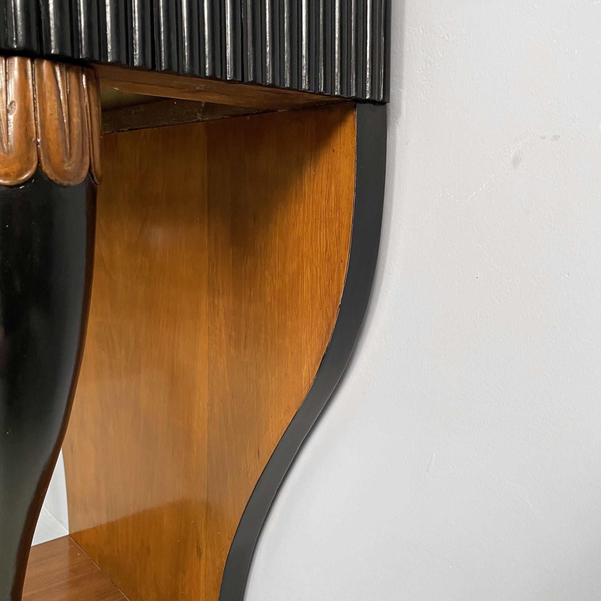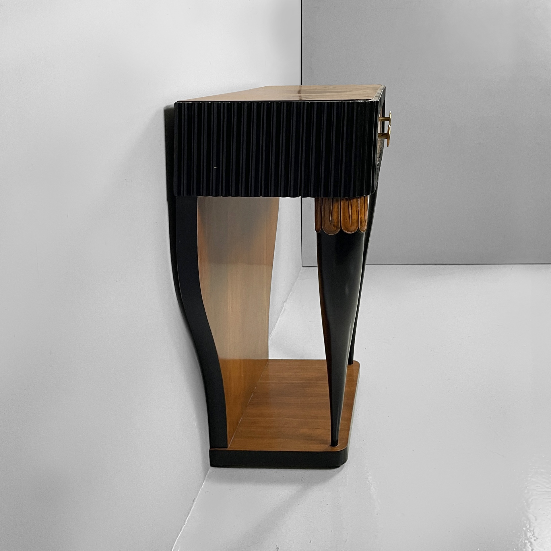 Consolle da parete con piano rettangolare ad angoli arrotondati, in legno. Sul fronte in legno grissinato nero è presente un cassetto in legno rettangolare con maniglie tonde in ottone. La struttura è composta da un lastra in legno sagomata con profili neri, la quale appoggia a parete, e due colonne dalla forma tondeggiante in legno verniciato nero e decori in legno. Base squadrata in legno con profili neri. Art Deco.