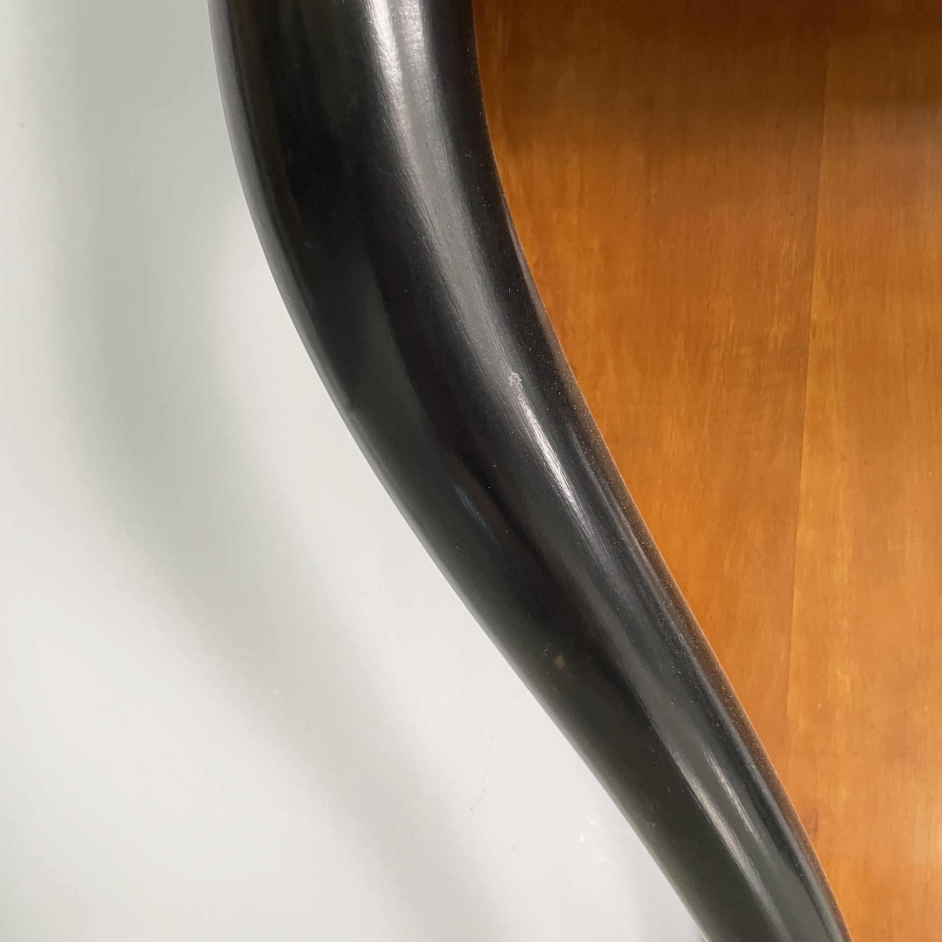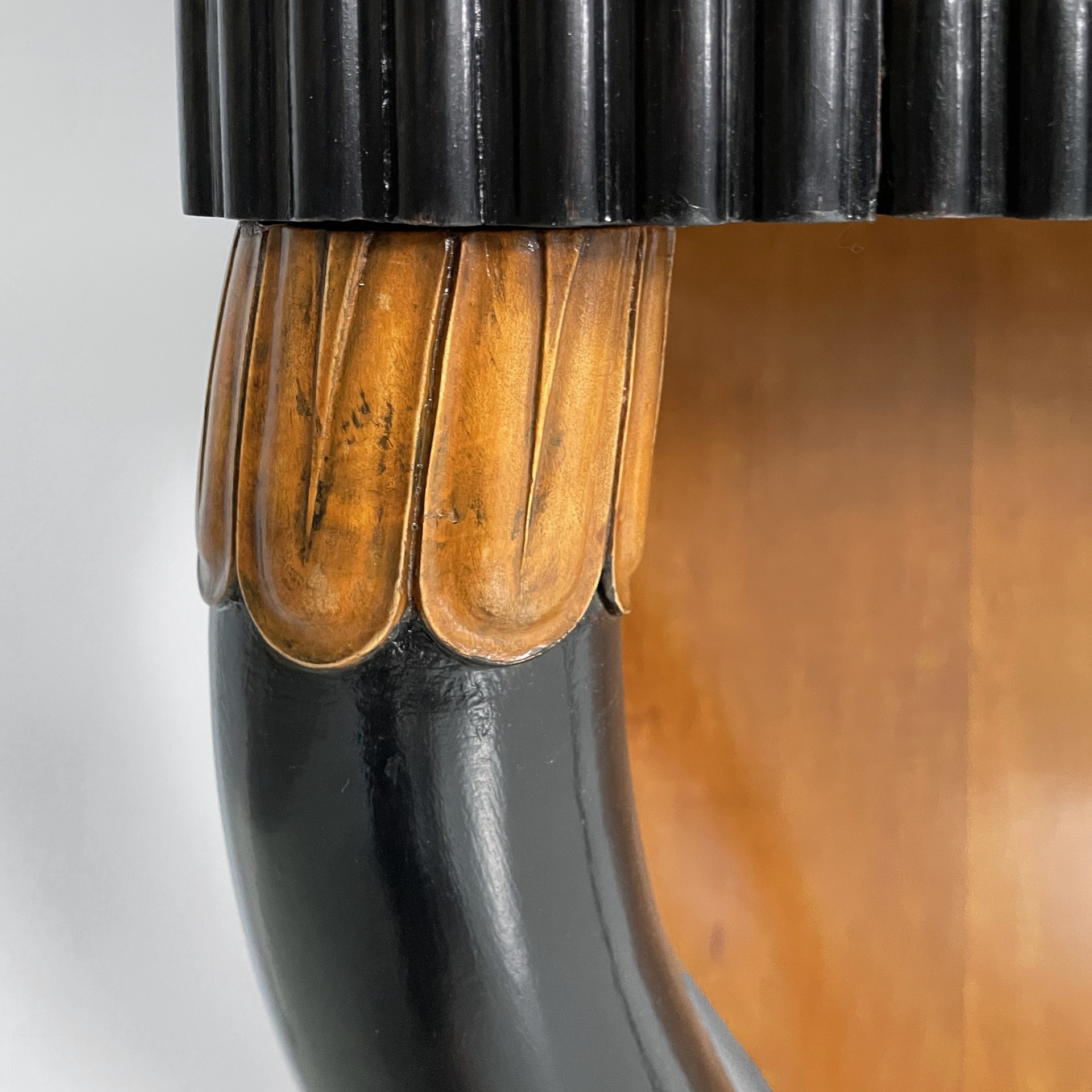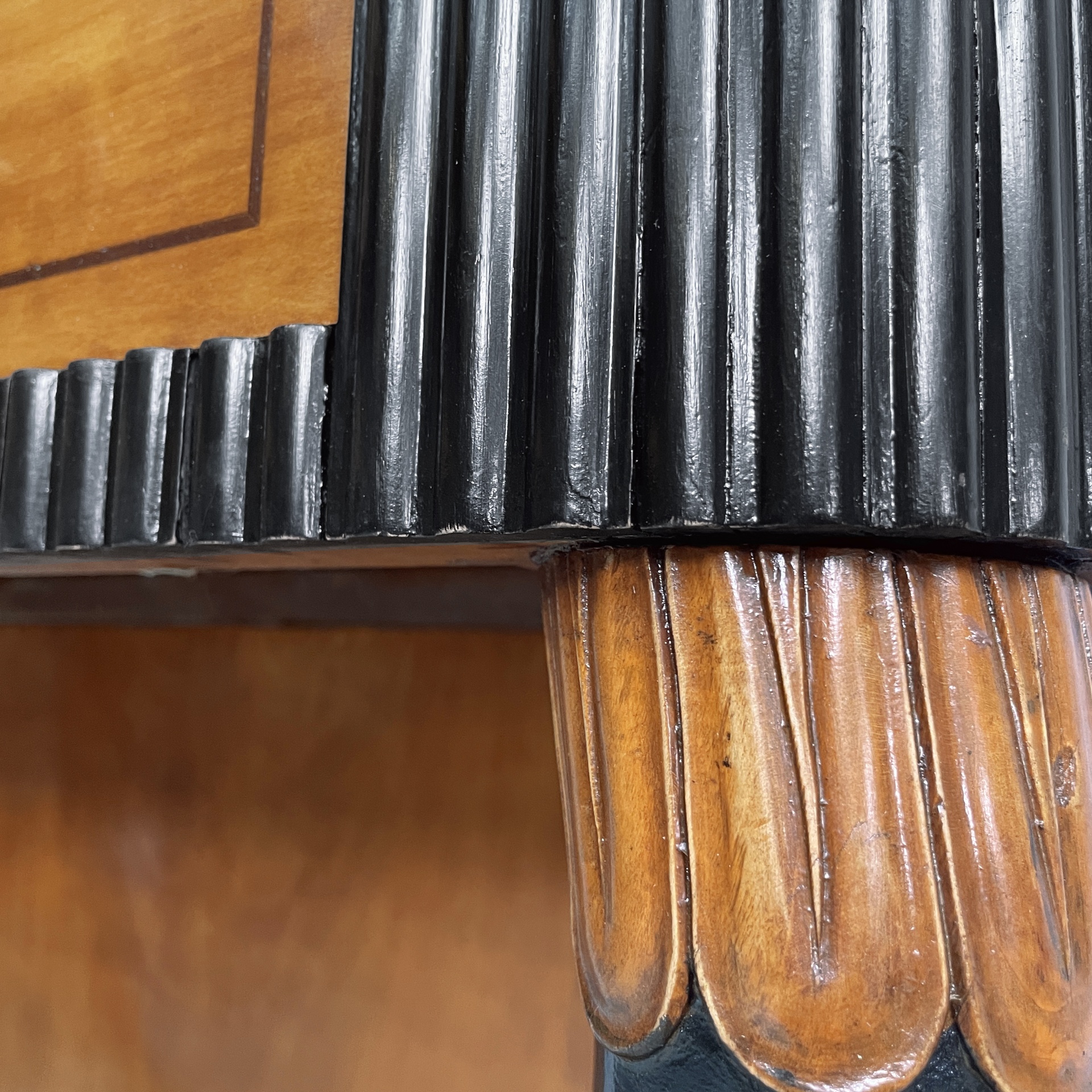 Consolle da parete con piano rettangolare ad angoli arrotondati, in legno. Sul fronte in legno grissinato nero è presente un cassetto in legno rettangolare con maniglie tonde in ottone. La struttura è composta da un lastra in legno sagomata con profili neri, la quale appoggia a parete, e due colonne dalla forma tondeggiante in legno verniciato nero e decori in legno. Base squadrata in legno con profili neri. Art Deco.