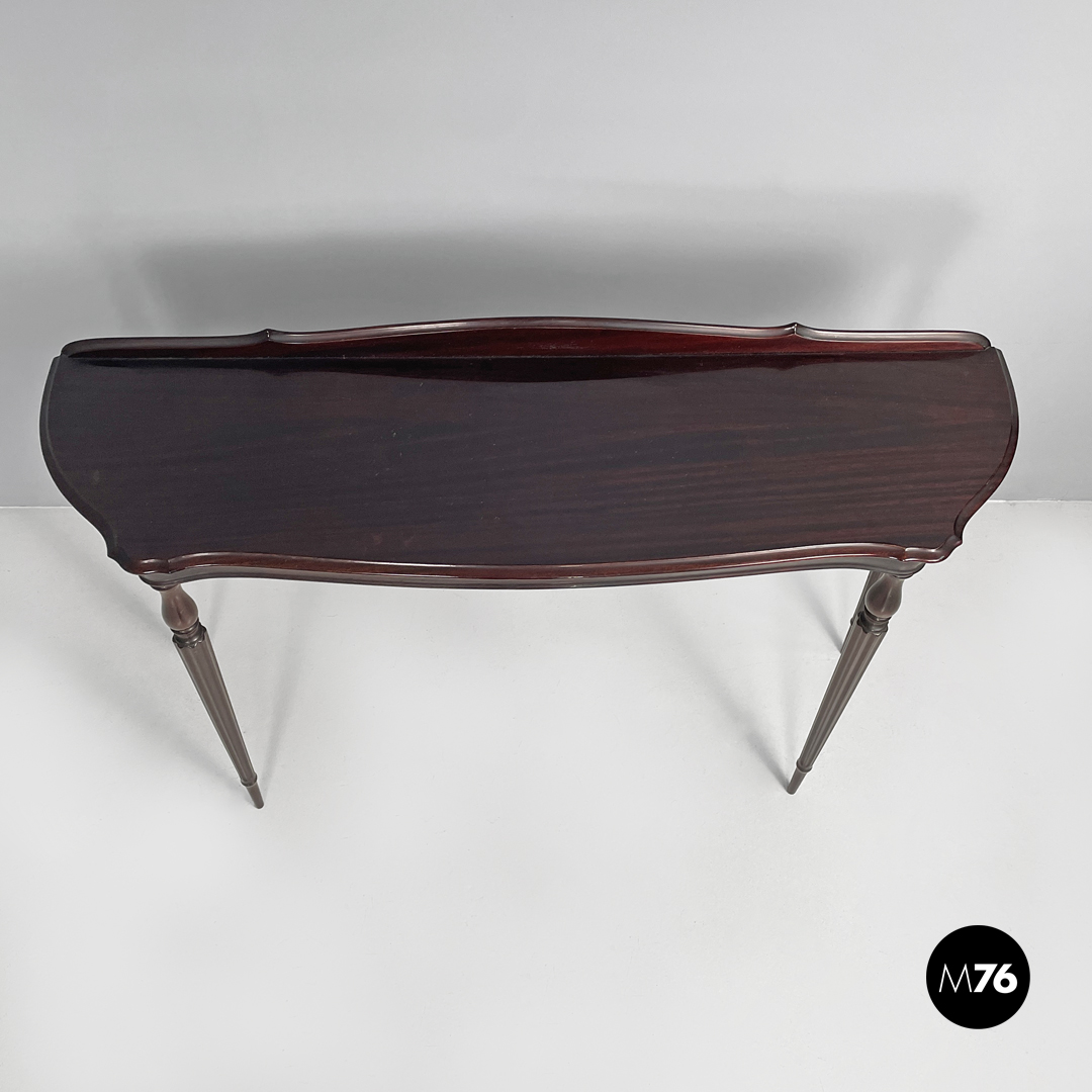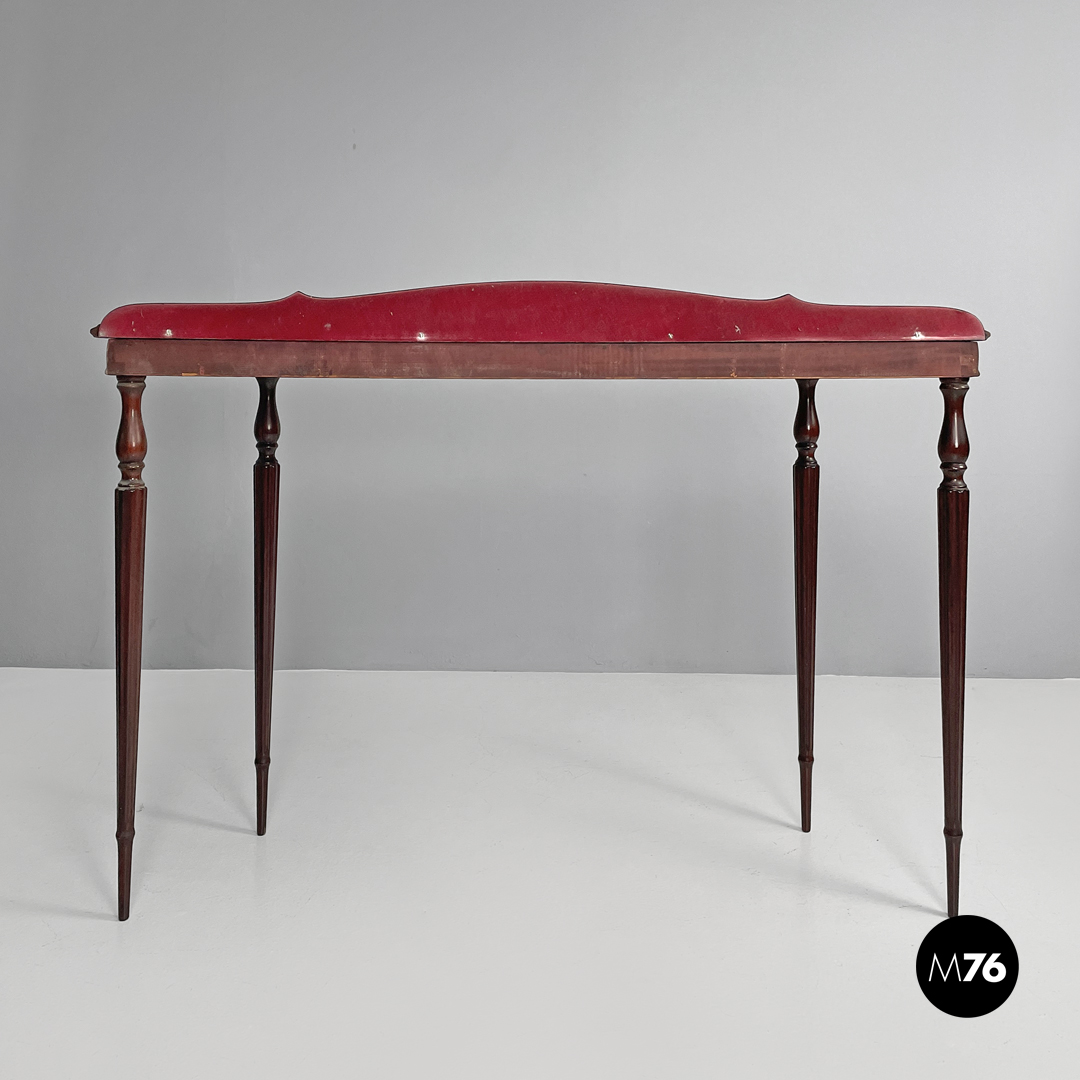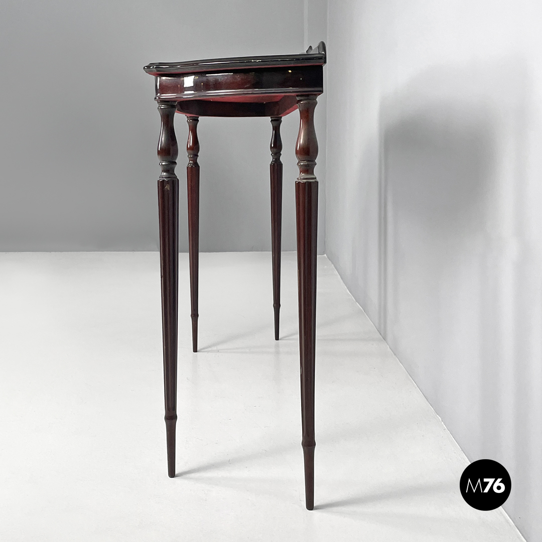 Consolle in legno. Il piano presenta angoli sagomati nella parte davanti, così come la parte posteriore che poggia al muro. Le quattro gambe sono anch’esse decorate e sagomate a sezione tonda, e vanno a stringersi all’appoggio a terra. Sotto al piano e all’appoggio al muro posteriore si trovano parti rivestite in carta velluto rossa.