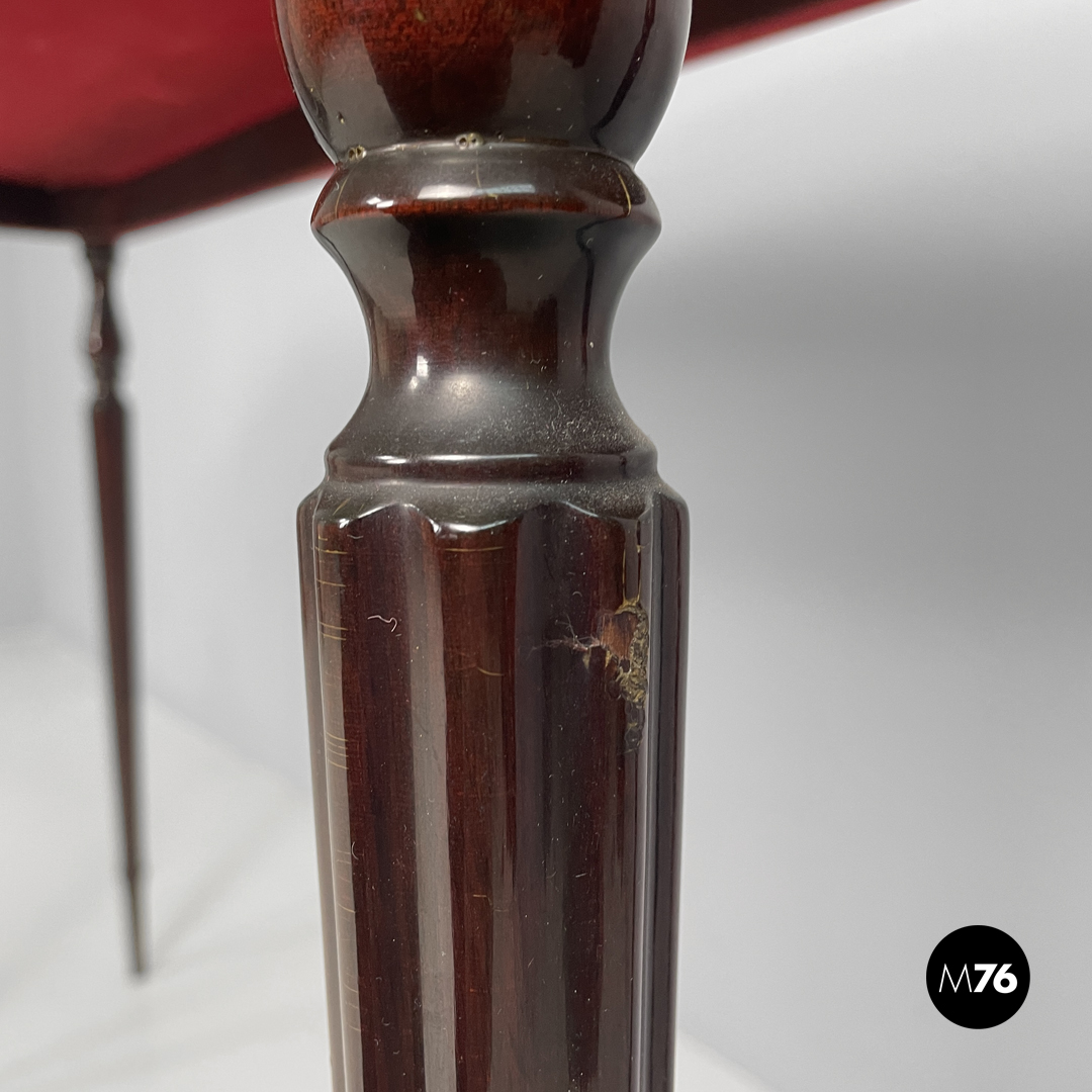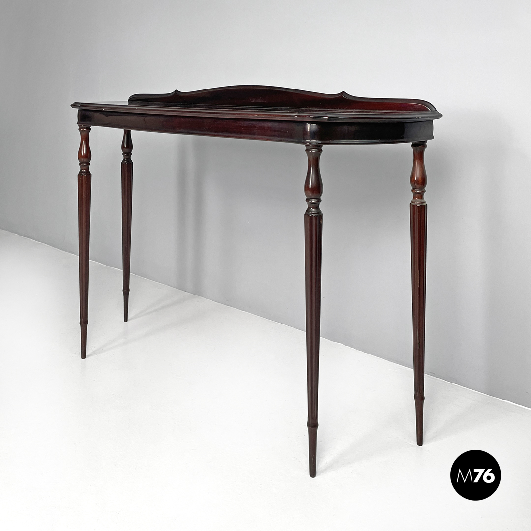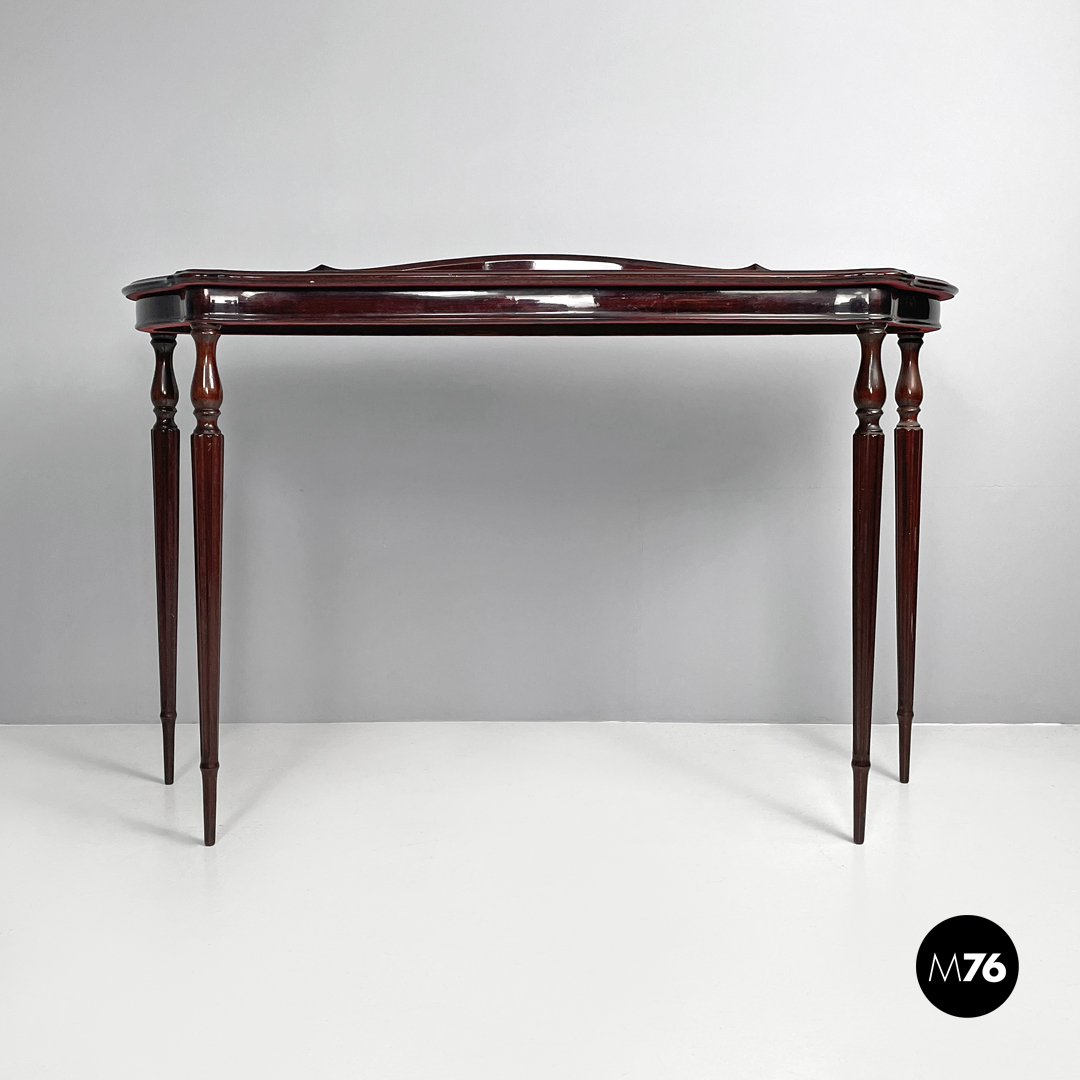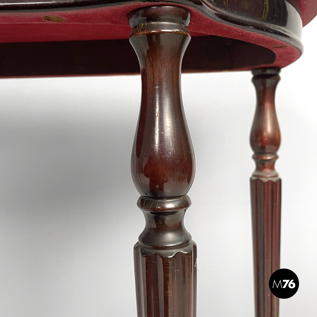 Consolle in legno. Il piano presenta angoli sagomati nella parte davanti, così come la parte posteriore che poggia al muro. Le quattro gambe sono anch’esse decorate e sagomate a sezione tonda, e vanno a stringersi all’appoggio a terra. Sotto al piano e all’appoggio al muro posteriore si trovano parti rivestite in carta velluto rossa.