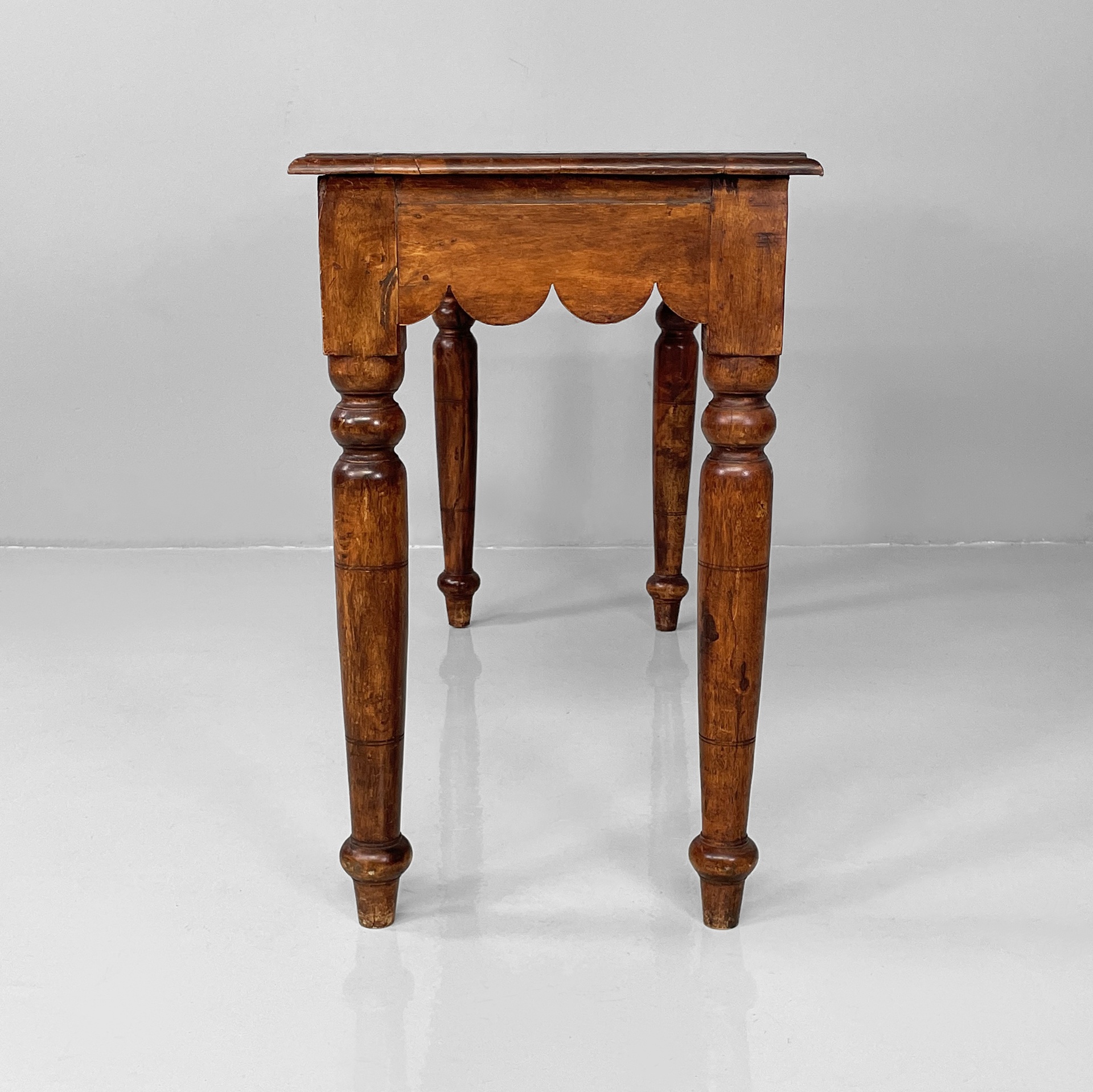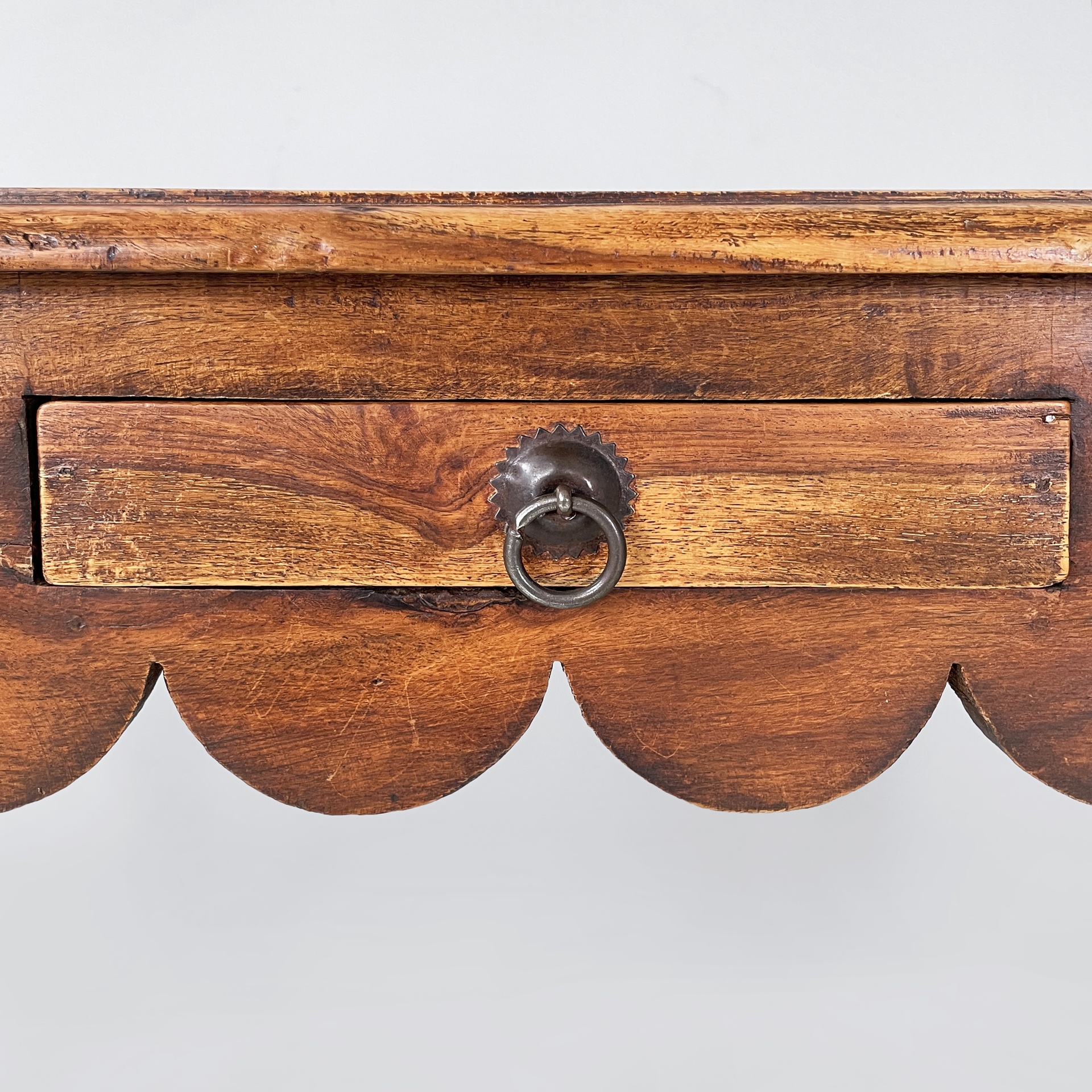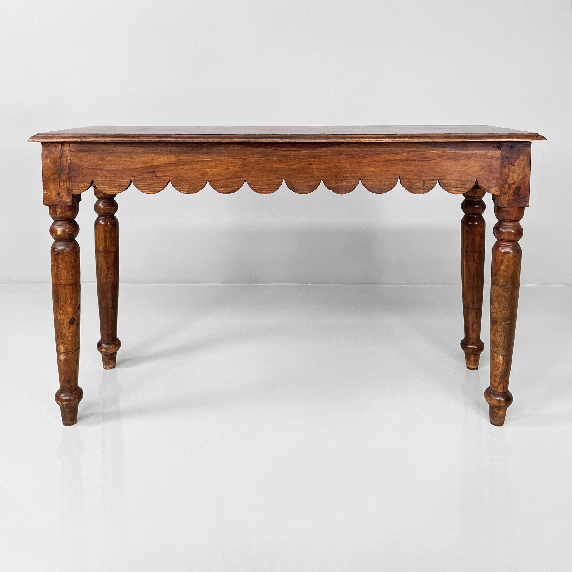 Tavolo consolle con pianto rettangolare, interamente in legno di teak. Sul fronte è presente un cassetto con maniglia in metallo tempo. Su tutto il profilo è presente un decoro tondeggiante. Zampe tornite in legno. Utilizzabile come tavolo da pranzo.