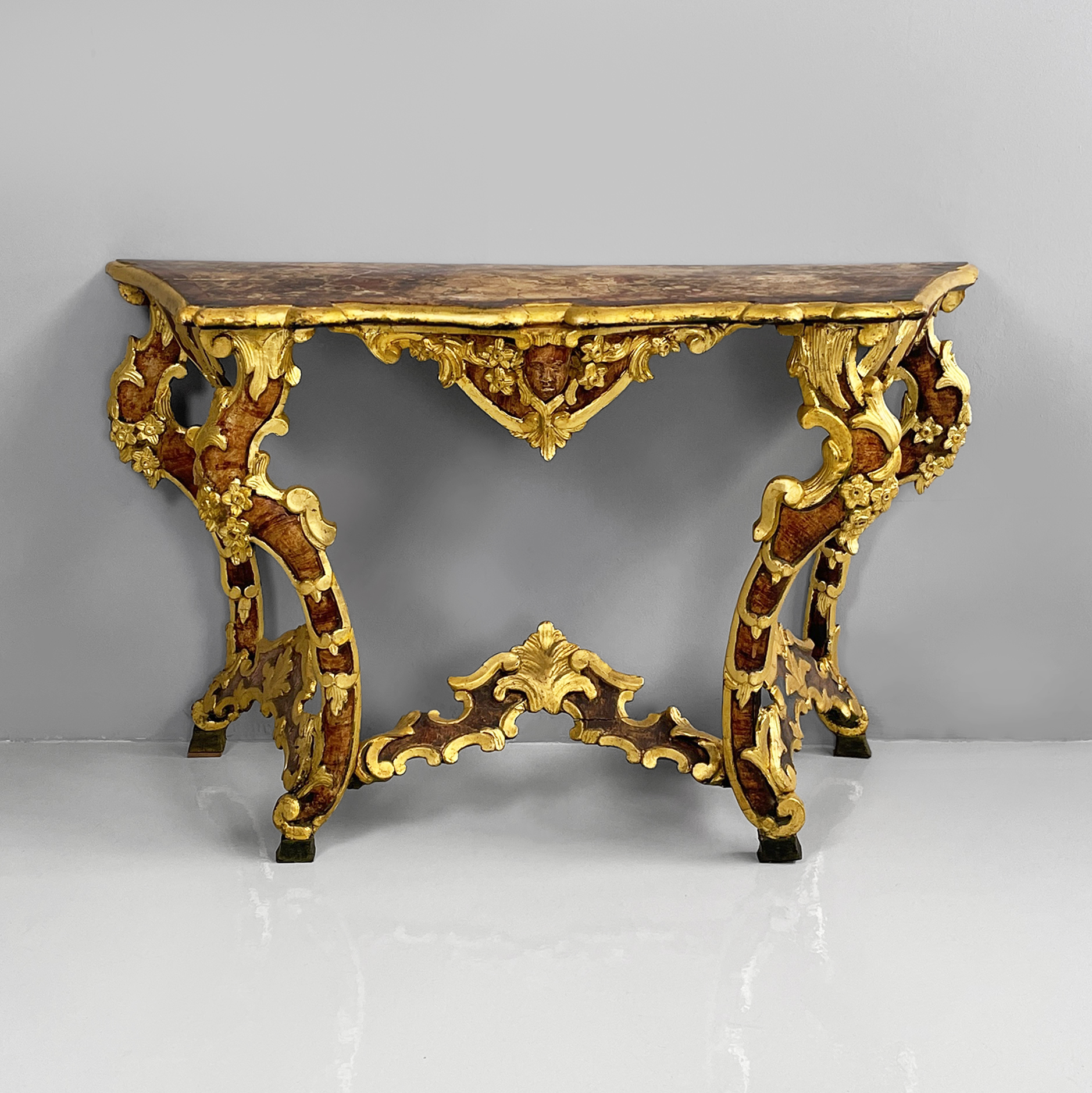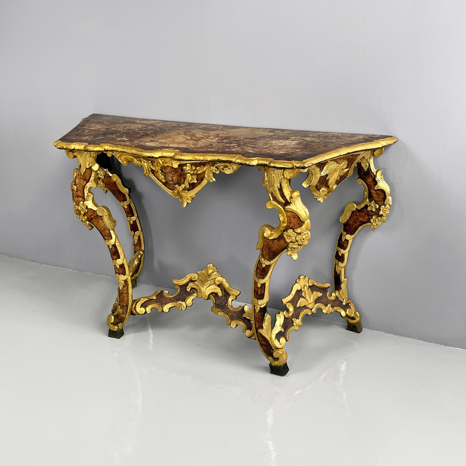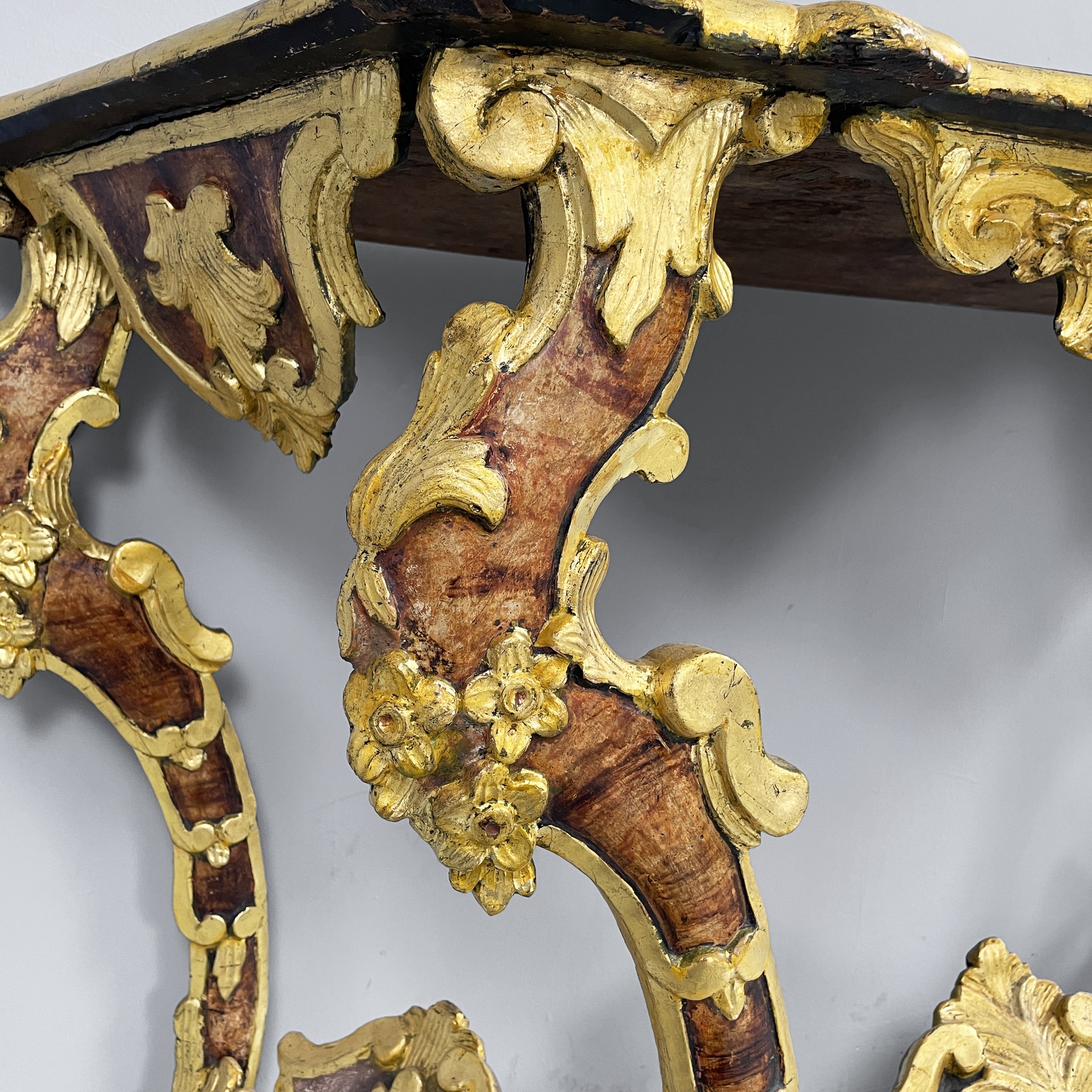 Tavolo consolle interamente in legno finemente lavorato. Il piano sagomato è in legno dipinto effetto marmo con profili dorati. Le zampe sagomate e le parti sagomate alla base presentano numerosi inserti a forma di fiori e riccioli dorati. Piedini squadrati in legno verniciato nero.