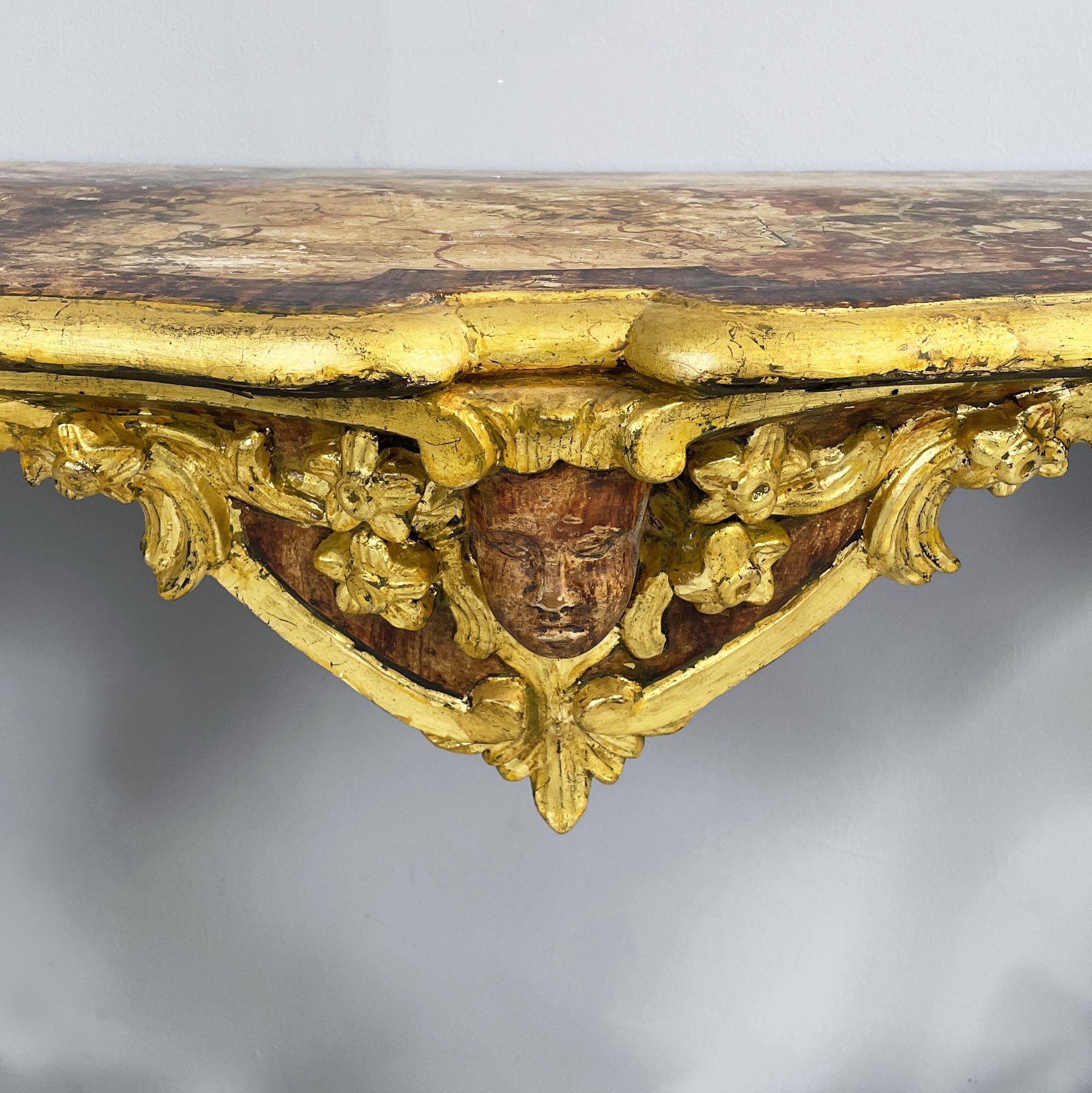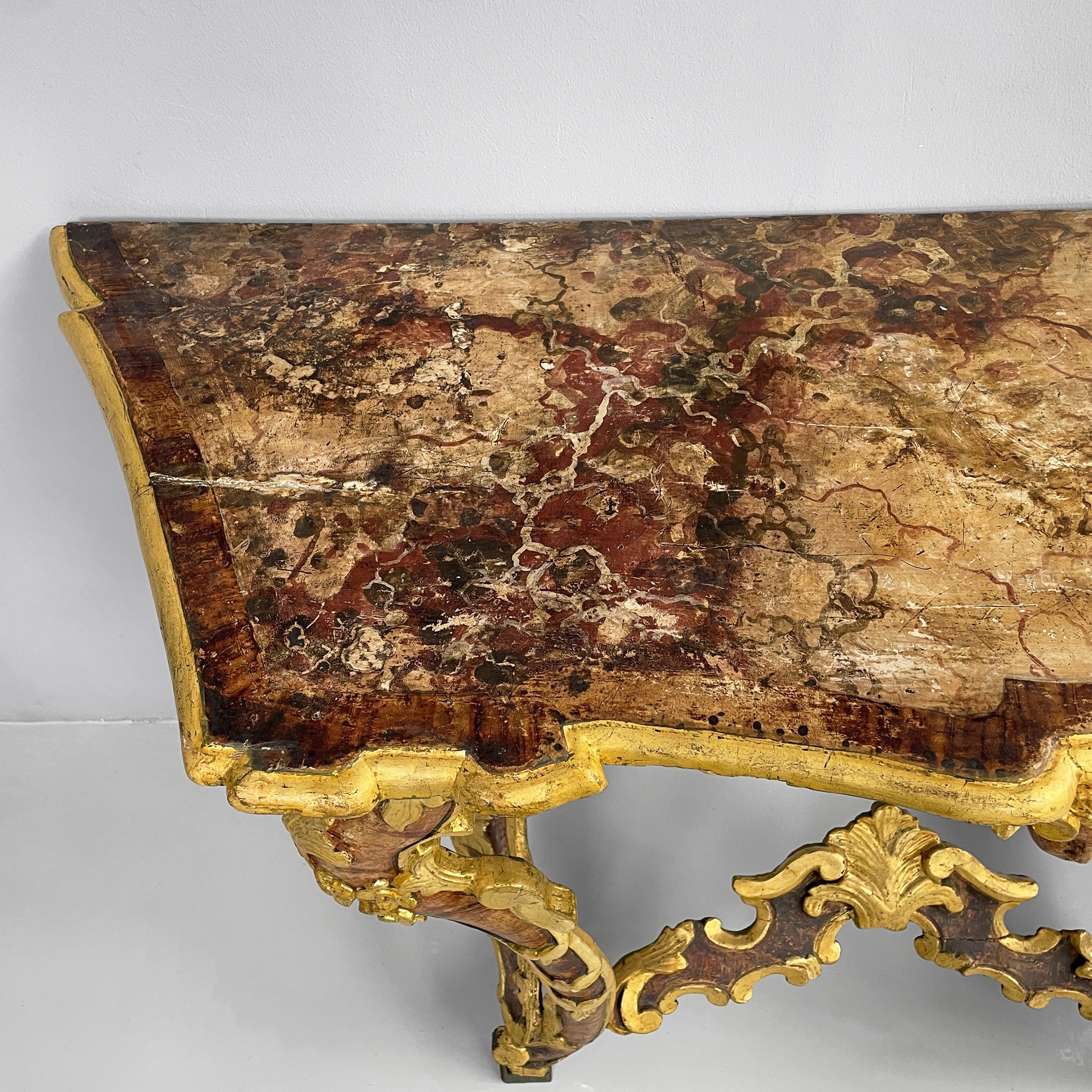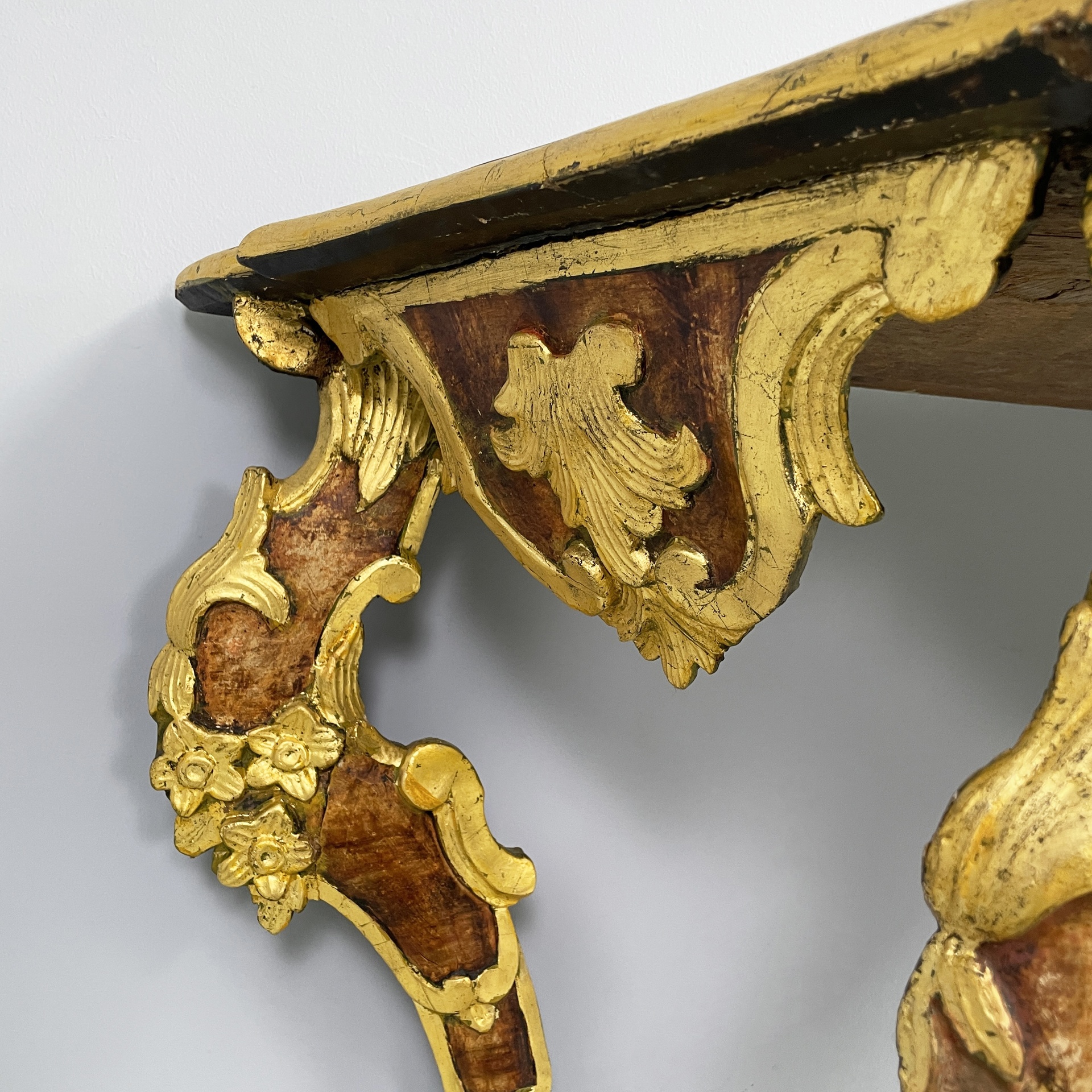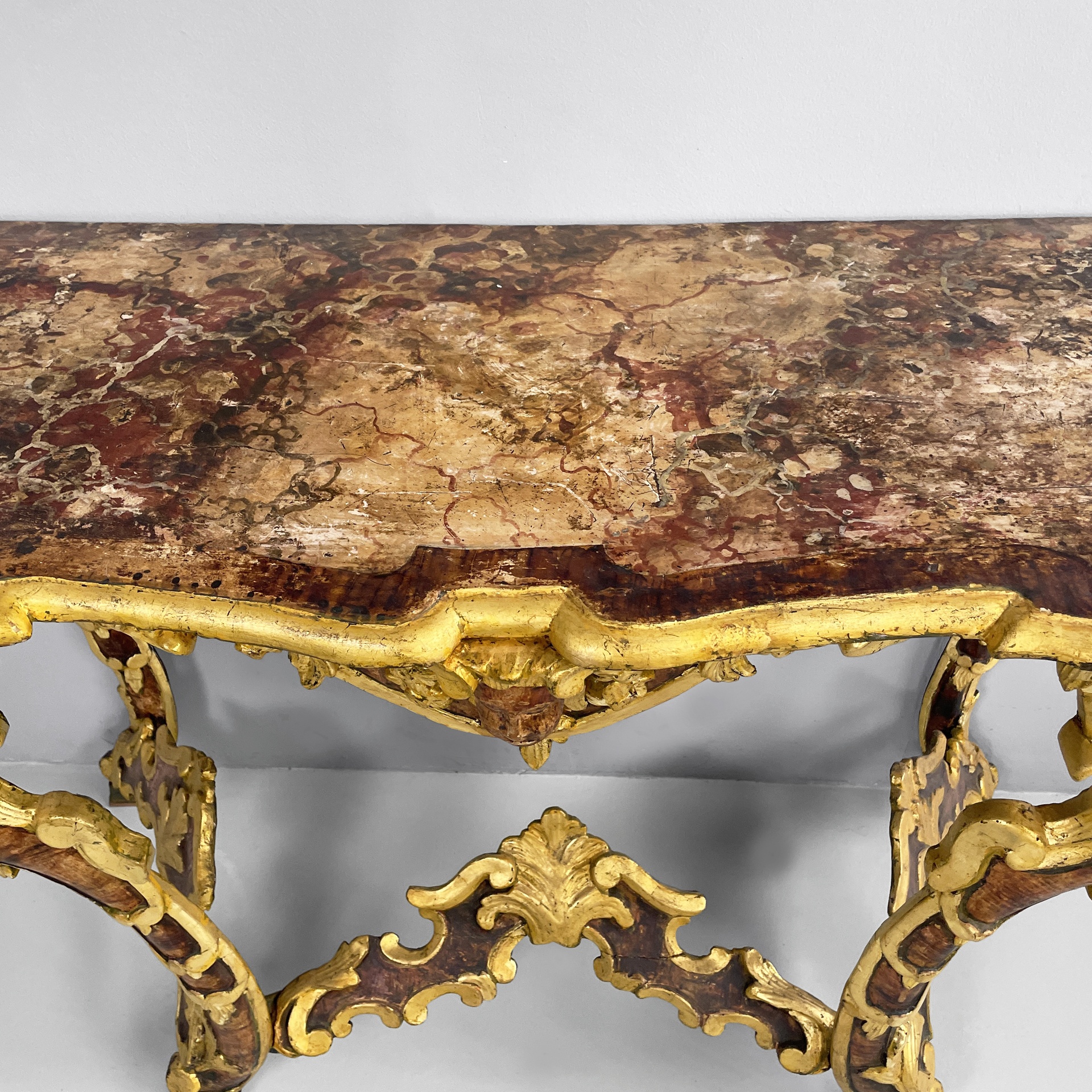 Tavolo consolle interamente in legno finemente lavorato. Il piano sagomato è in legno dipinto effetto marmo con profili dorati. Le zampe sagomate e le parti sagomate alla base presentano numerosi inserti a forma di fiori e riccioli dorati. Piedini squadrati in legno verniciato nero.
