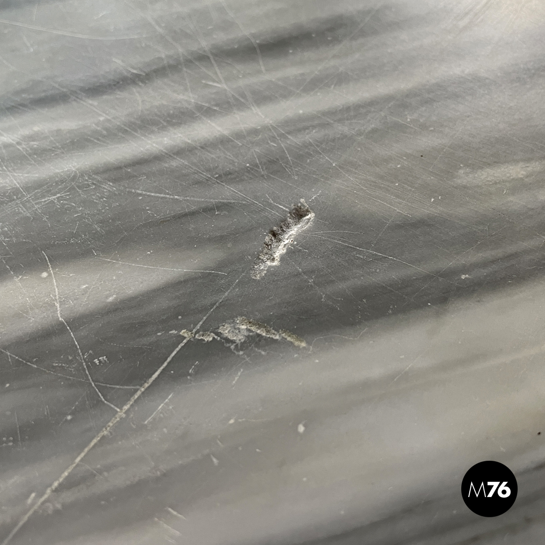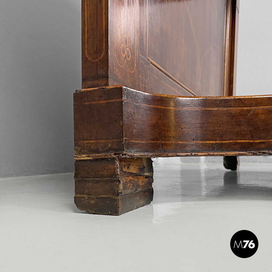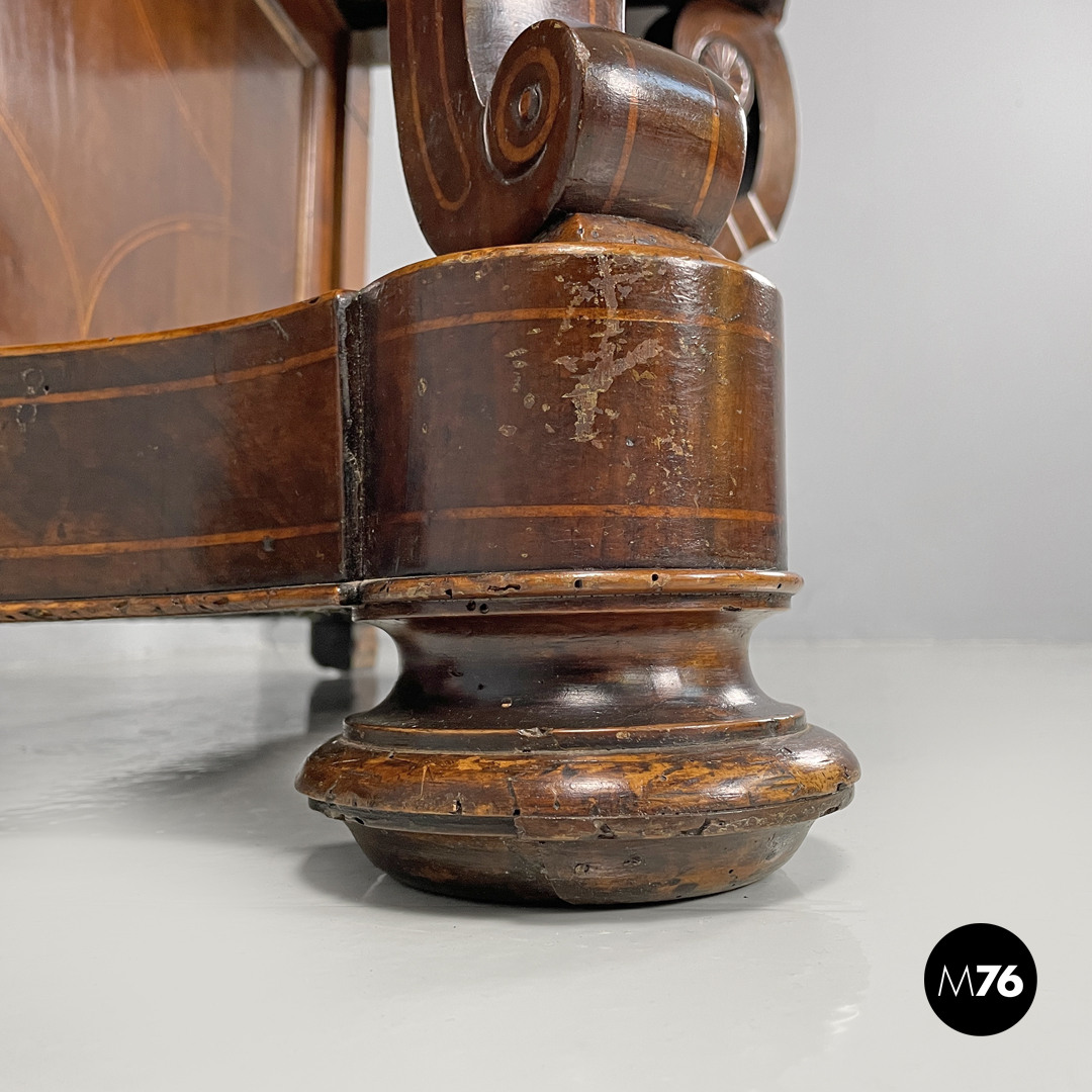 Consolle da parete con due cassetti. Il piano rettangolare è in marmo bianco con venature grigio, sotto si trovano i due cassetti decorati a intarsio con delle forme circolari. La parte posteriore è piatta con intarsio decorativo a forma romboidale, le due gambe davanti seguono linee sinuose e curve e sono riccamente decorate e intagliate. L’appoggio a terra è dato da un pannello con profili stondati e due piedini frontali tondeggianti e due posteriori rettangolari.