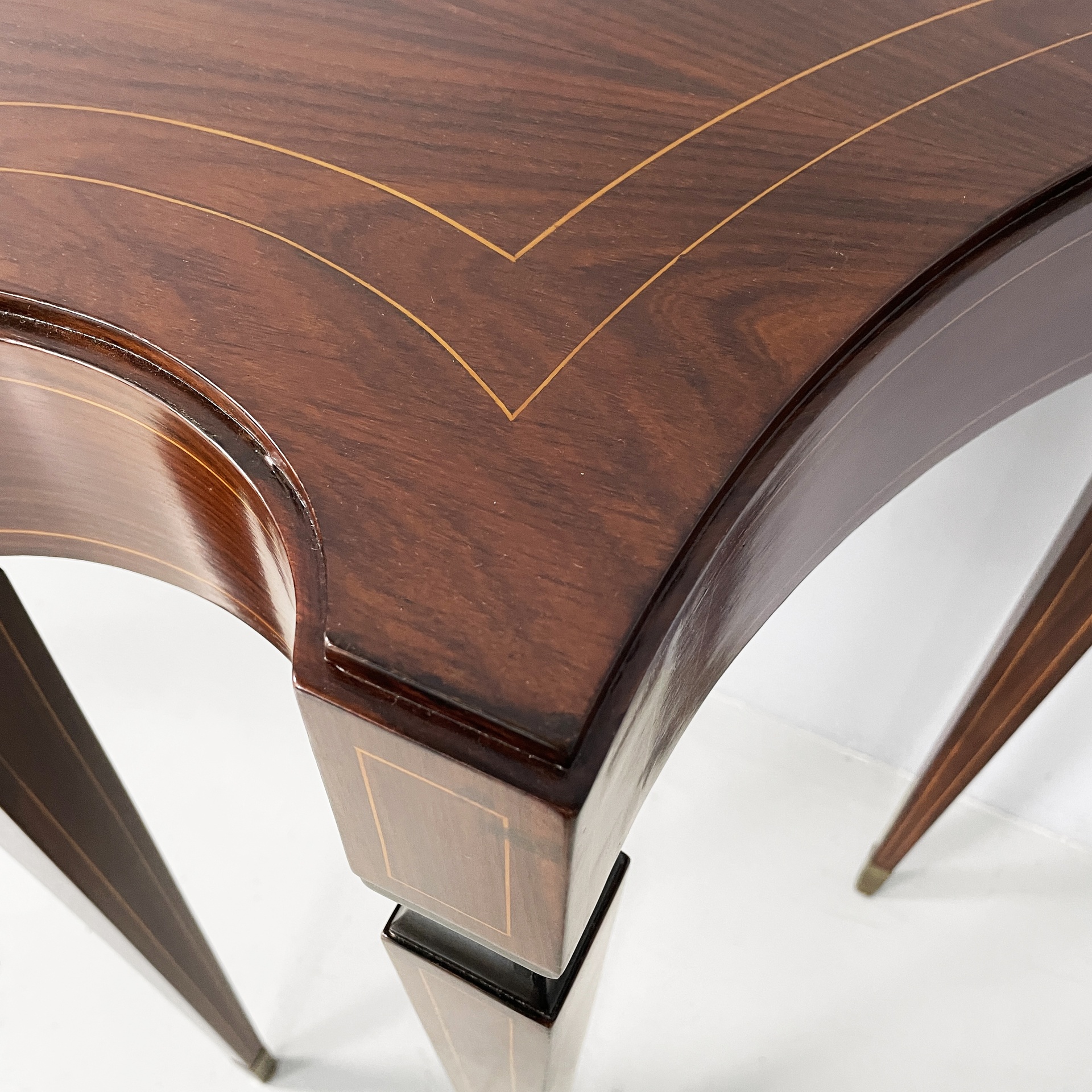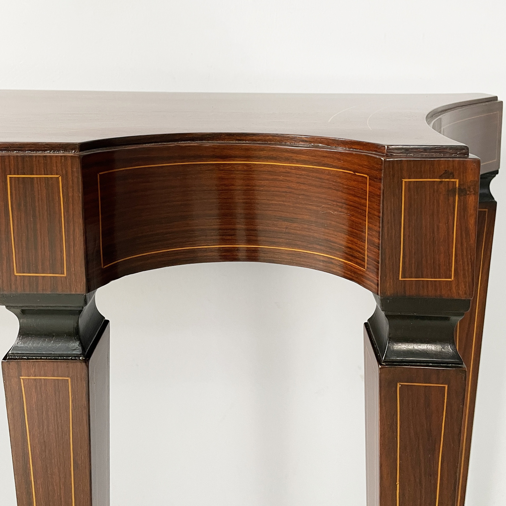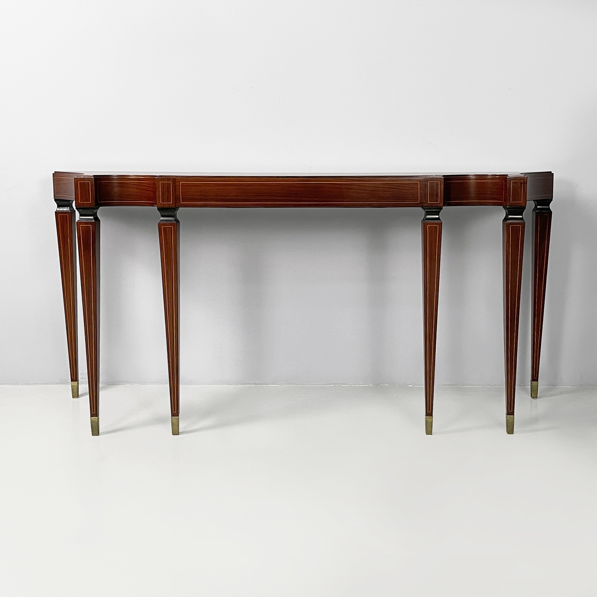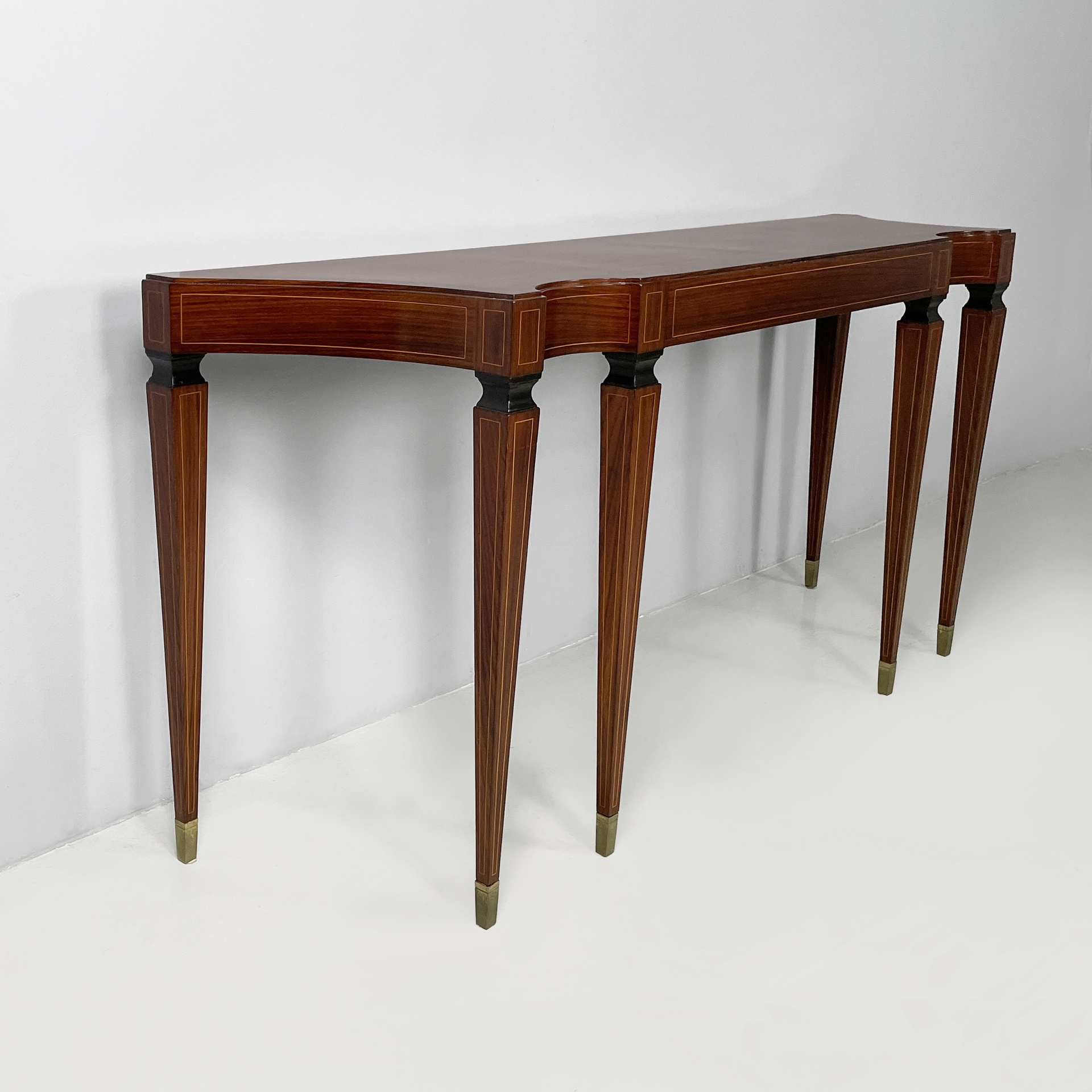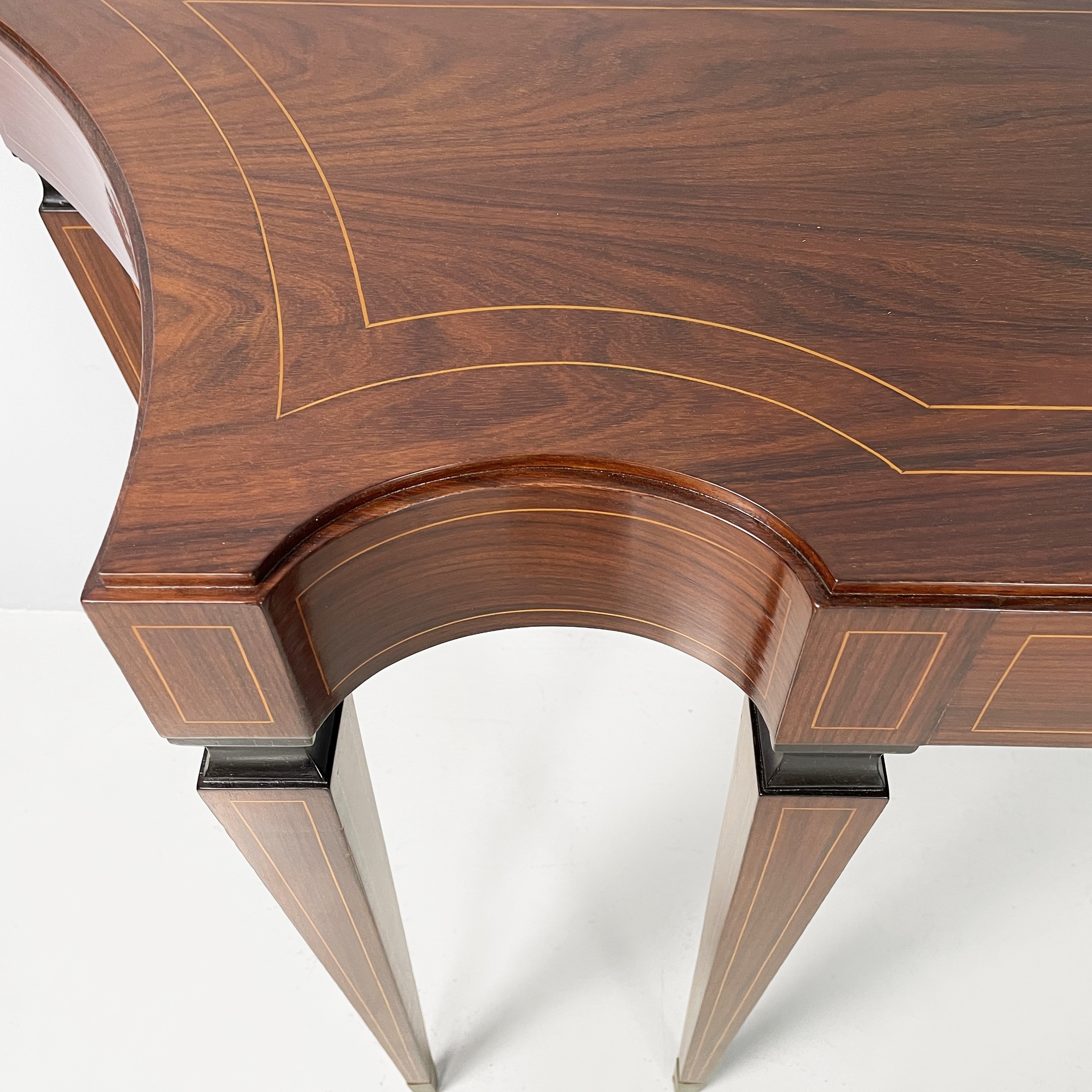 Consolle in legno. Il piano sagomato presenta un decoro in legno chiaro. Le sei zampe sono in legno con decoro in legno chiaro e con piedini a base squadrata in ottone.