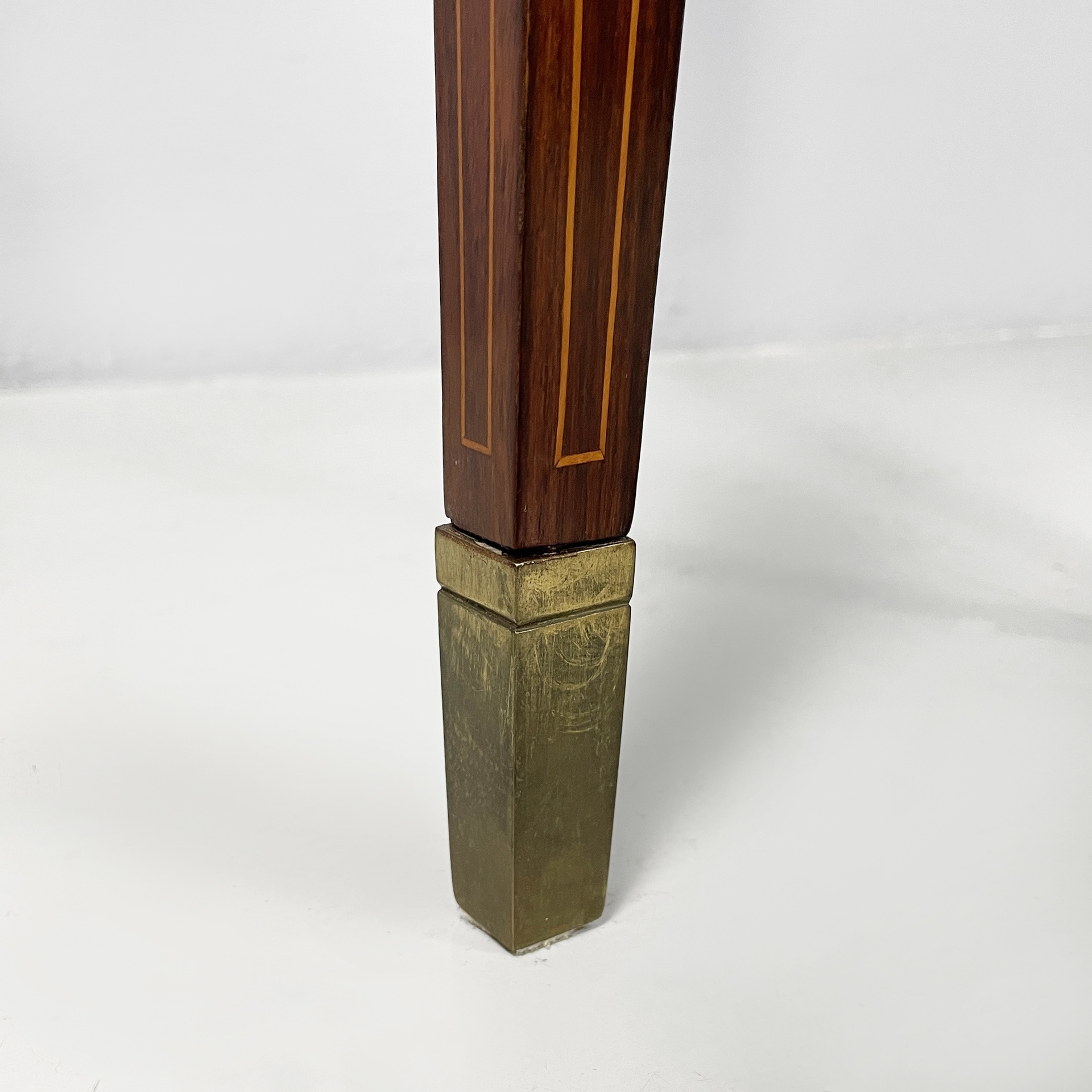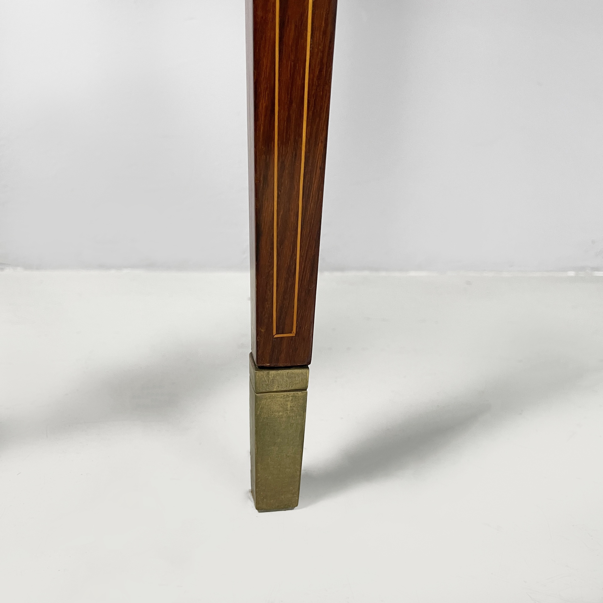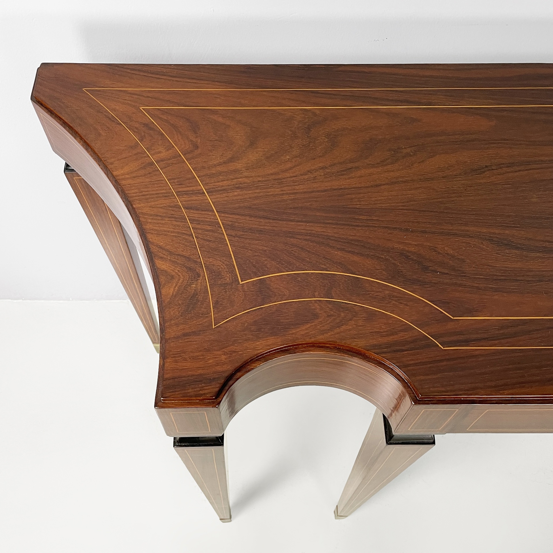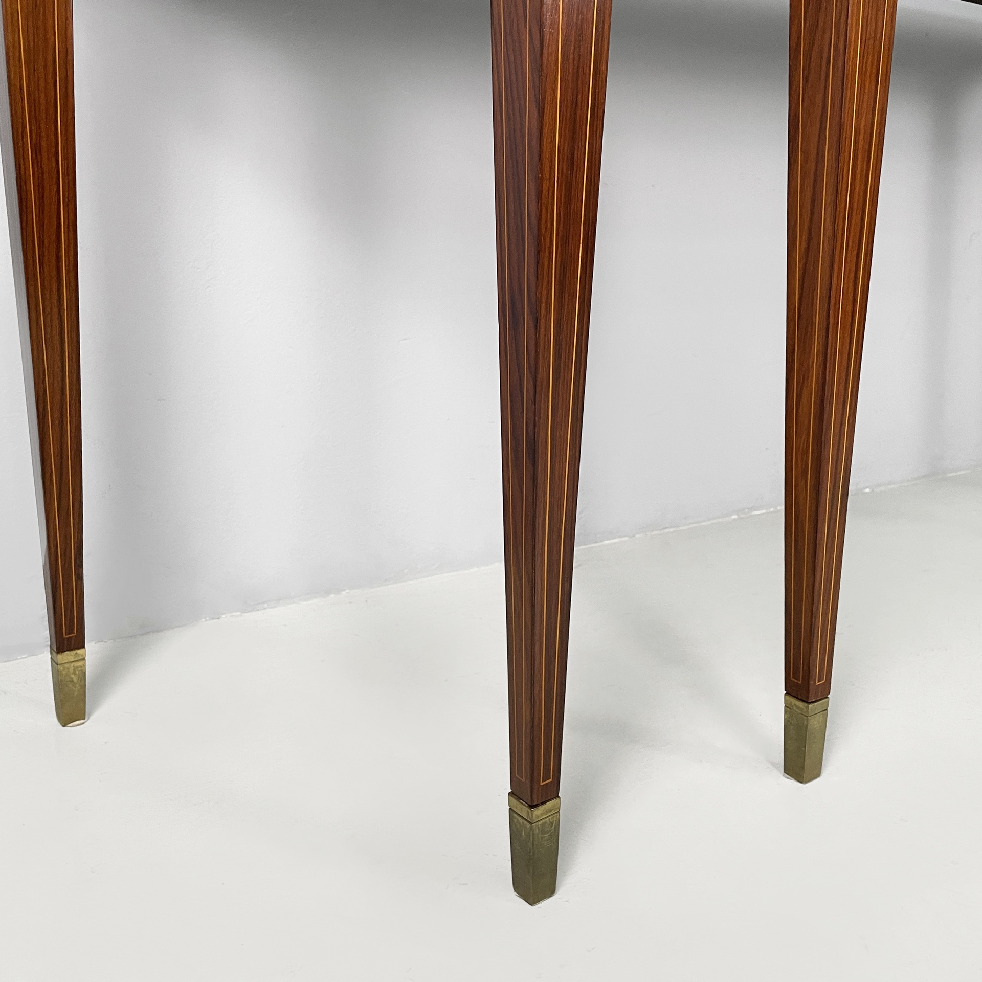 Consolle in legno. Il piano sagomato presenta un decoro in legno chiaro. Le sei zampe sono in legno con decoro in legno chiaro e con piedini a base squadrata in ottone.