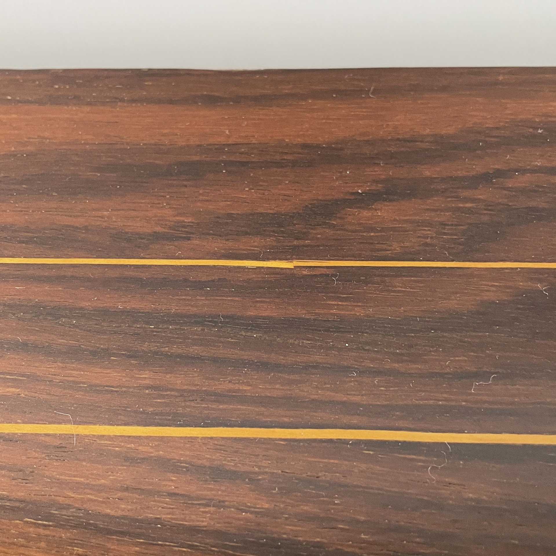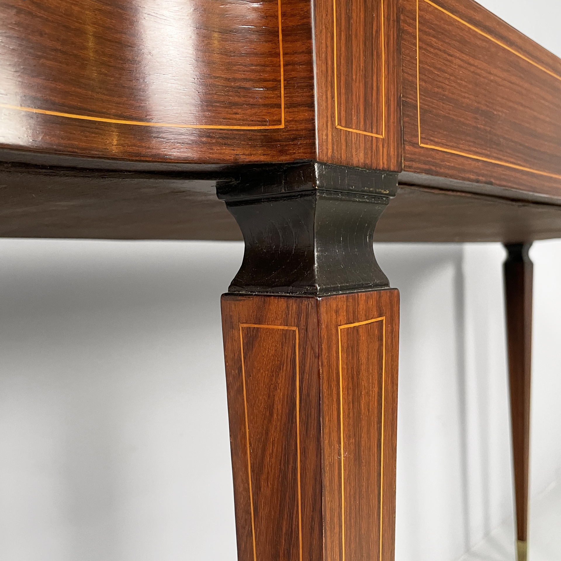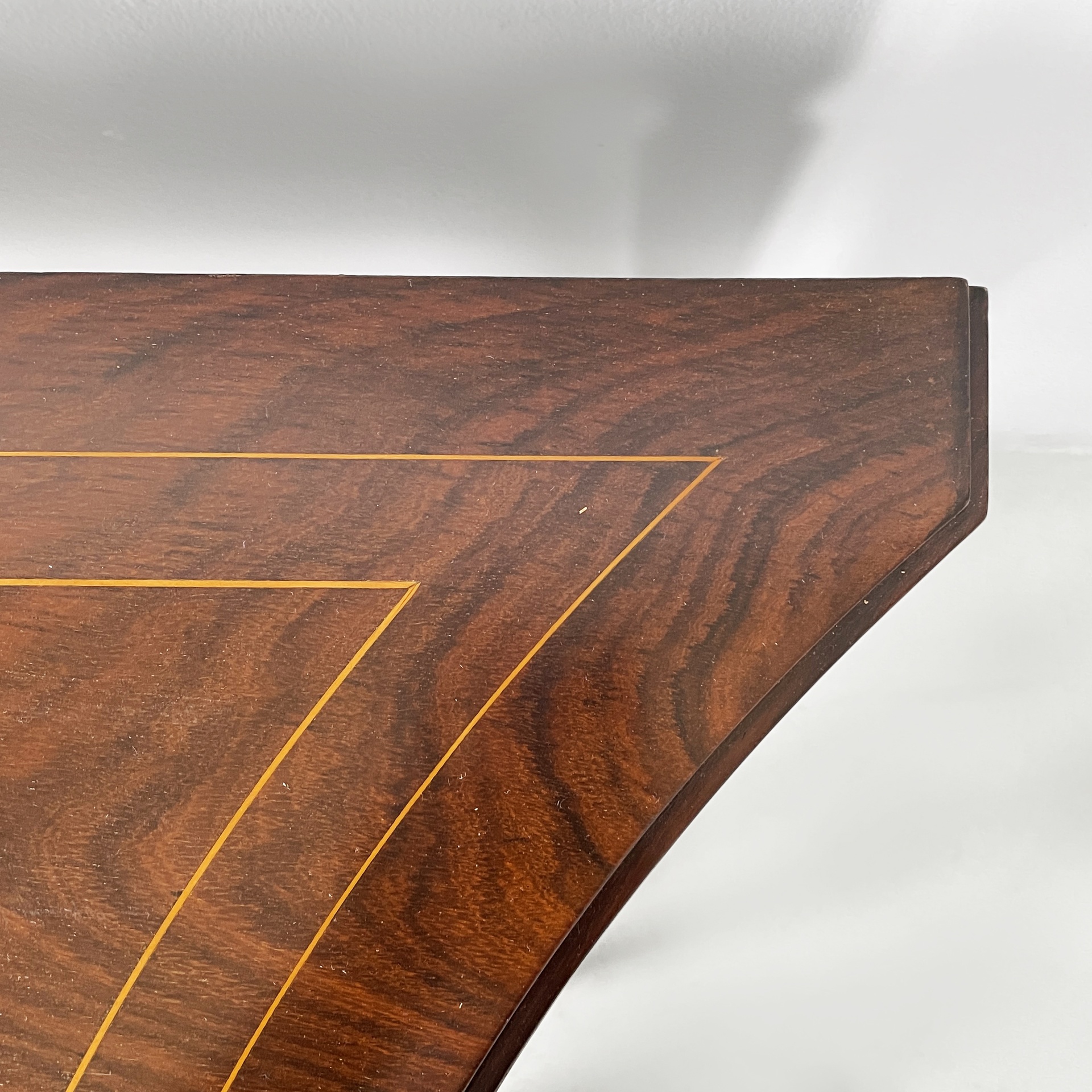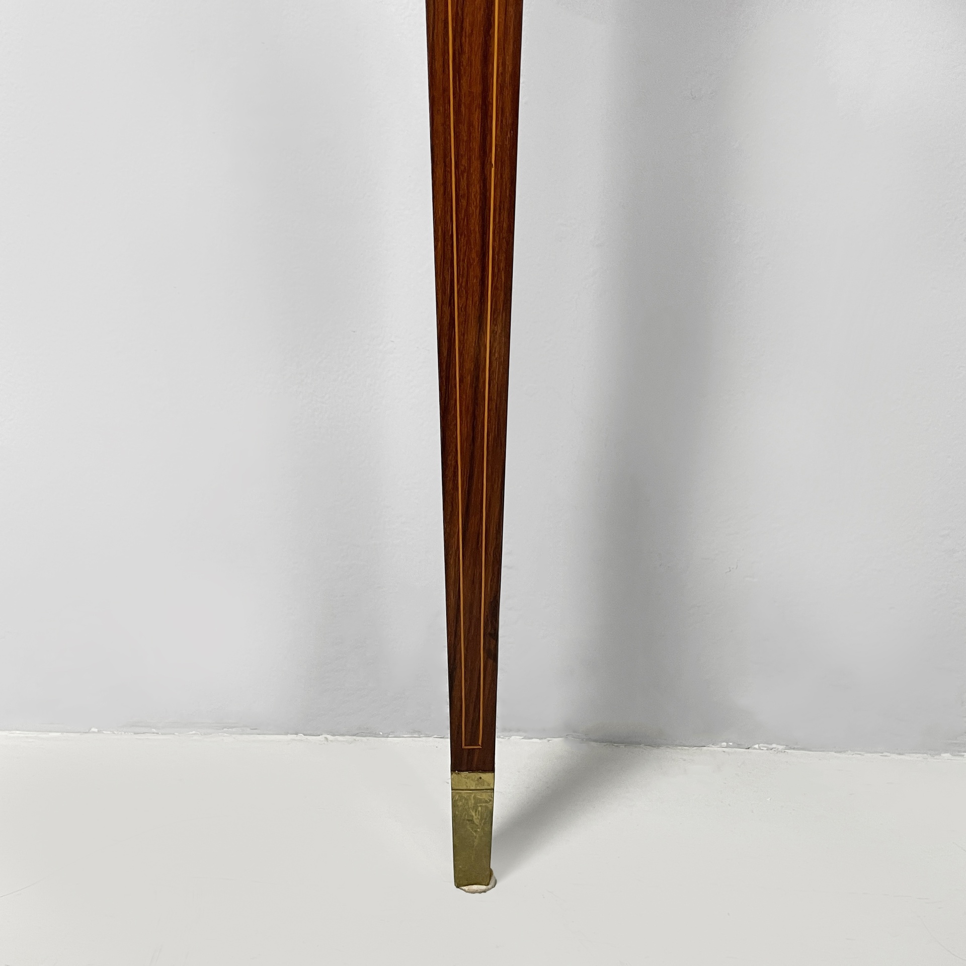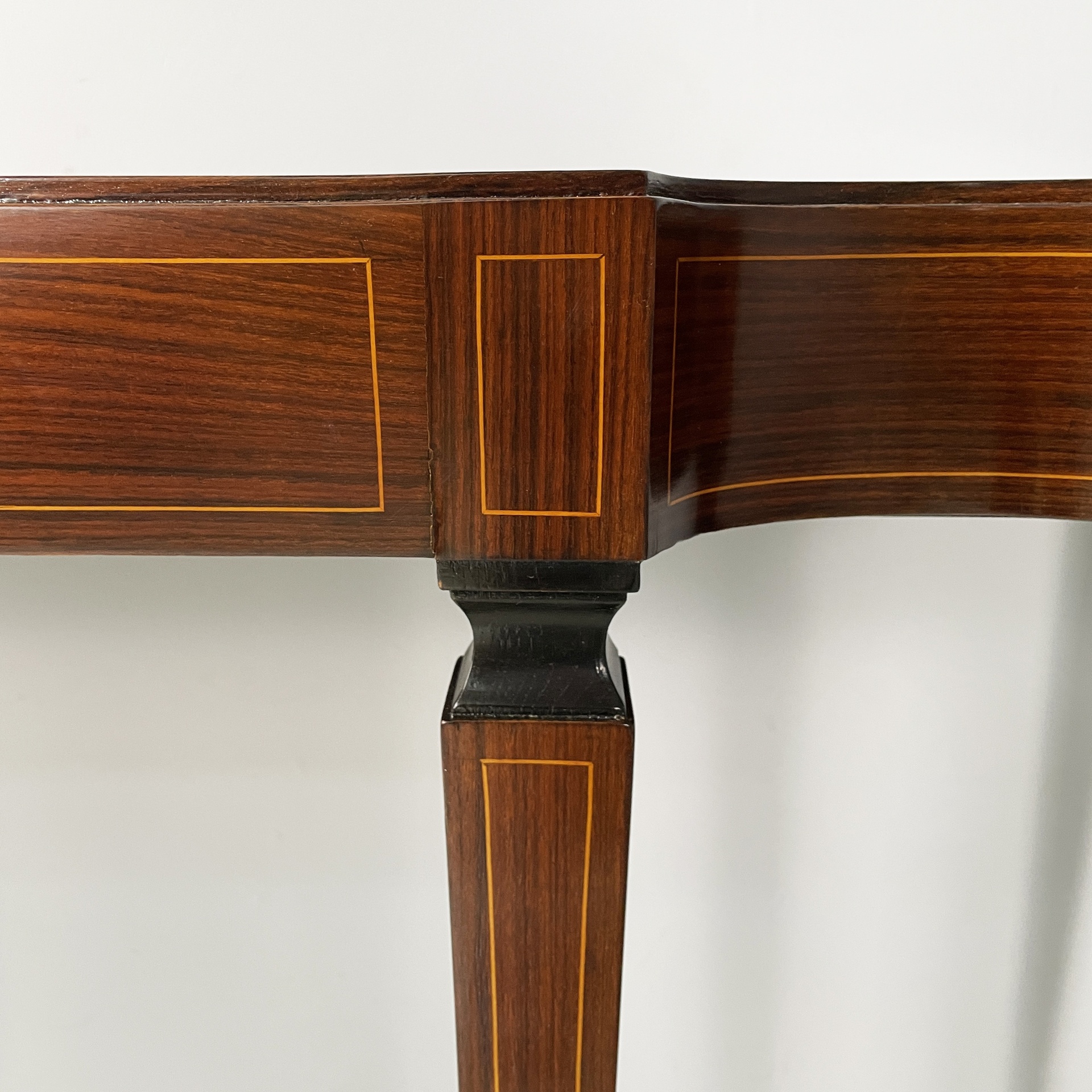 Consolle in legno. Il piano sagomato presenta un decoro in legno chiaro. Le sei zampe sono in legno con decoro in legno chiaro e con piedini a base squadrata in ottone.