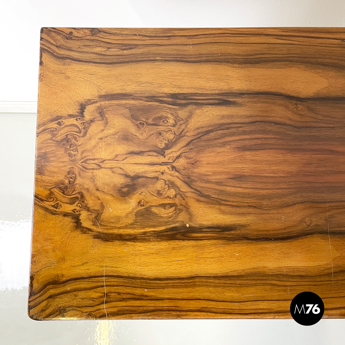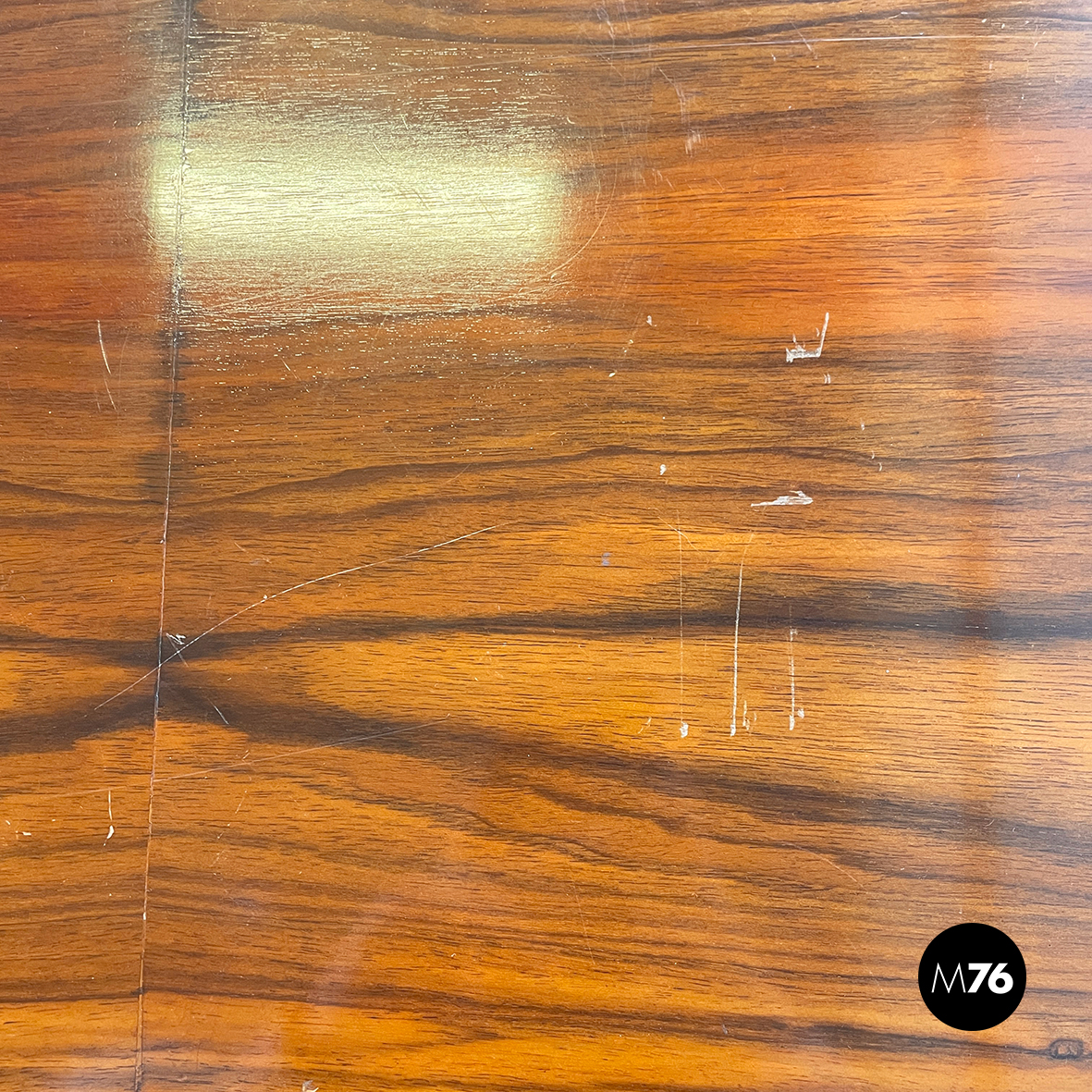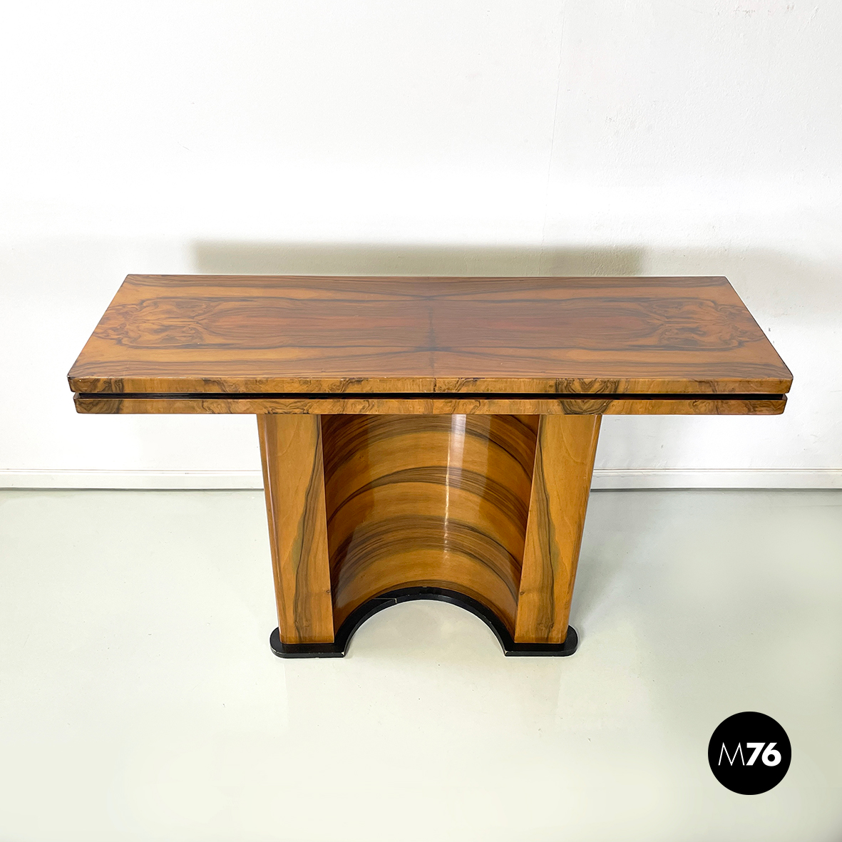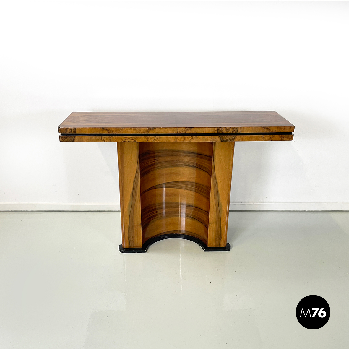 Consolle con piano rettangolare, interamente in legno con finitura lucida. Il piano presenta il fronte con angoli arrotondati e nel centro una rientranza decorativa in legno verniciato nero. La basa a semi-cerchio termina con una rifinitura a sbalzo in legno verniciato nero.