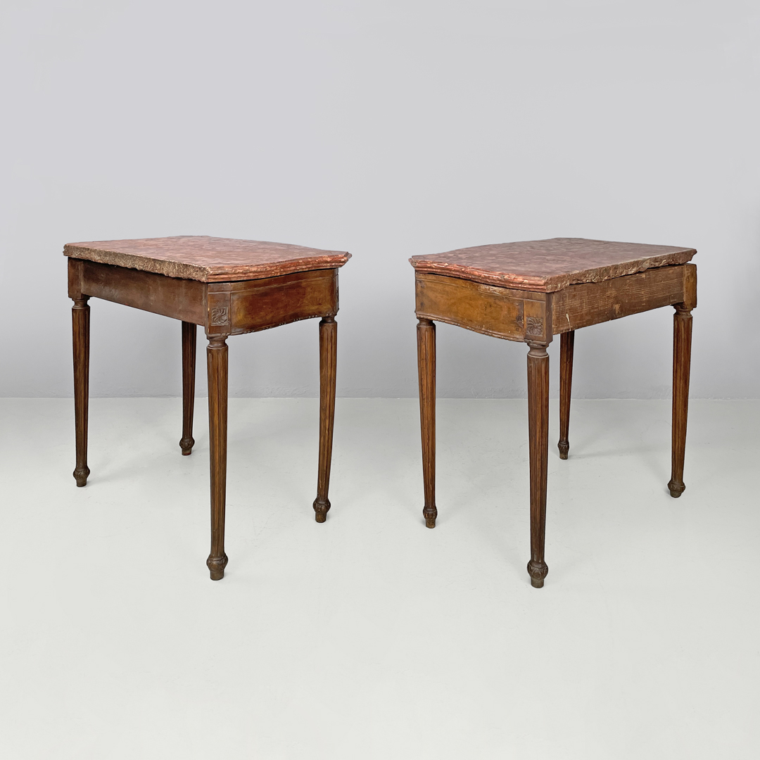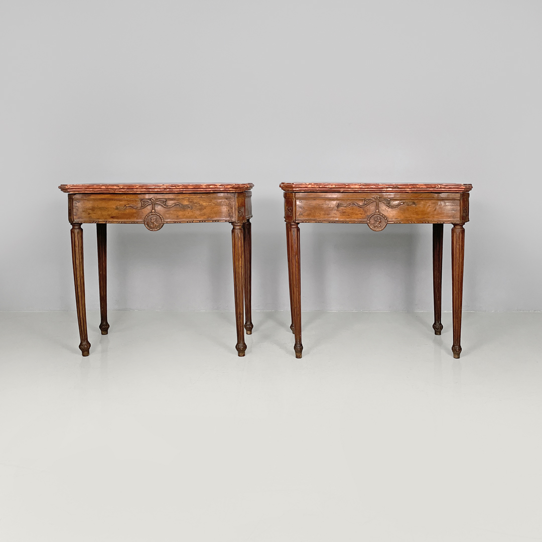 Coppia di consolle con piano in marmo rosso di Verona. Il piano presenta i profili sagomati, con gli angoli tagliati in diagonale. Sotto al piano sono presenti degli intagli decorativi rappresentanti un medaglione con un ritratto di uomo e di donna, mentre agli angoli si trovano delle decorazioni floreali. Le quattro gambe a sezione tonda presentano intagli verticali, e terminano con piedini tondeggianti.