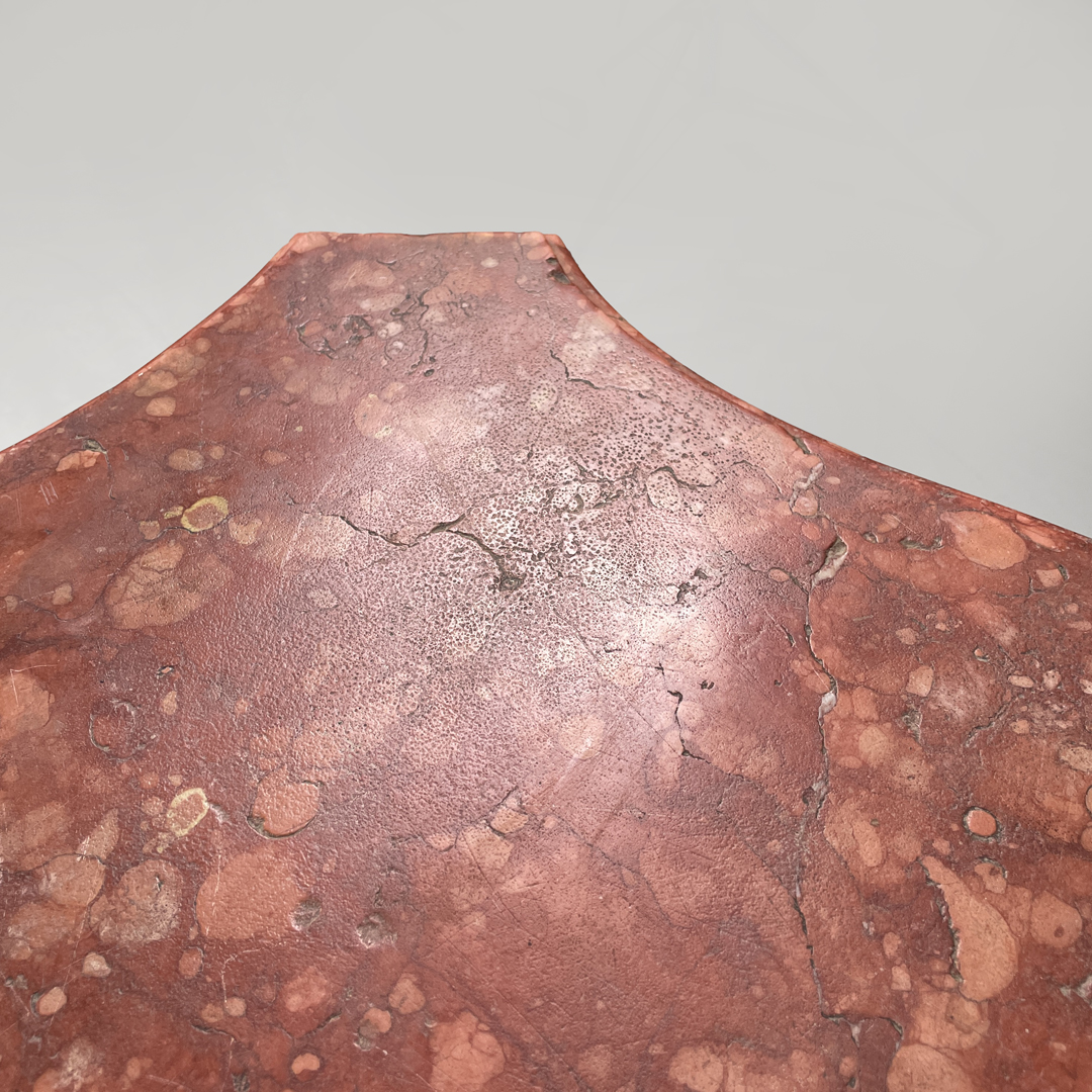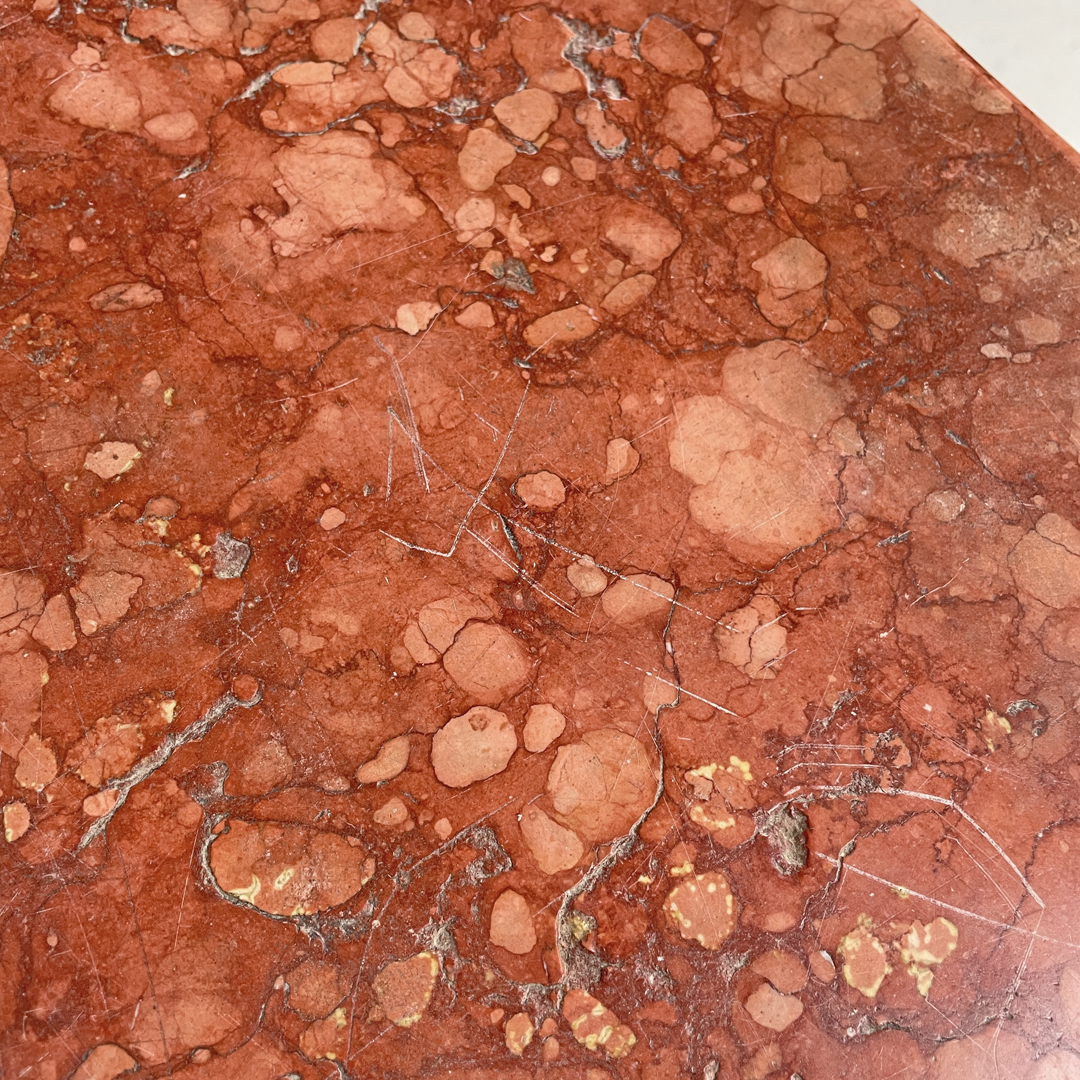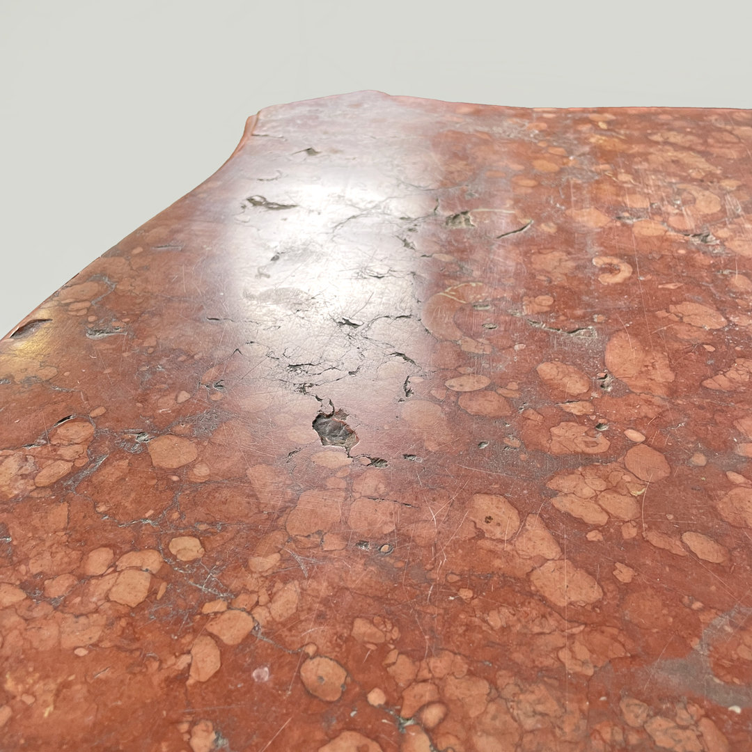 Buone condizioni, con segni dell’uso e del tempo, il marmo presenta mancanze, fori, graffi ed opacizzazioni. Le gambe, una in particolare, sono leggermente inarcate.