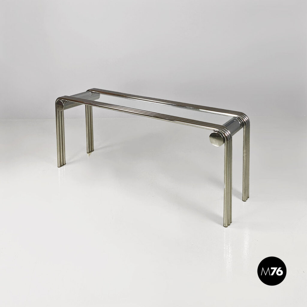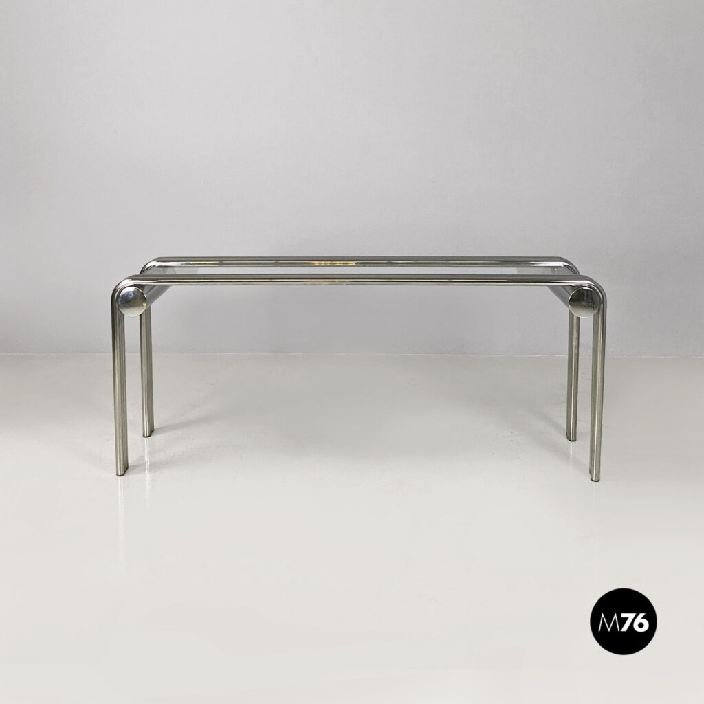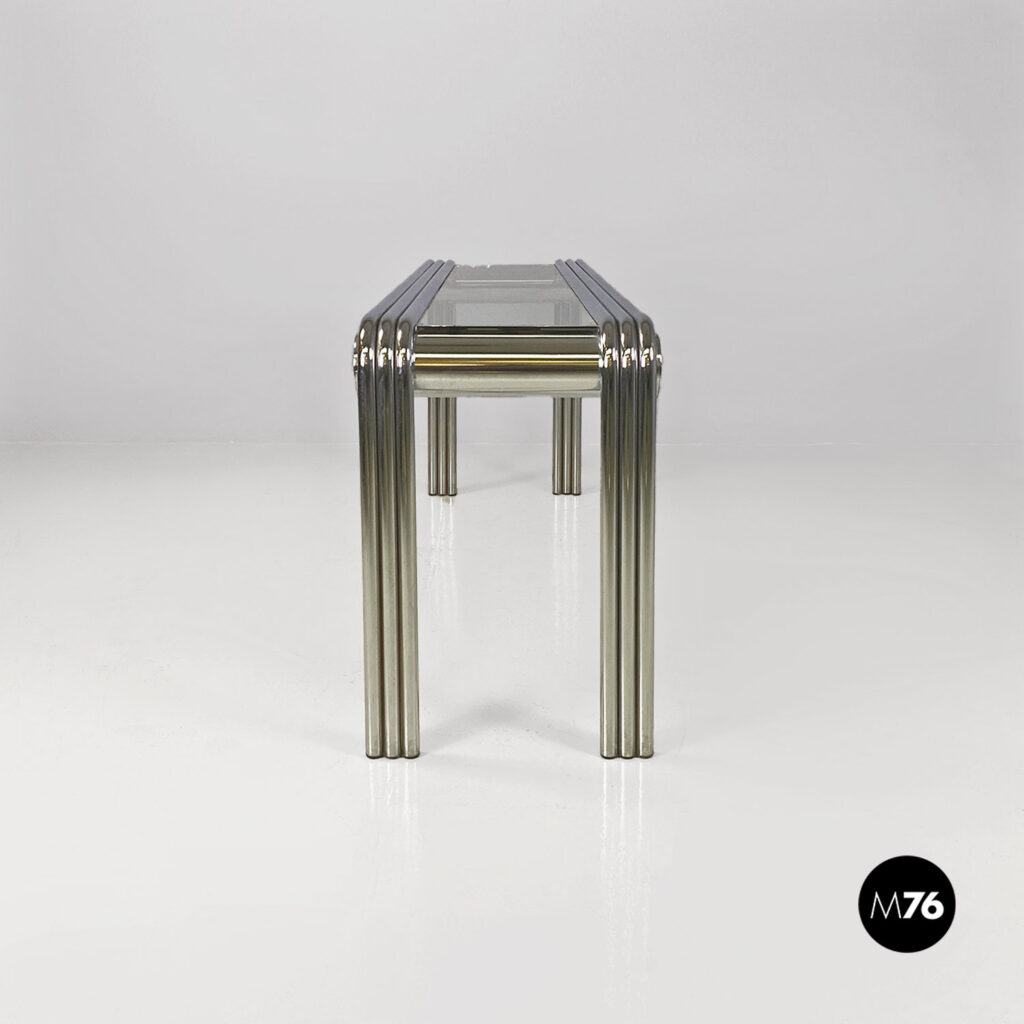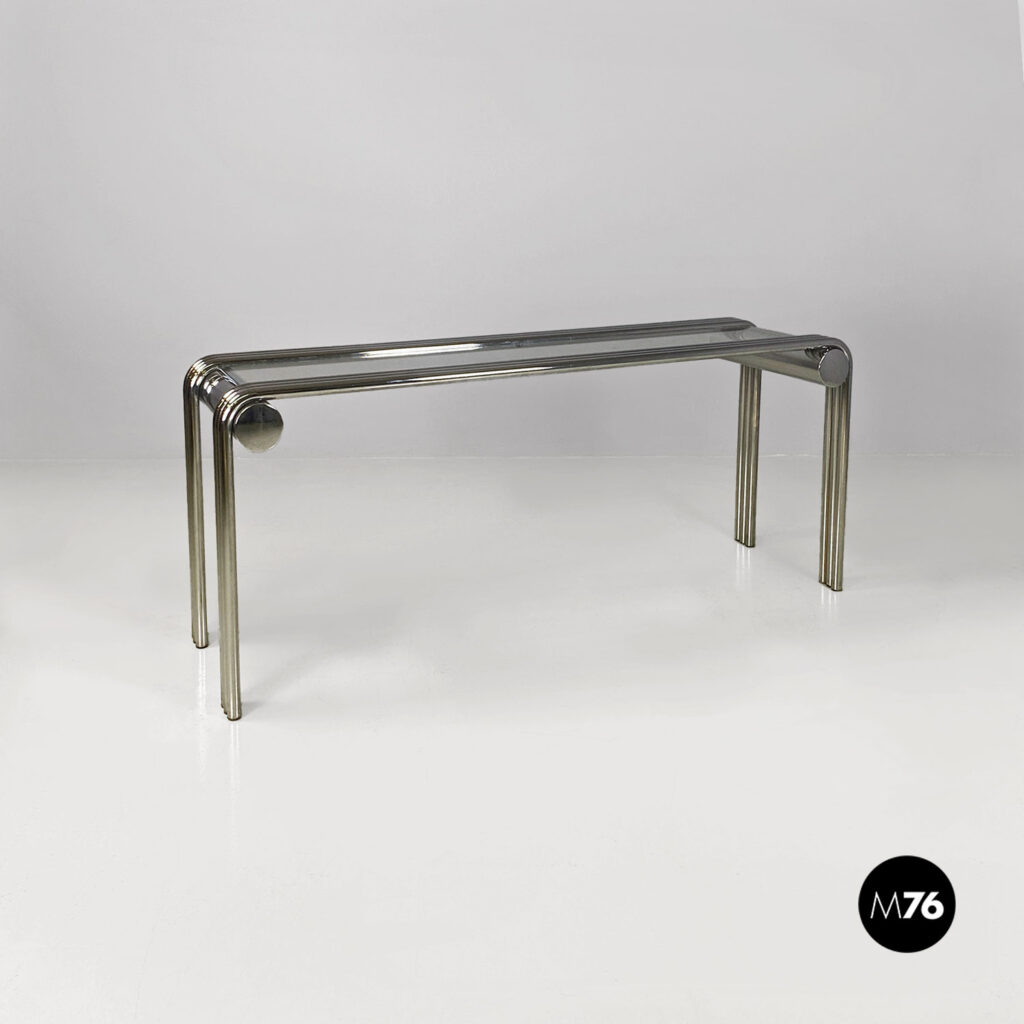 Consolle con piano rettangolare in vetro e con struttura composta da sei tubolari in metallo cromato divisi su due lati, che vanno a creare quattro gambe da tre tubolari ciascuna e fungono anche da bordo del piano in vetro. Nell’angolo tra la gamba e la parte sottostante del tavolo si trovano due elementi decorativi tubolari sempre in metallo cromato. L’appoggio a terra è dato da quattro piedini sottili, in plastica nera.