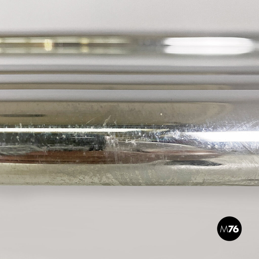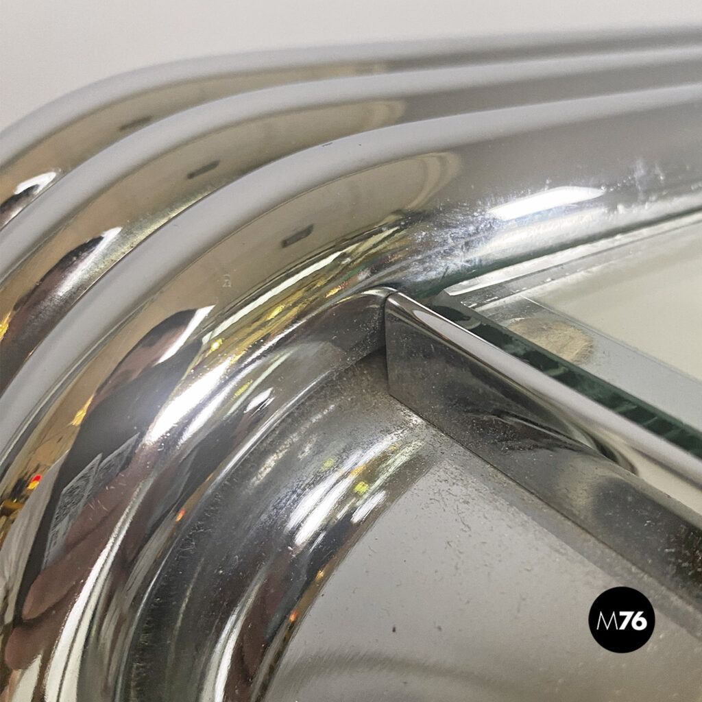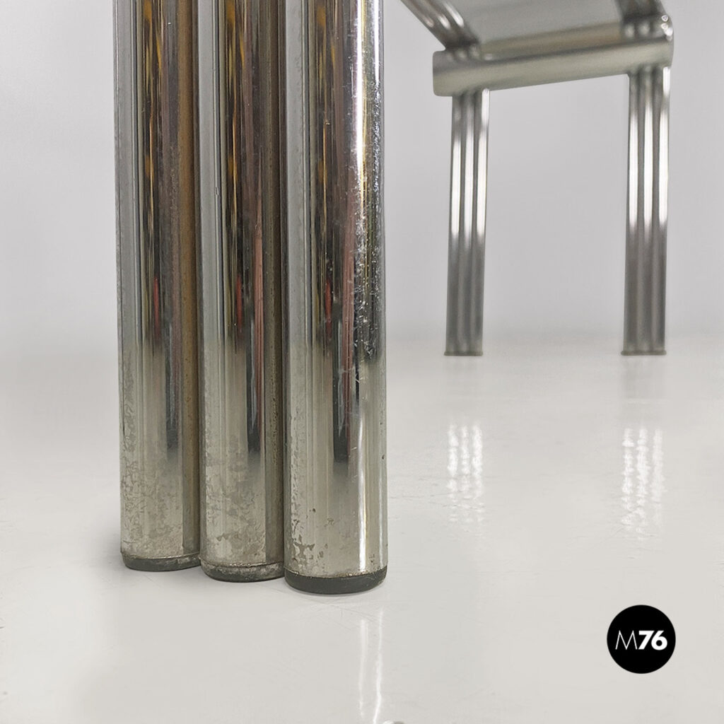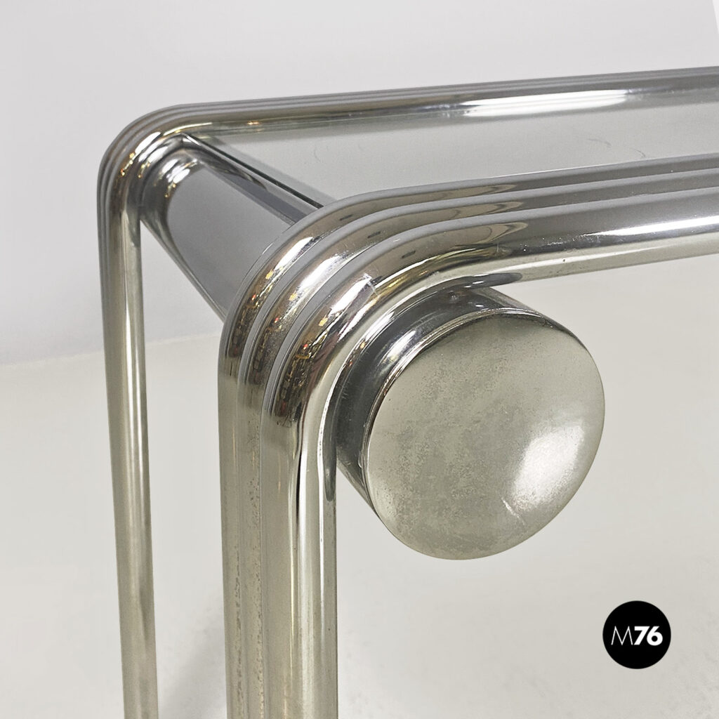 Consolle con piano rettangolare in vetro e con struttura composta da sei tubolari in metallo cromato divisi su due lati, che vanno a creare quattro gambe da tre tubolari ciascuna e fungono anche da bordo del piano in vetro. Nell’angolo tra la gamba e la parte sottostante del tavolo si trovano due elementi decorativi tubolari sempre in metallo cromato. L’appoggio a terra è dato da quattro piedini sottili, in plastica nera.