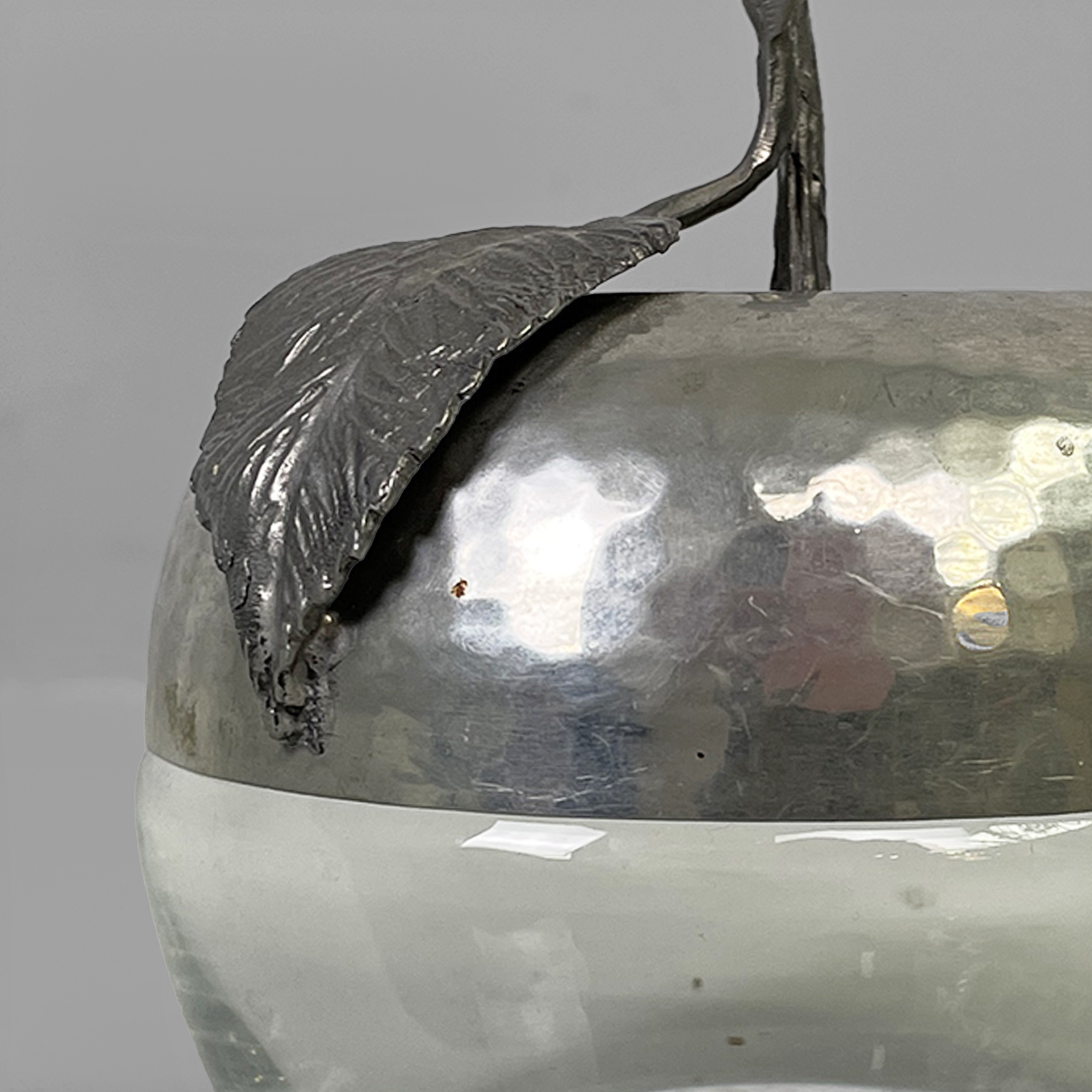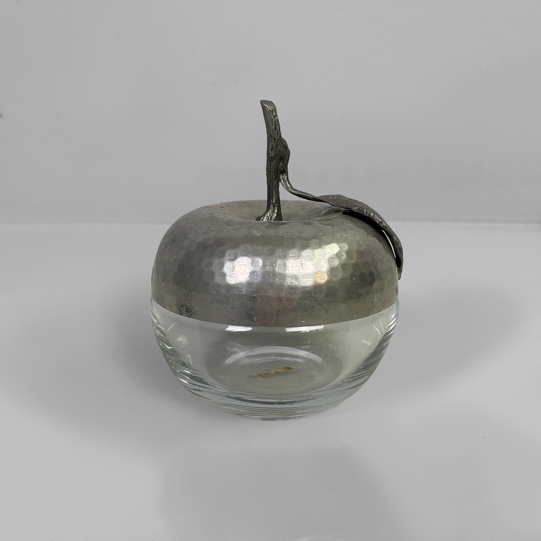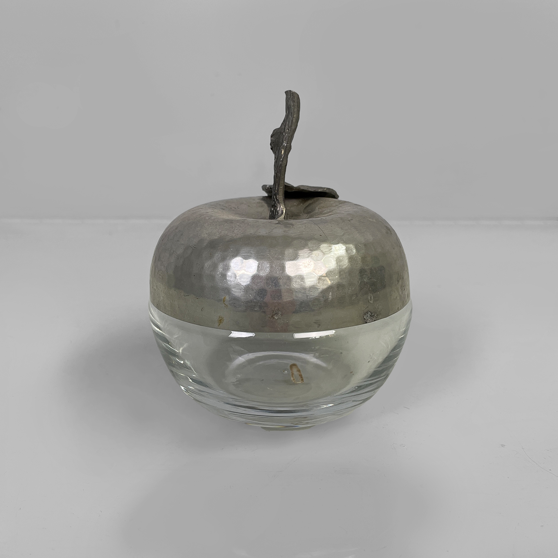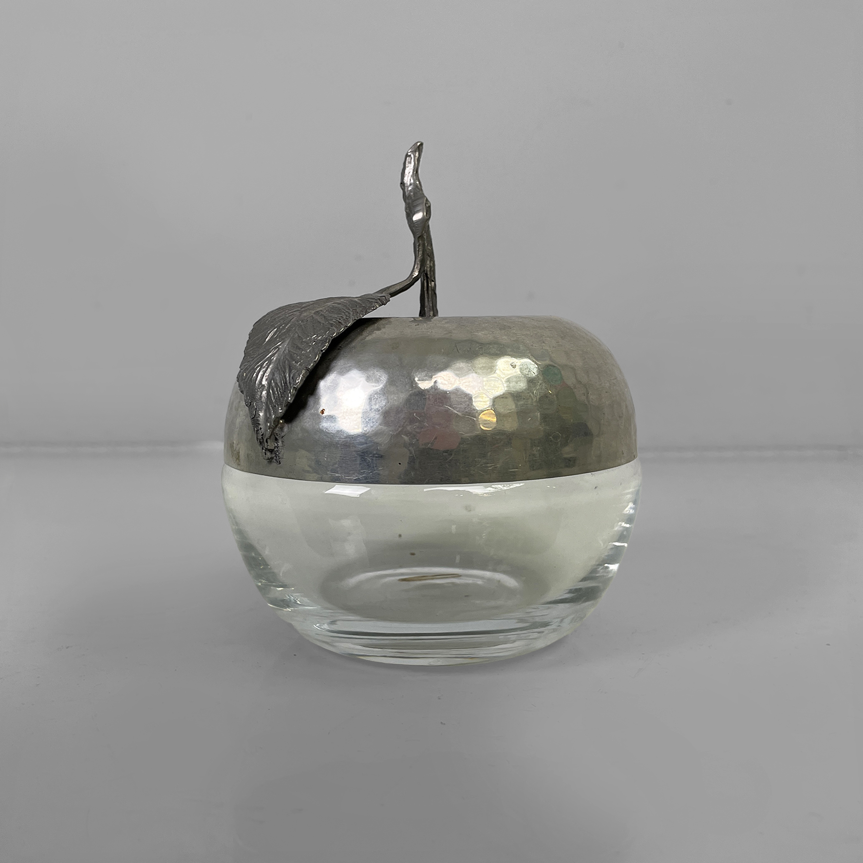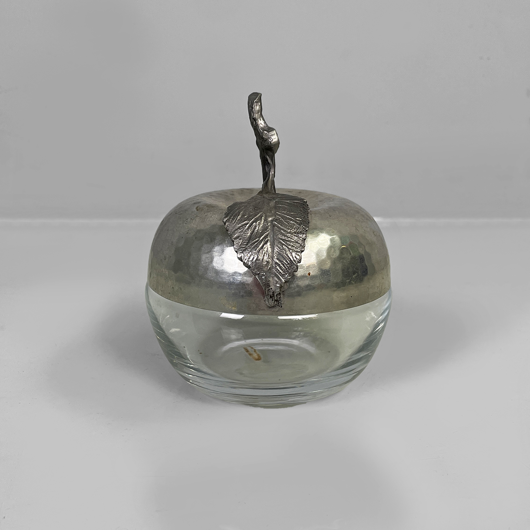 Contenitore in vetro e metallo a forma di mela. Presenta un corpo in vetro trasparente e un coperchio in metallo finemente lavorato, impreziosito da una decorazione raffigurante un ramo con foglia.