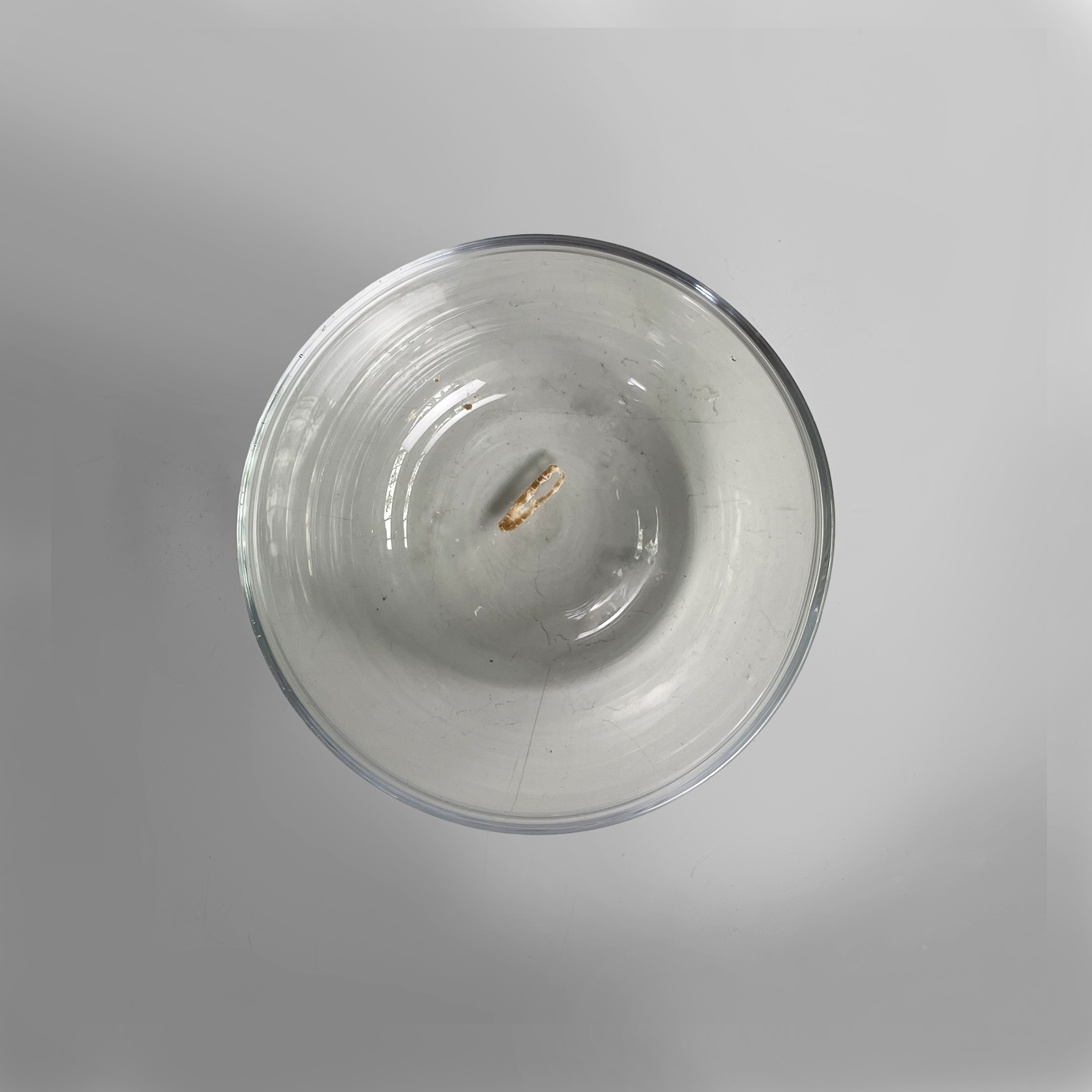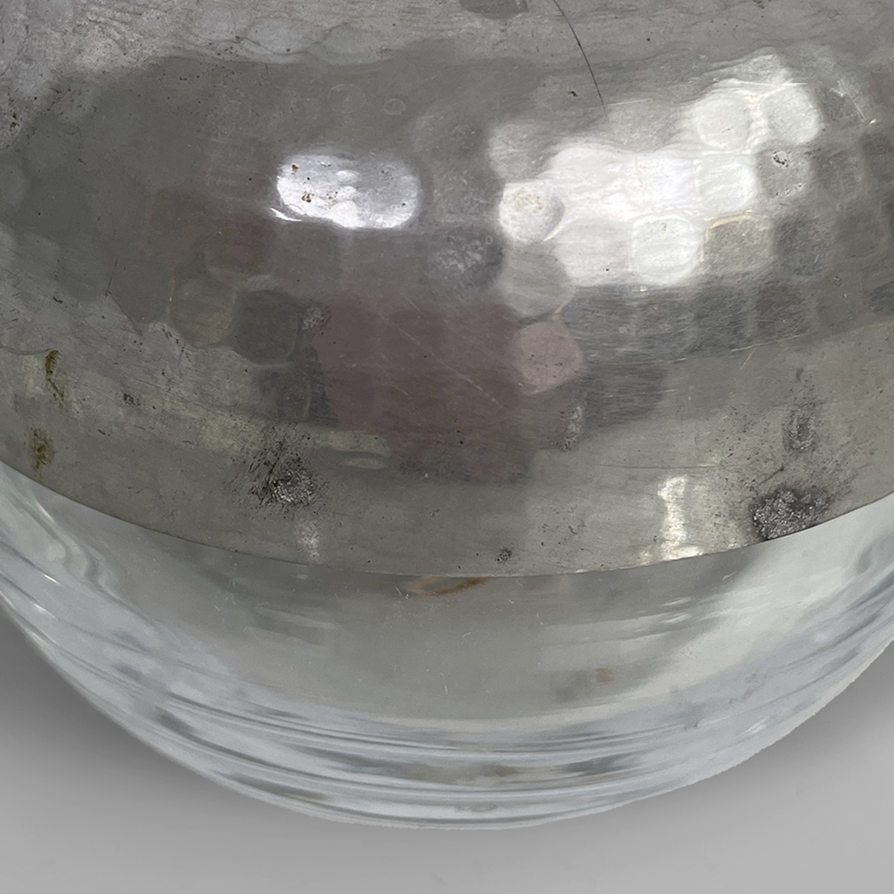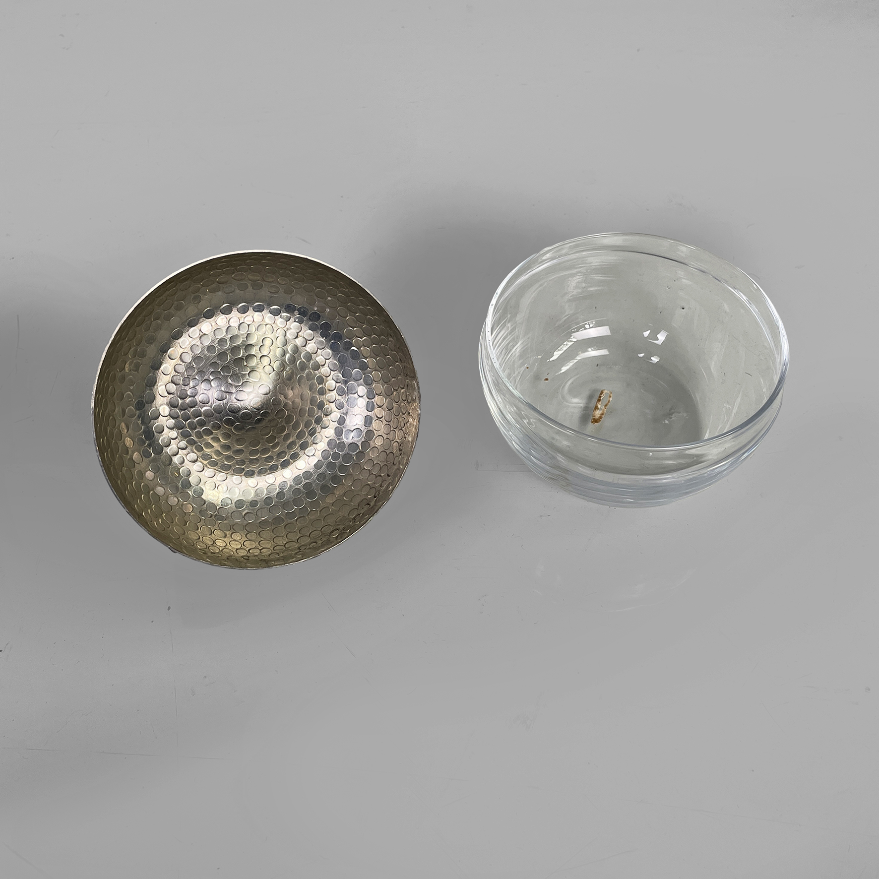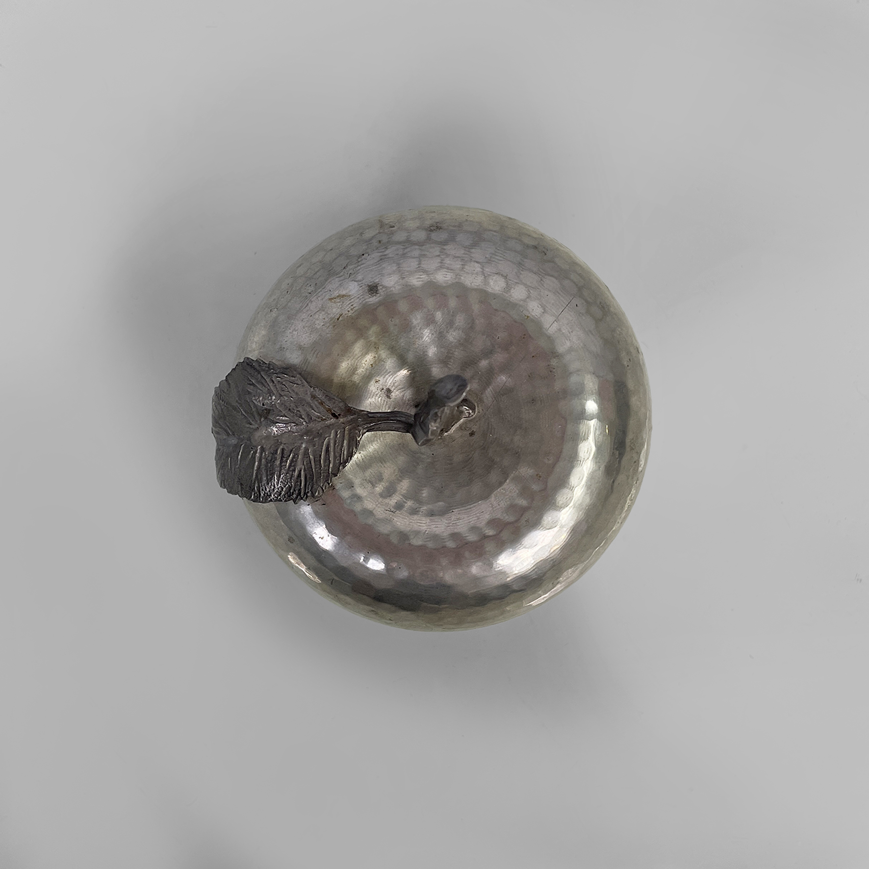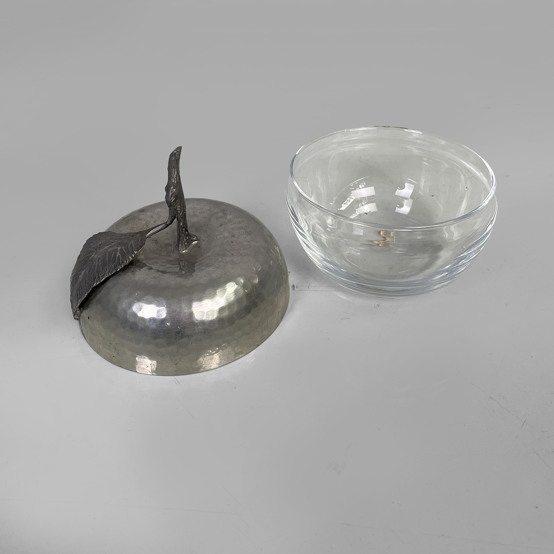 Contenitore in vetro e metallo a forma di mela. Presenta un corpo in vetro trasparente e un coperchio in metallo finemente lavorato, impreziosito da una decorazione raffigurante un ramo con foglia.