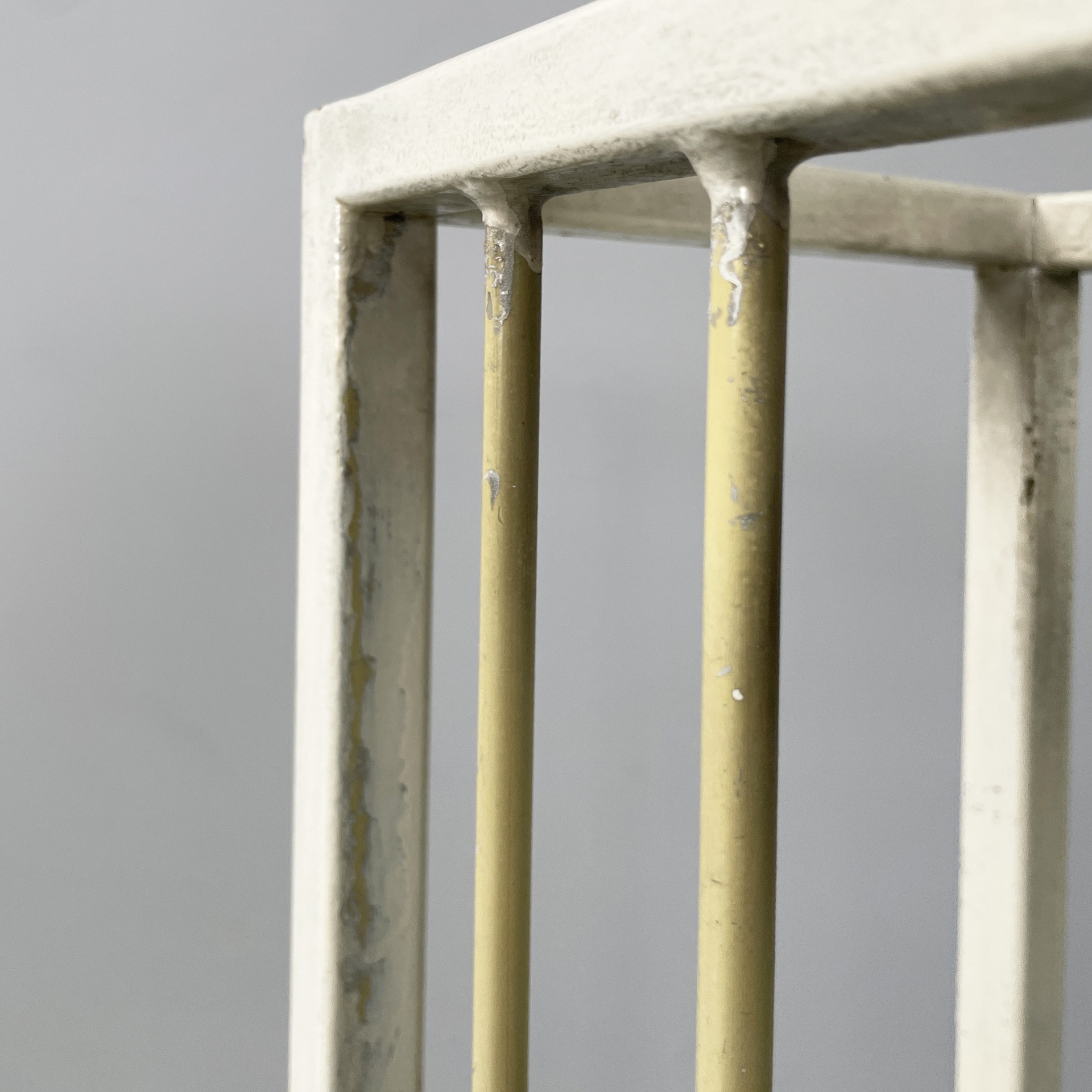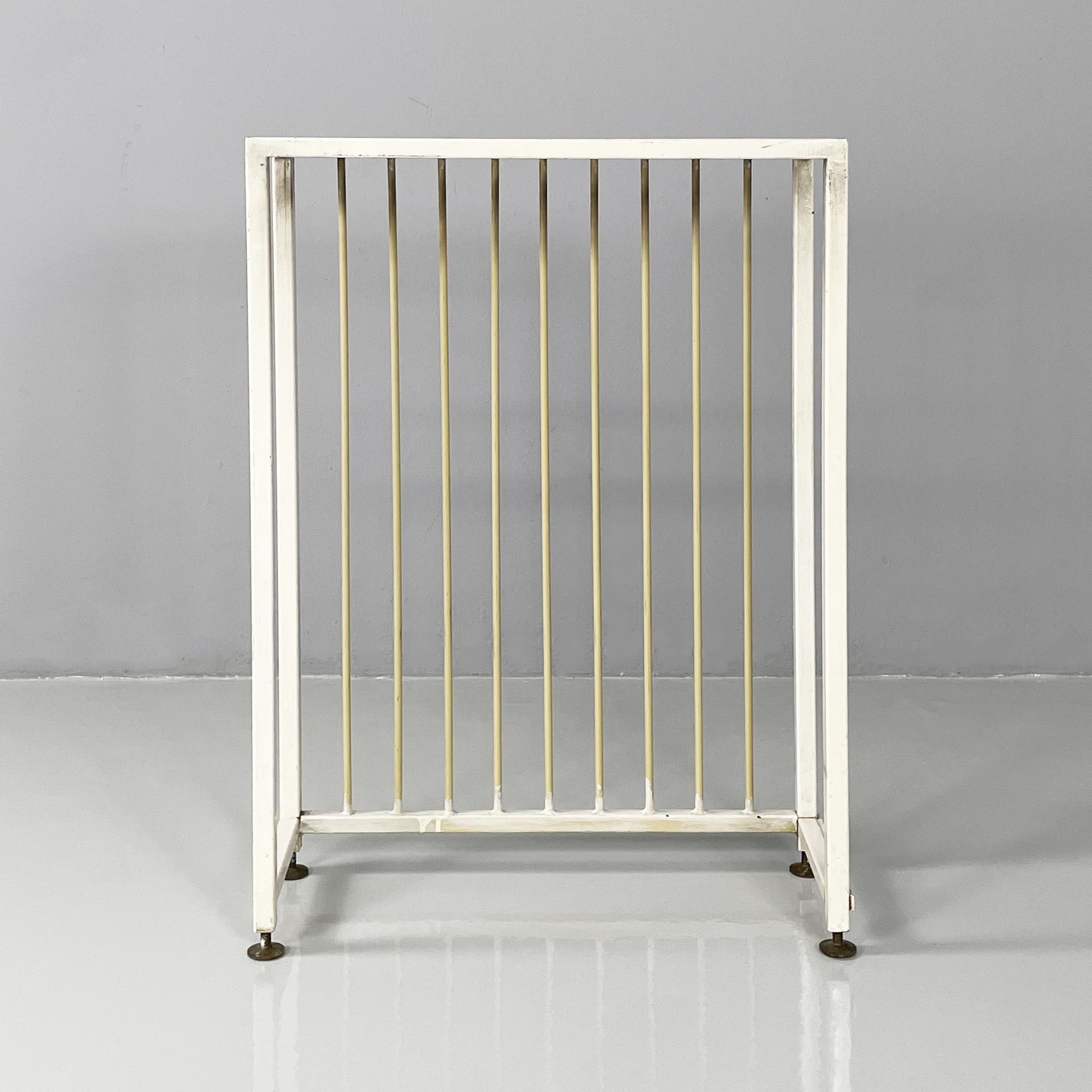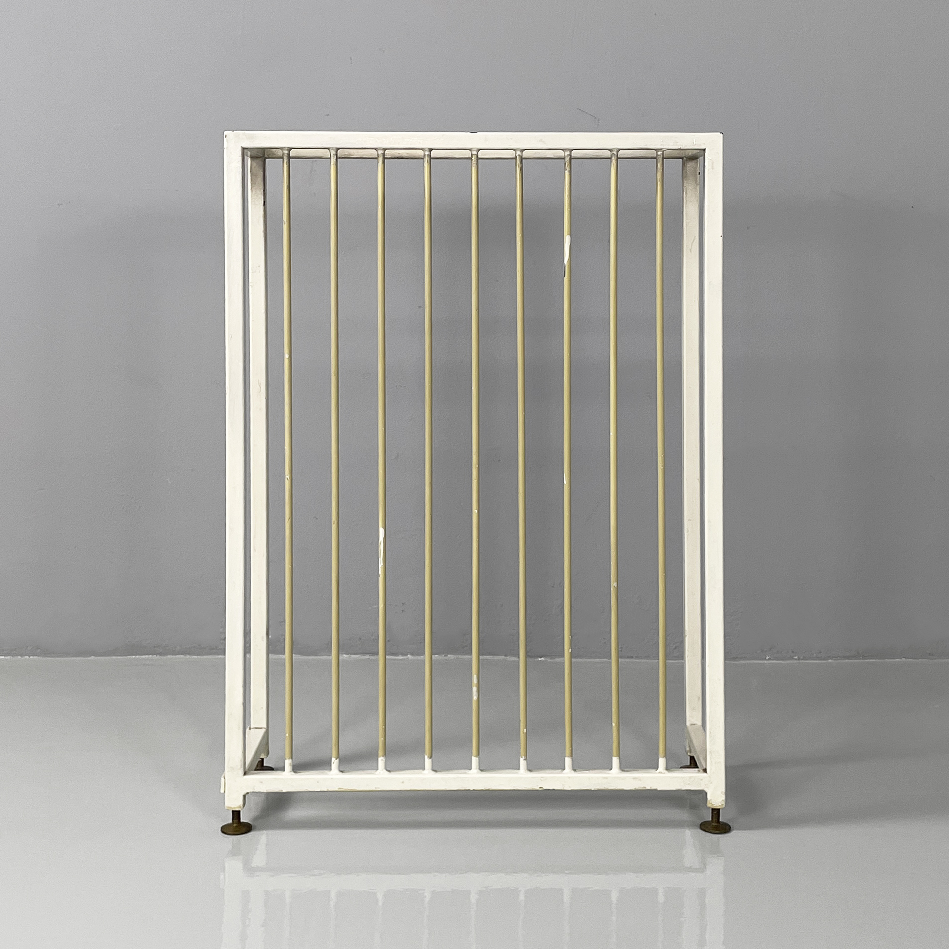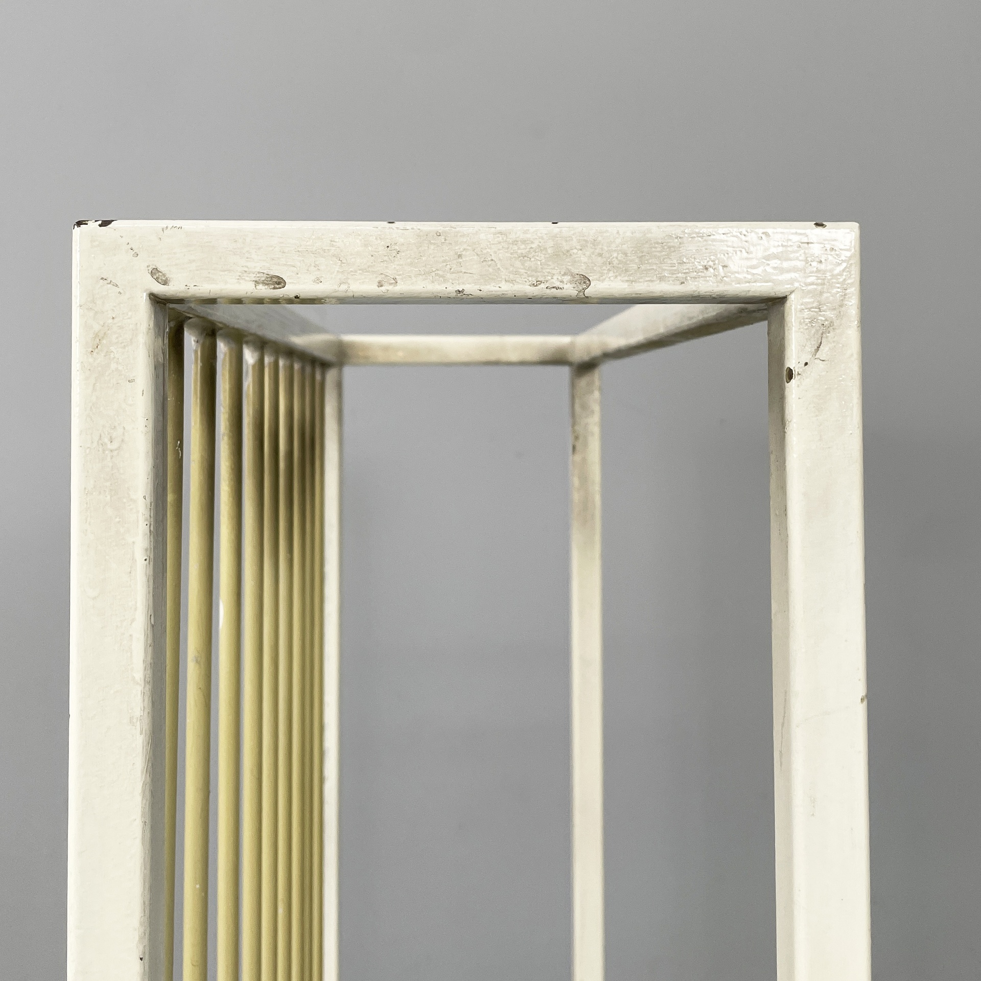 Copricalorifero a base rettangolare, interamente in metallo. La struttura a sezione quadrata in metallo verniciato bianco presenta sul fronte una serie di tondini di metallo verniciato beige. Piedini tondi in metallo.