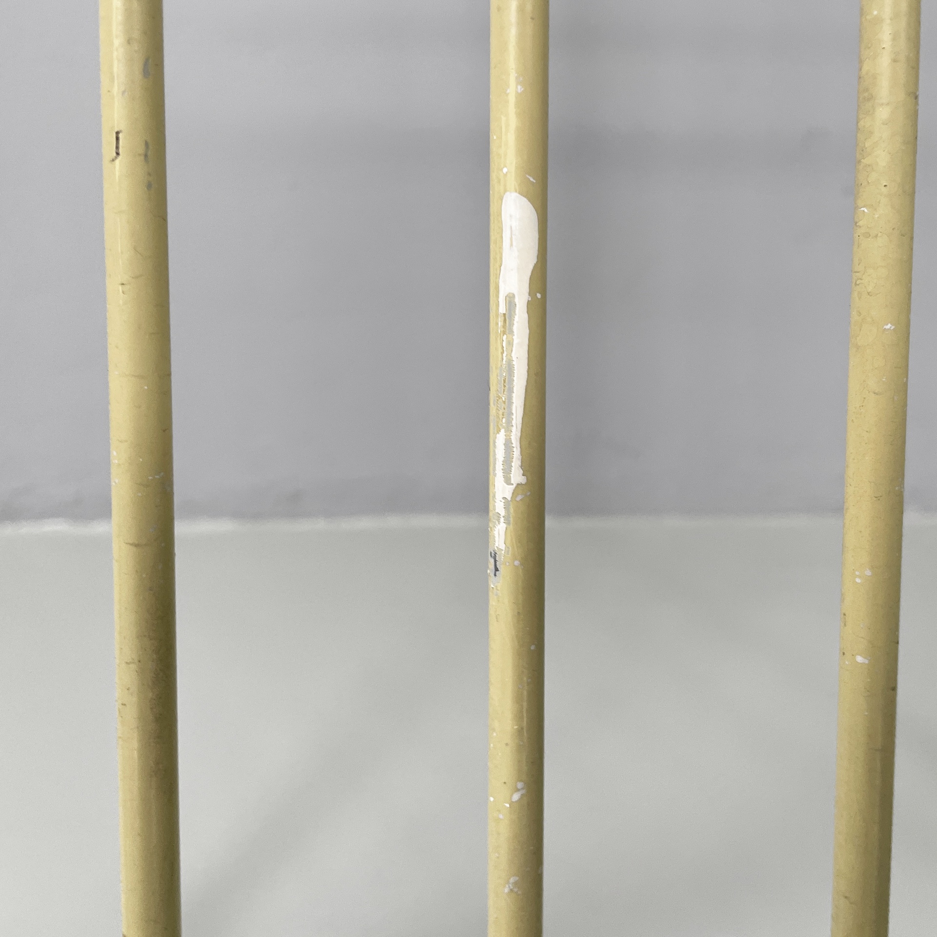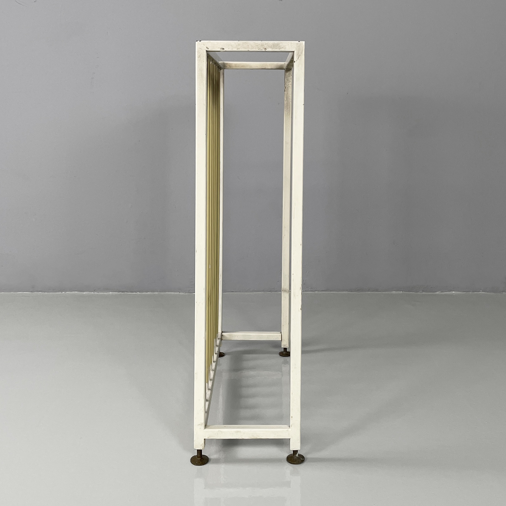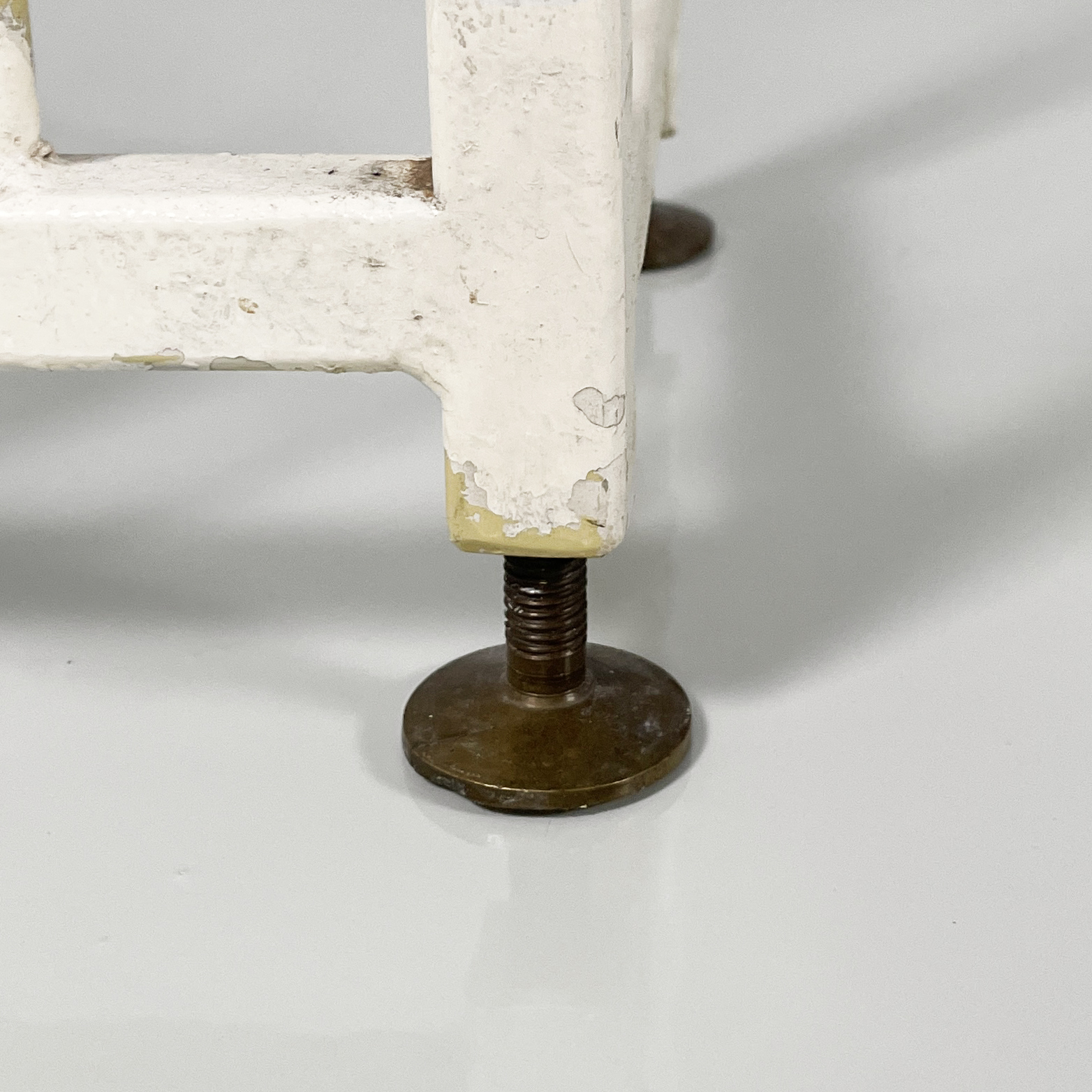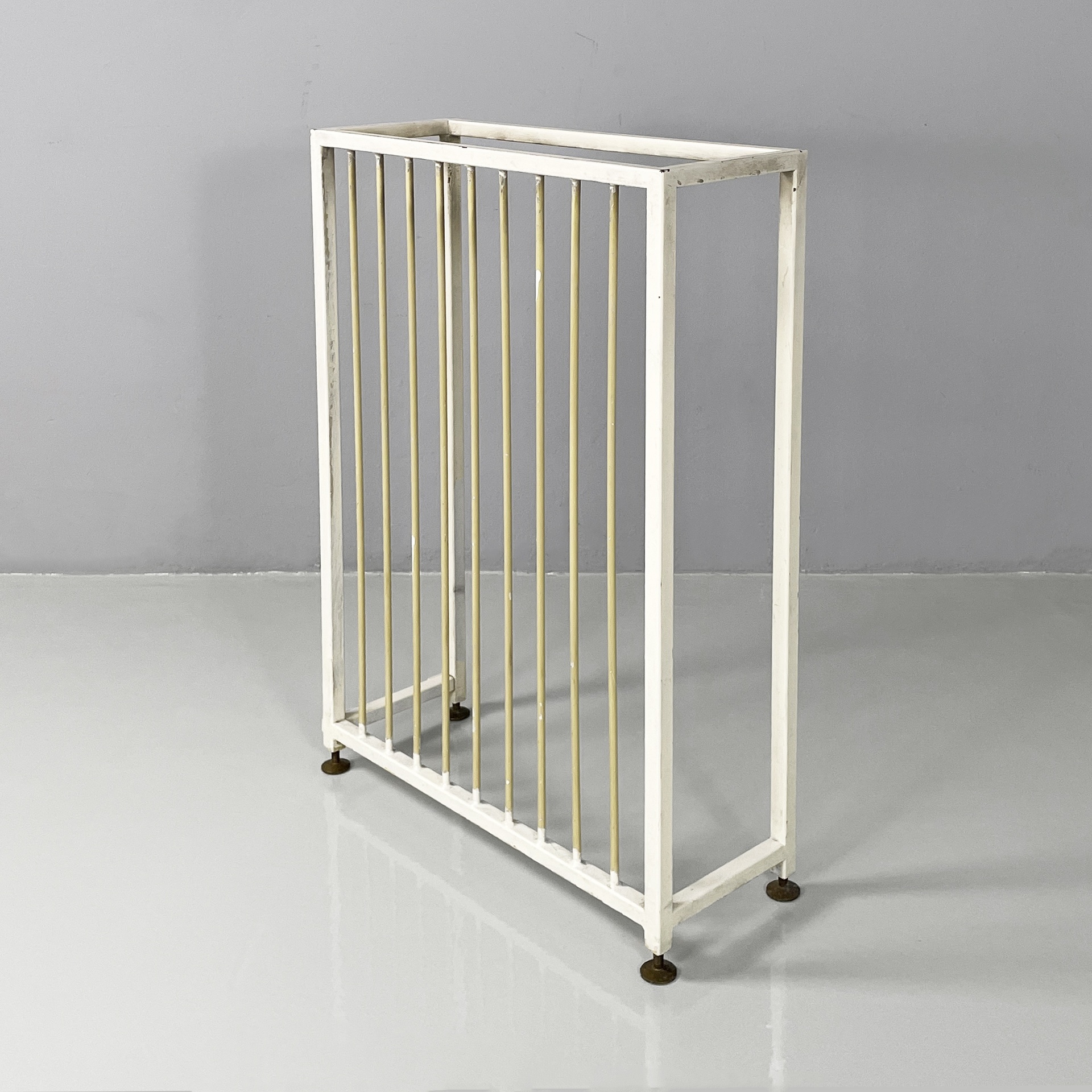 Copricalorifero a base rettangolare, interamente in metallo. La struttura a sezione quadrata in metallo verniciato bianco presenta sul fronte una serie di tondini di metallo verniciato beige. Piedini tondi in metallo.