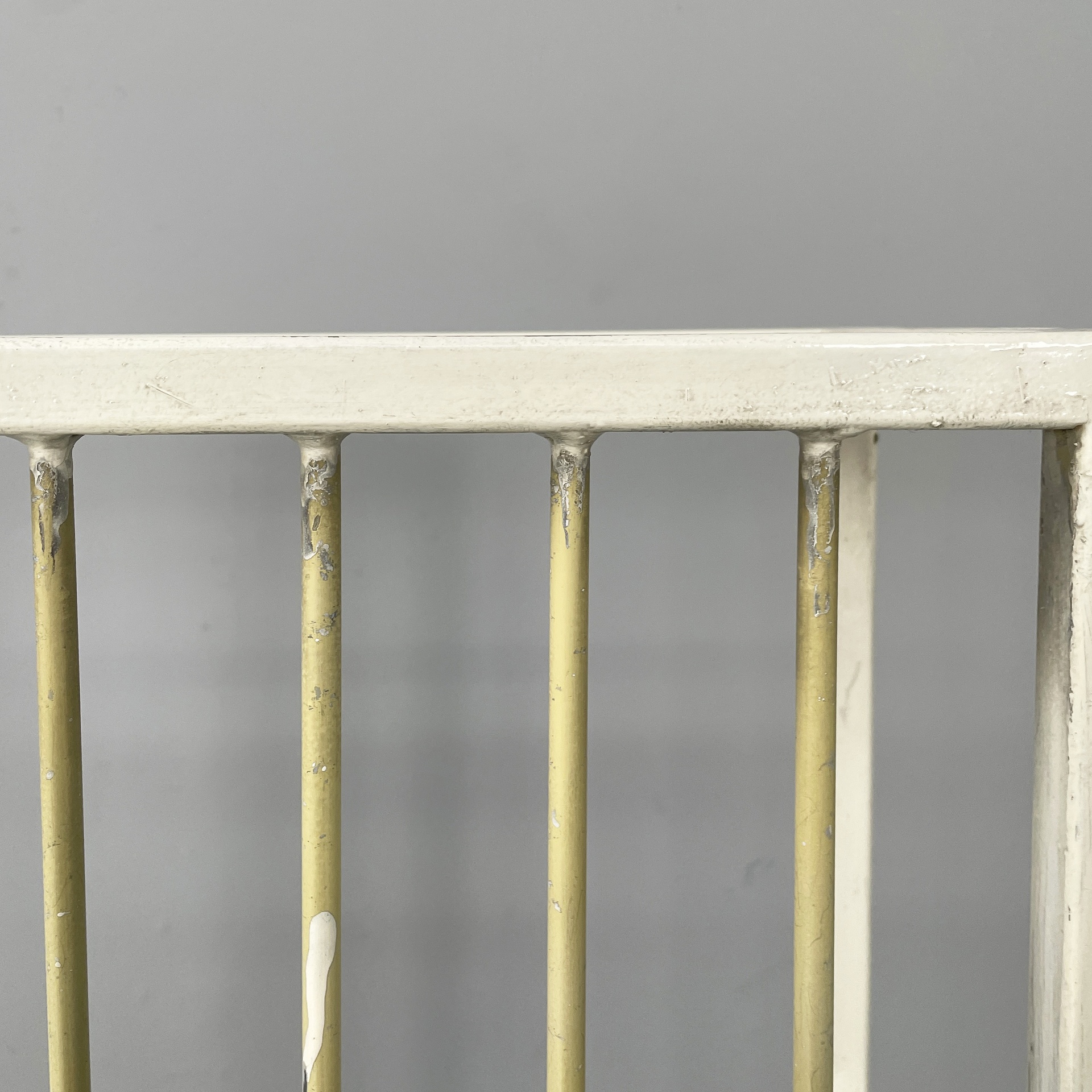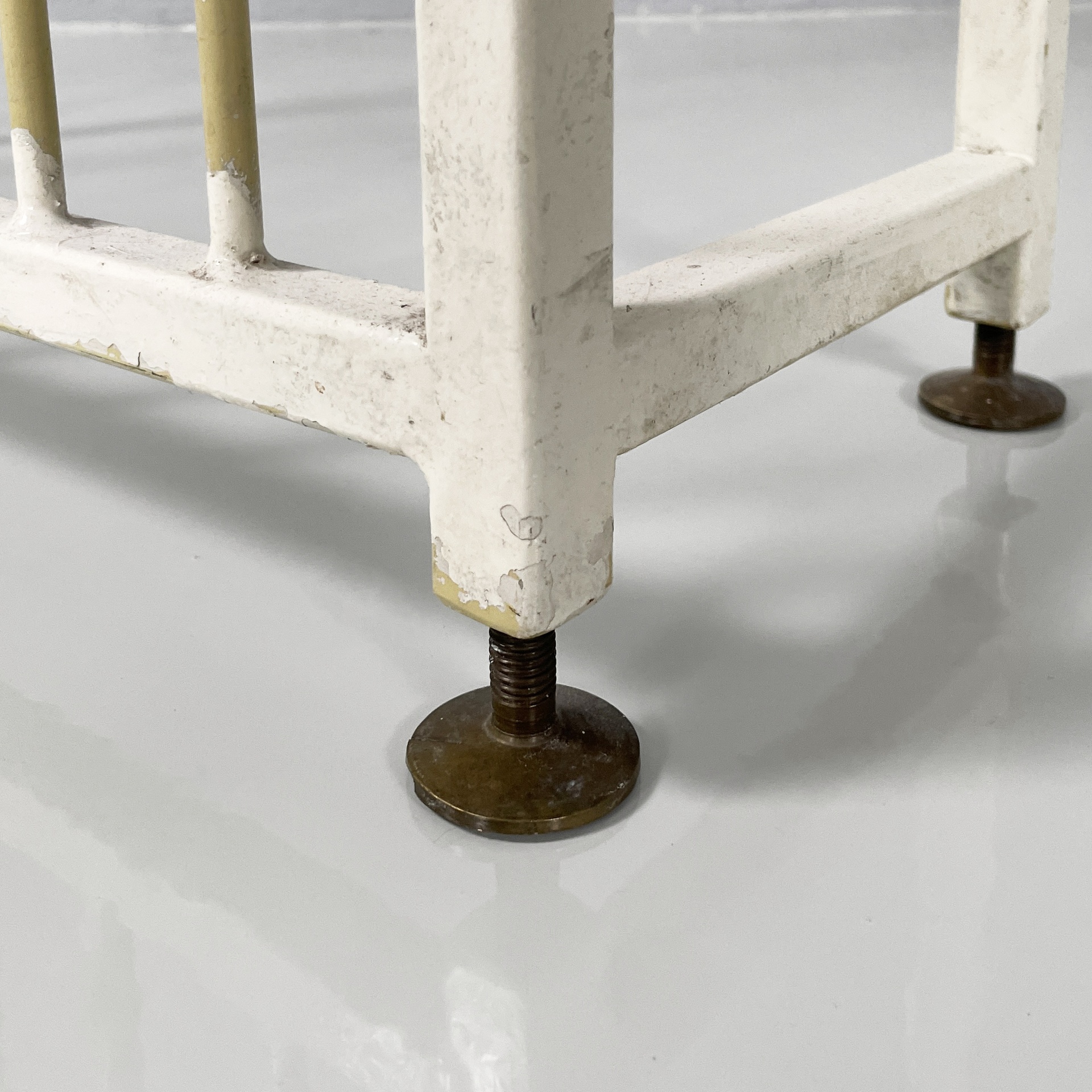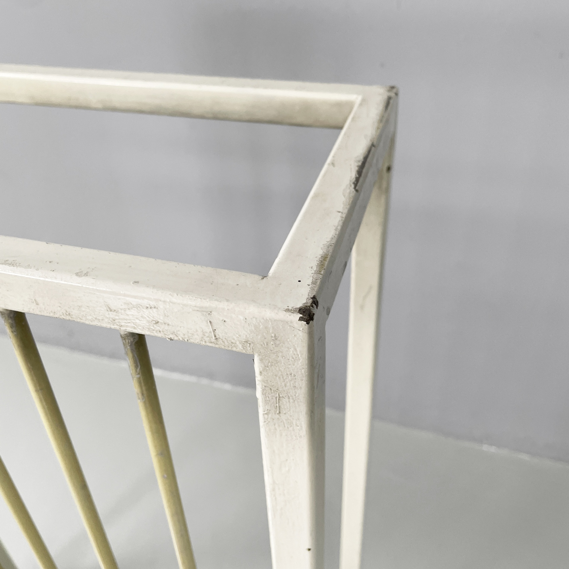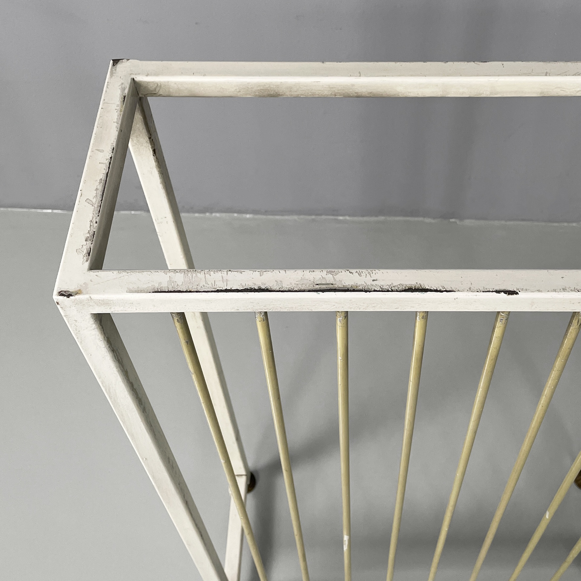 Copricalorifero a base rettangolare, interamente in metallo. La struttura a sezione quadrata in metallo verniciato bianco presenta sul fronte una serie di tondini di metallo verniciato beige. Piedini tondi in metallo.