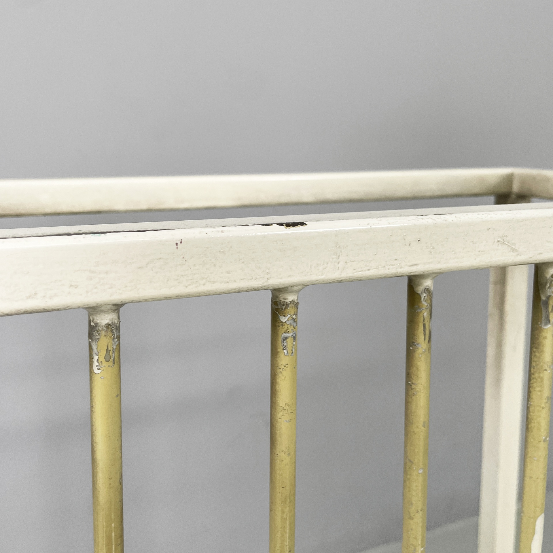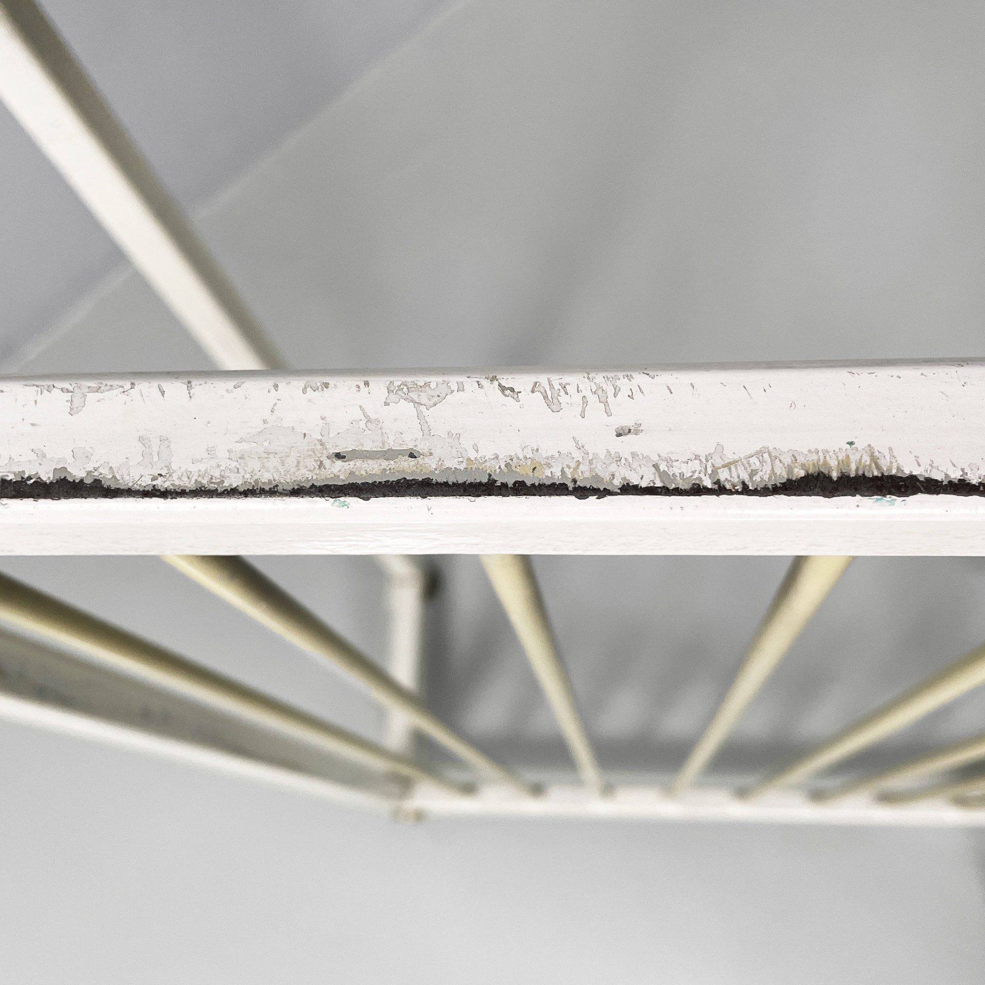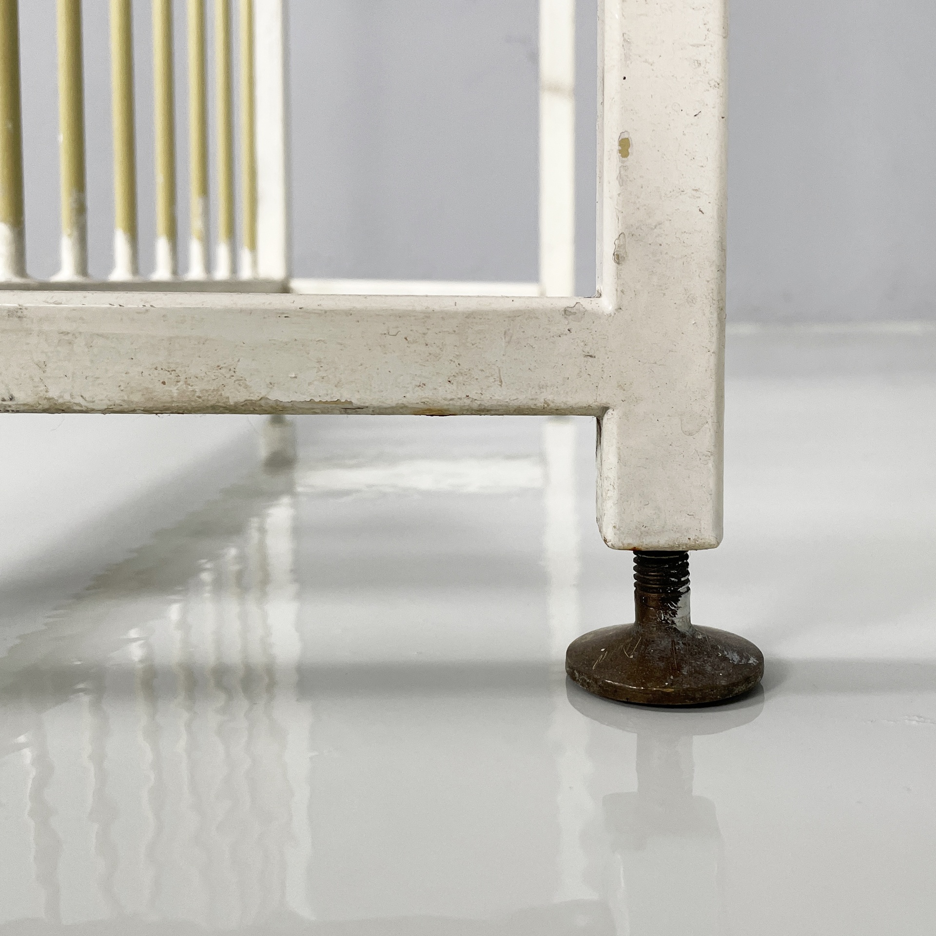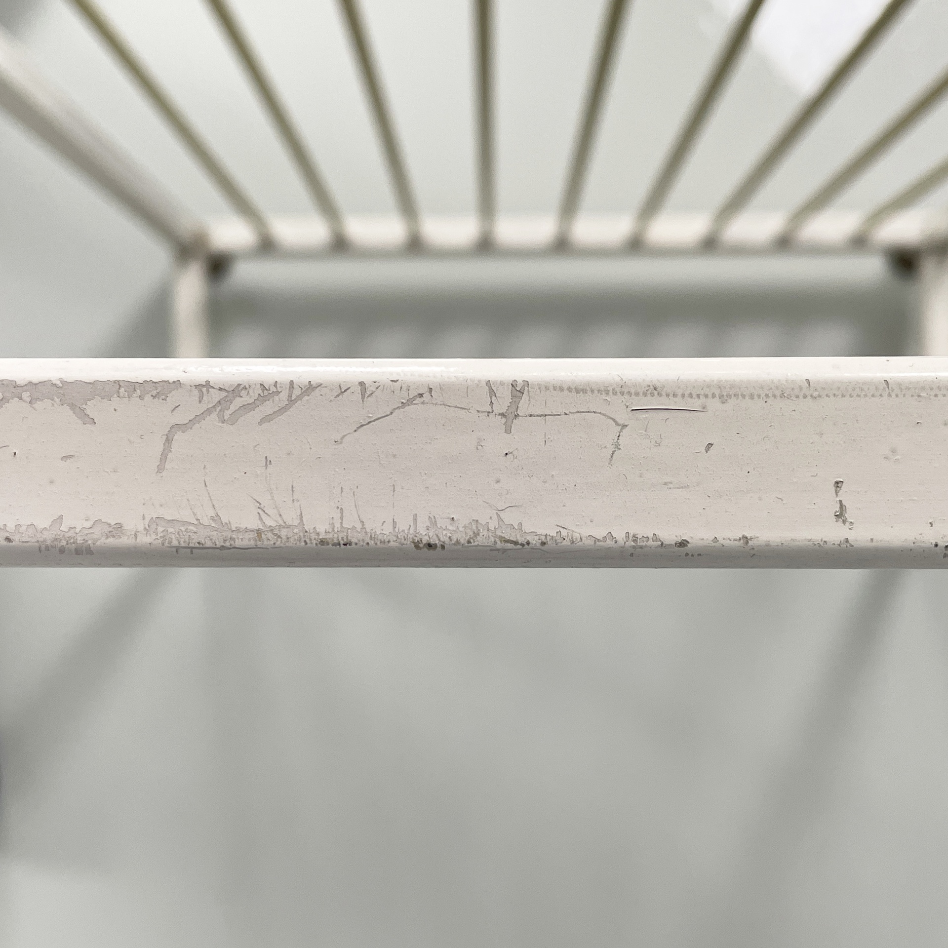 Copricalorifero a base rettangolare, interamente in metallo. La struttura a sezione quadrata in metallo verniciato bianco presenta sul fronte una serie di tondini di metallo verniciato beige. Piedini tondi in metallo.