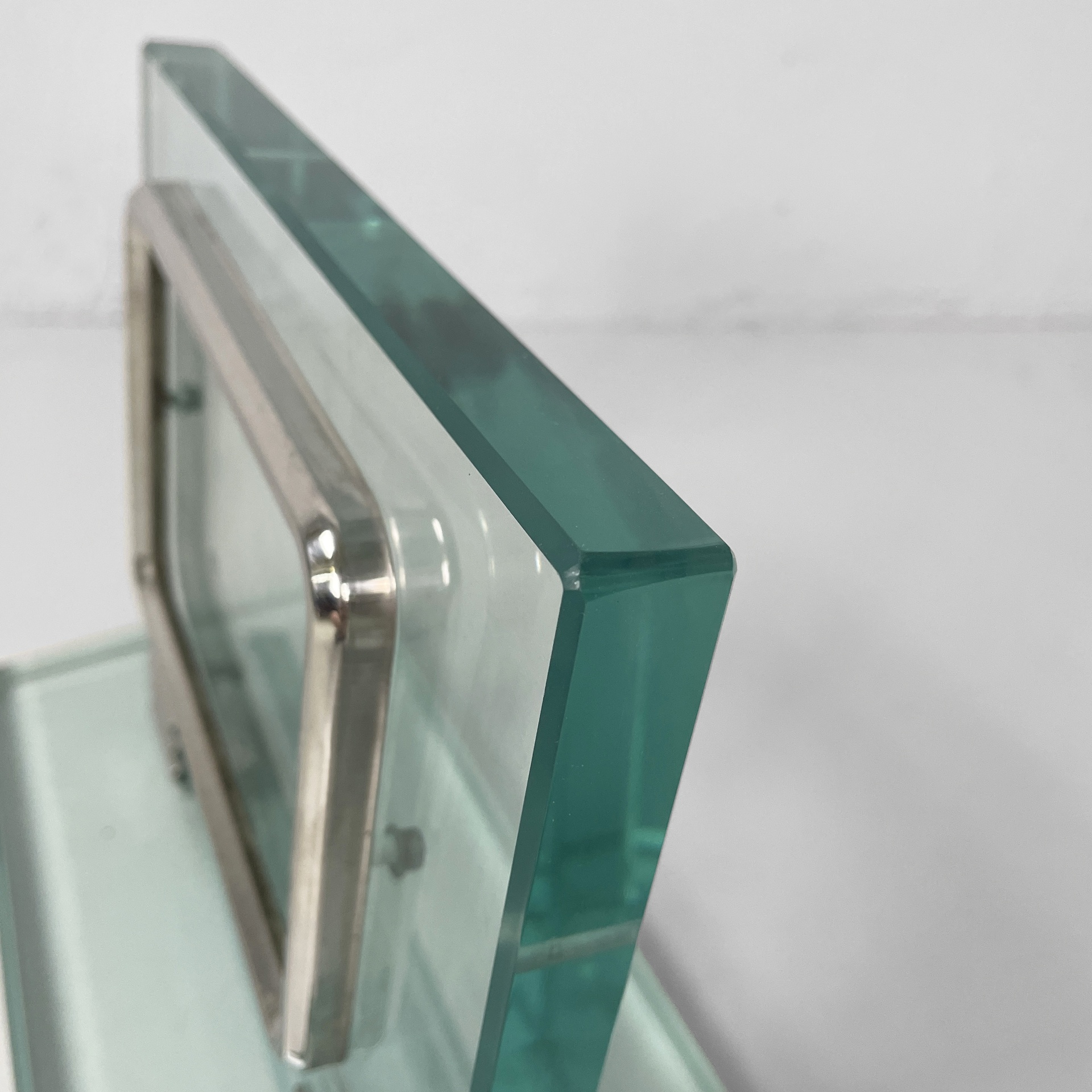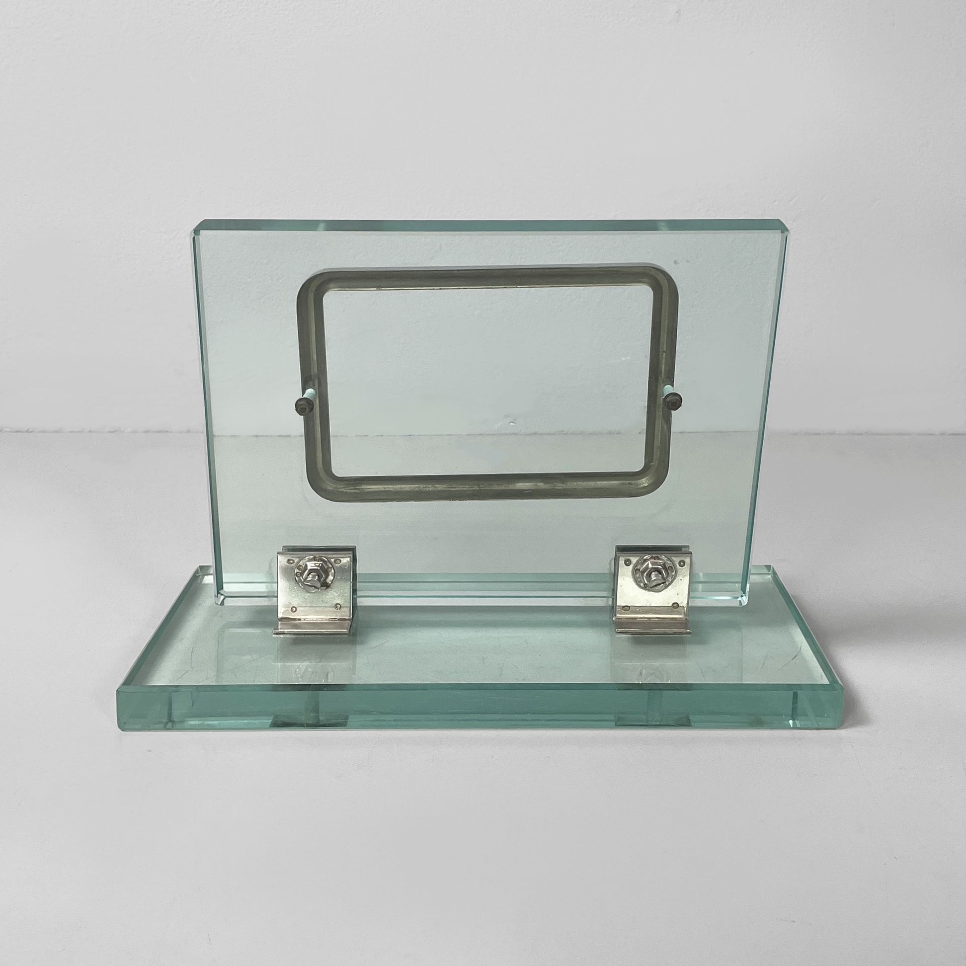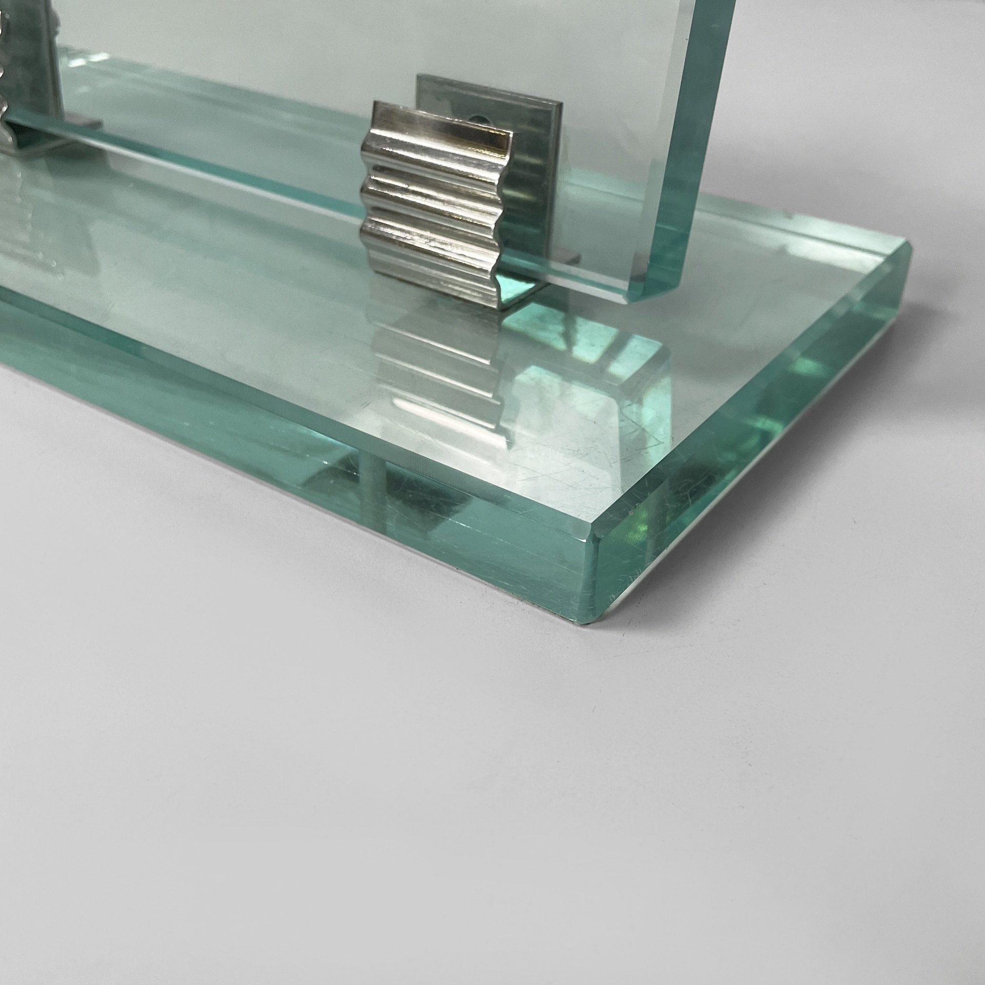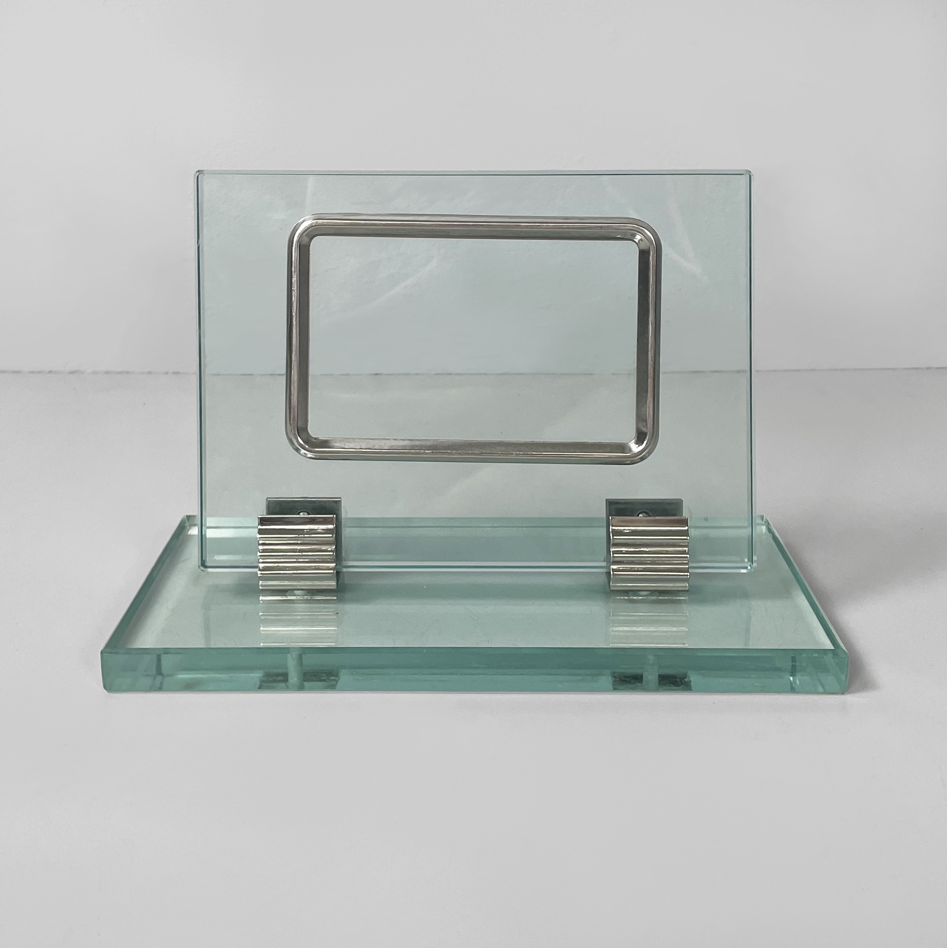 Cornice portafoto da tavolo con cornice in metallo. La struttura è composta da una lastra di vetro di grosso spessore, la quale si incastra in due morsetti di metallo ancorati alla base. Base squadrata in vetro di grosso spessore.