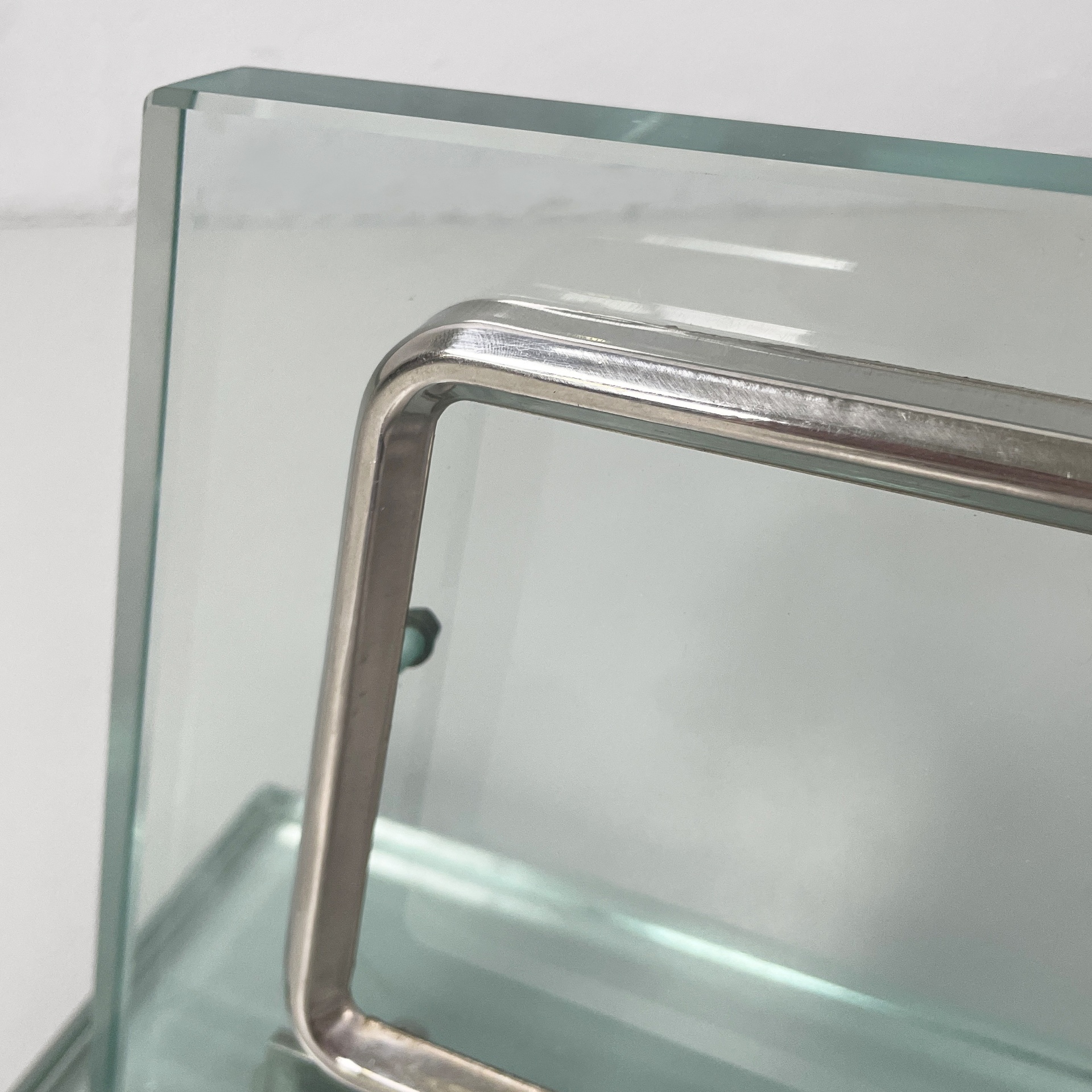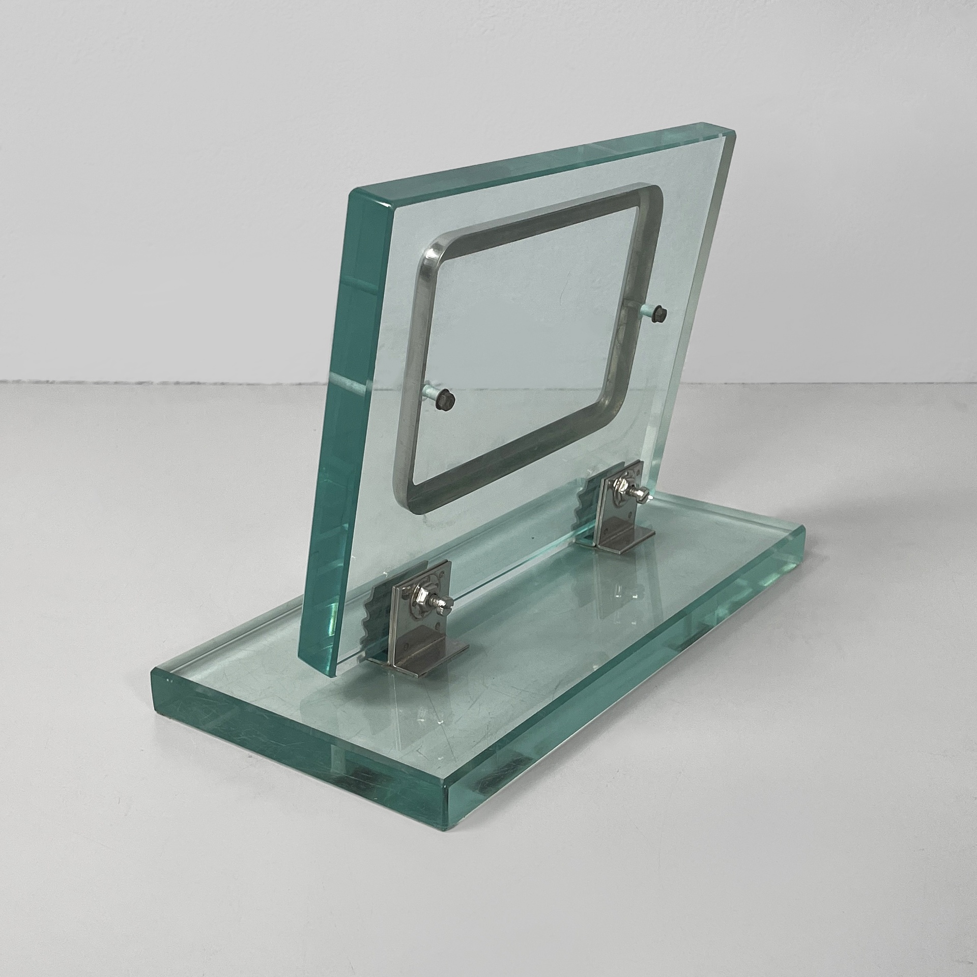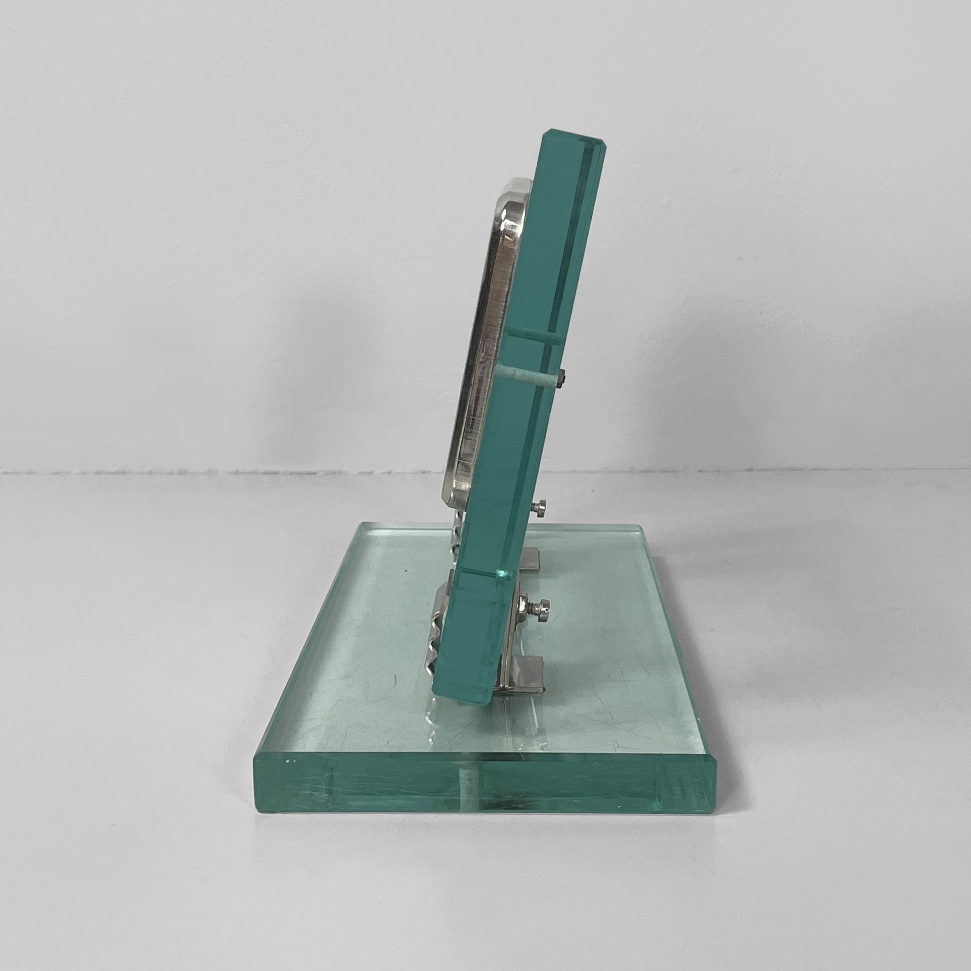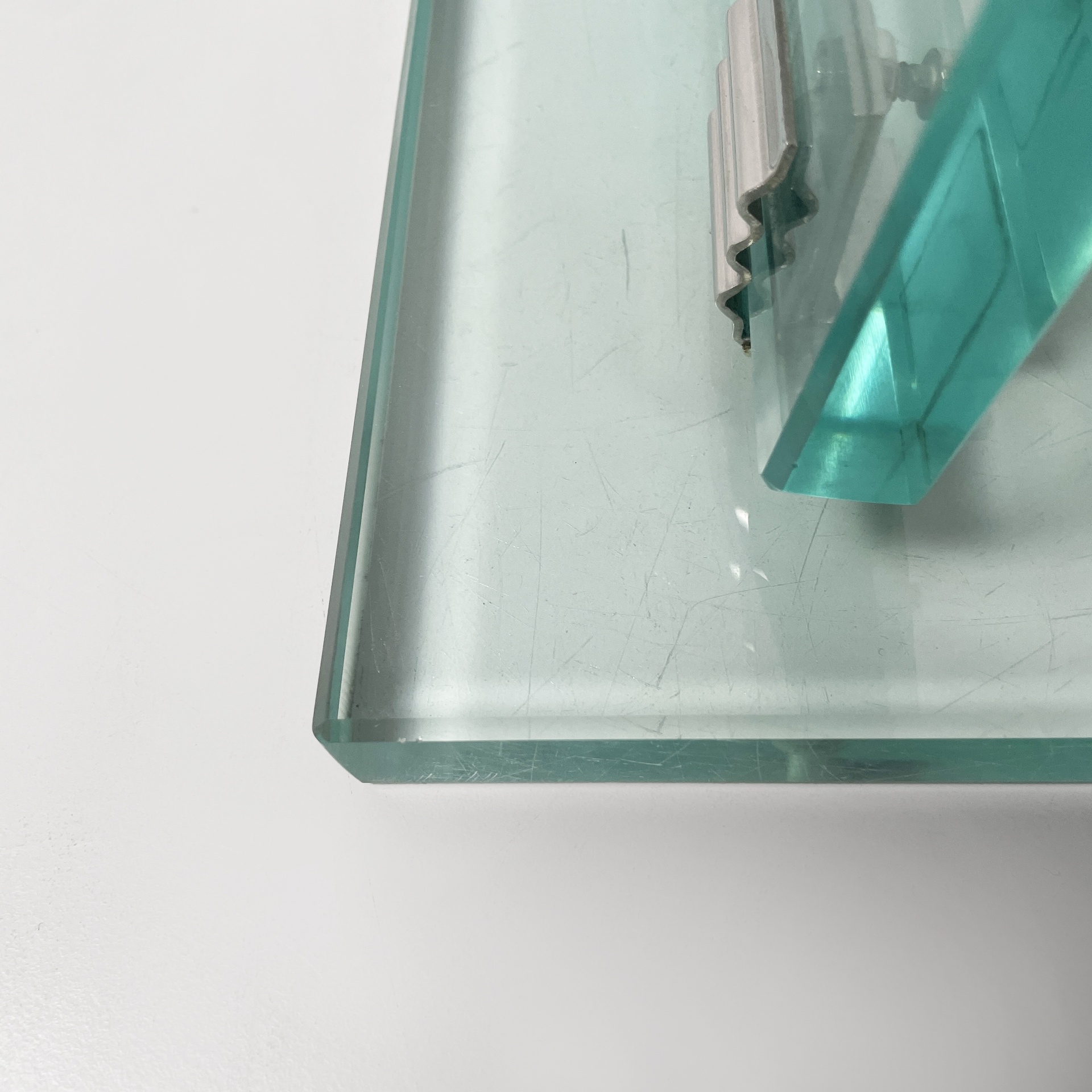 Cornice portafoto da tavolo con cornice in metallo. La struttura è composta da una lastra di vetro di grosso spessore, la quale si incastra in due morsetti di metallo ancorati alla base. Base squadrata in vetro di grosso spessore.