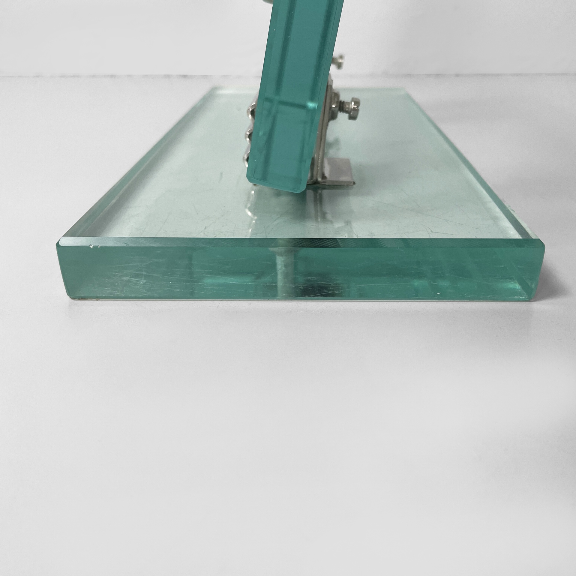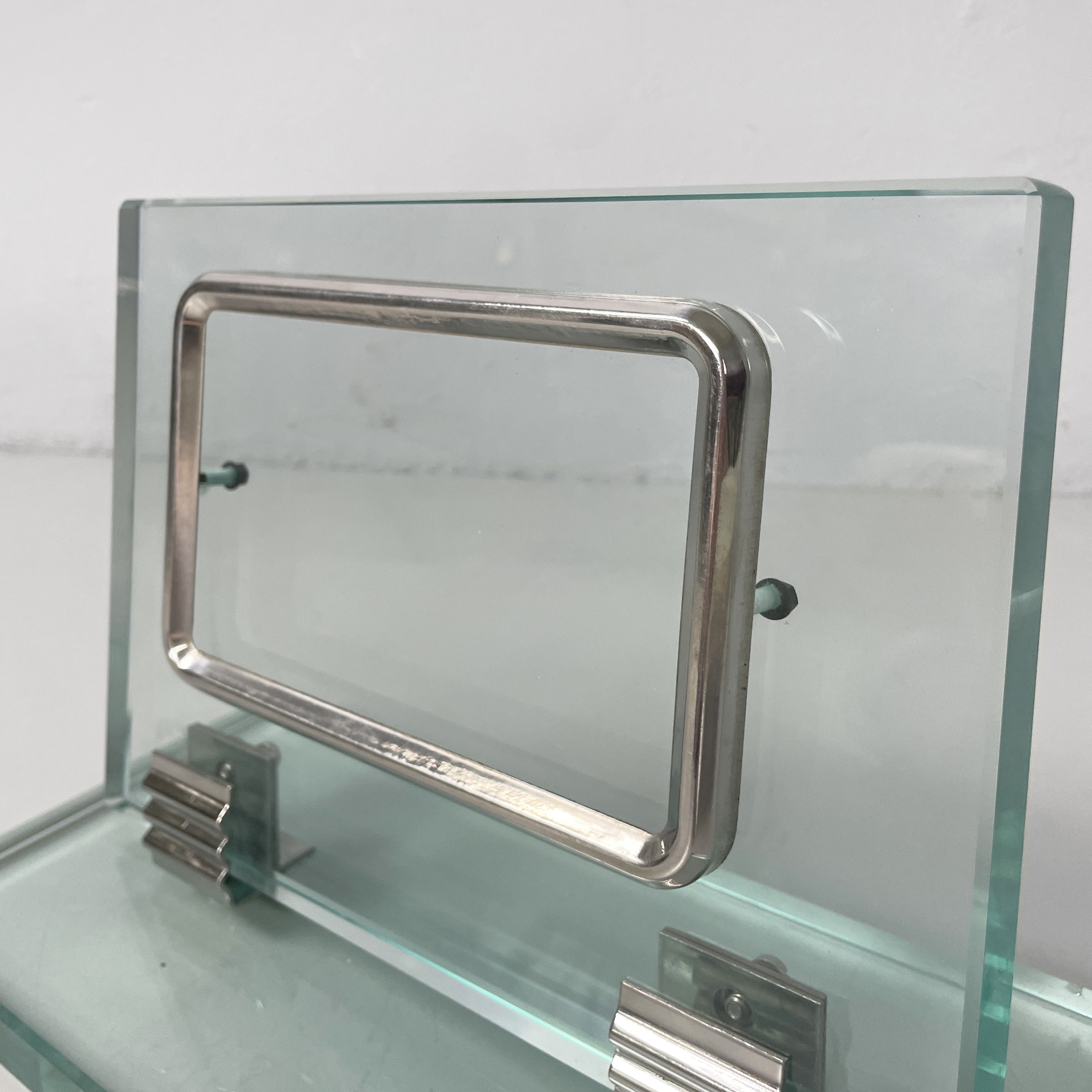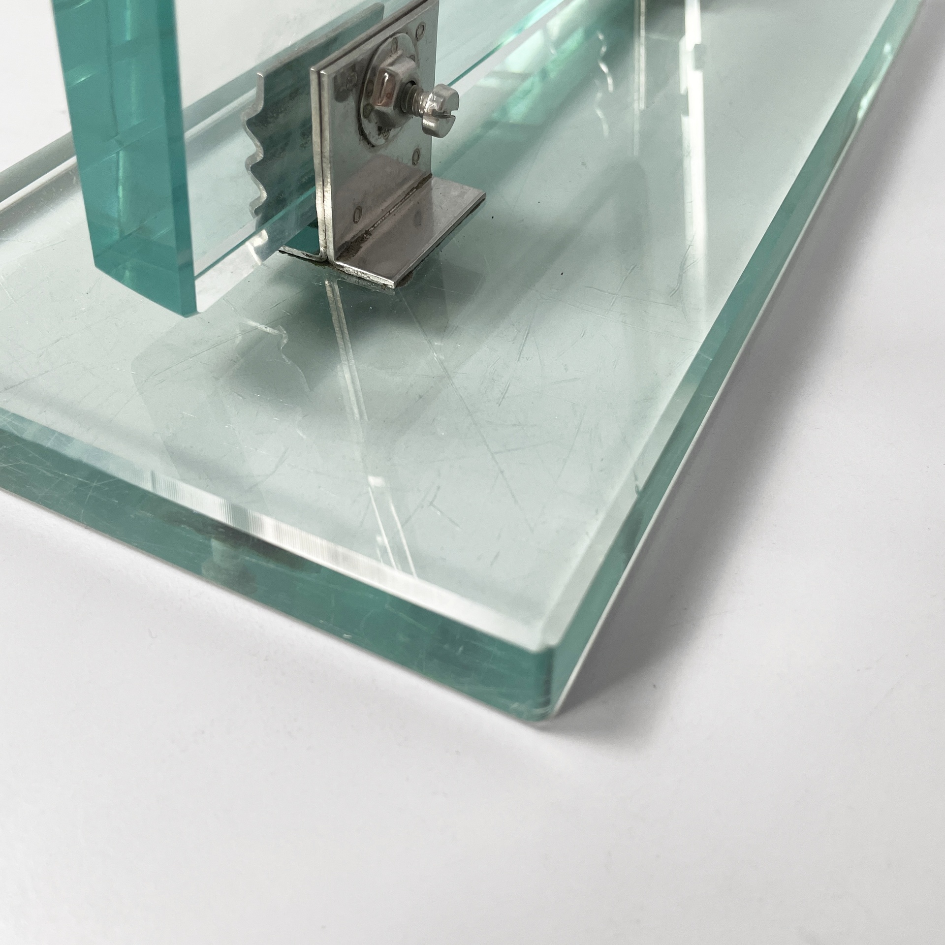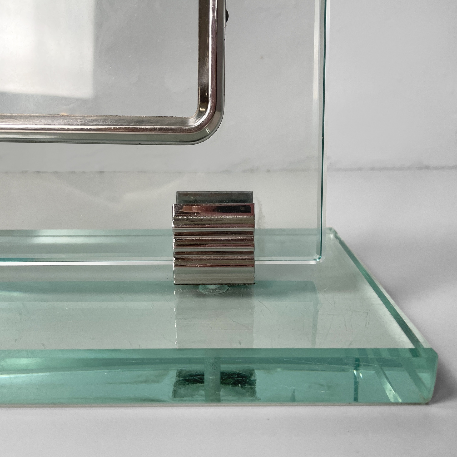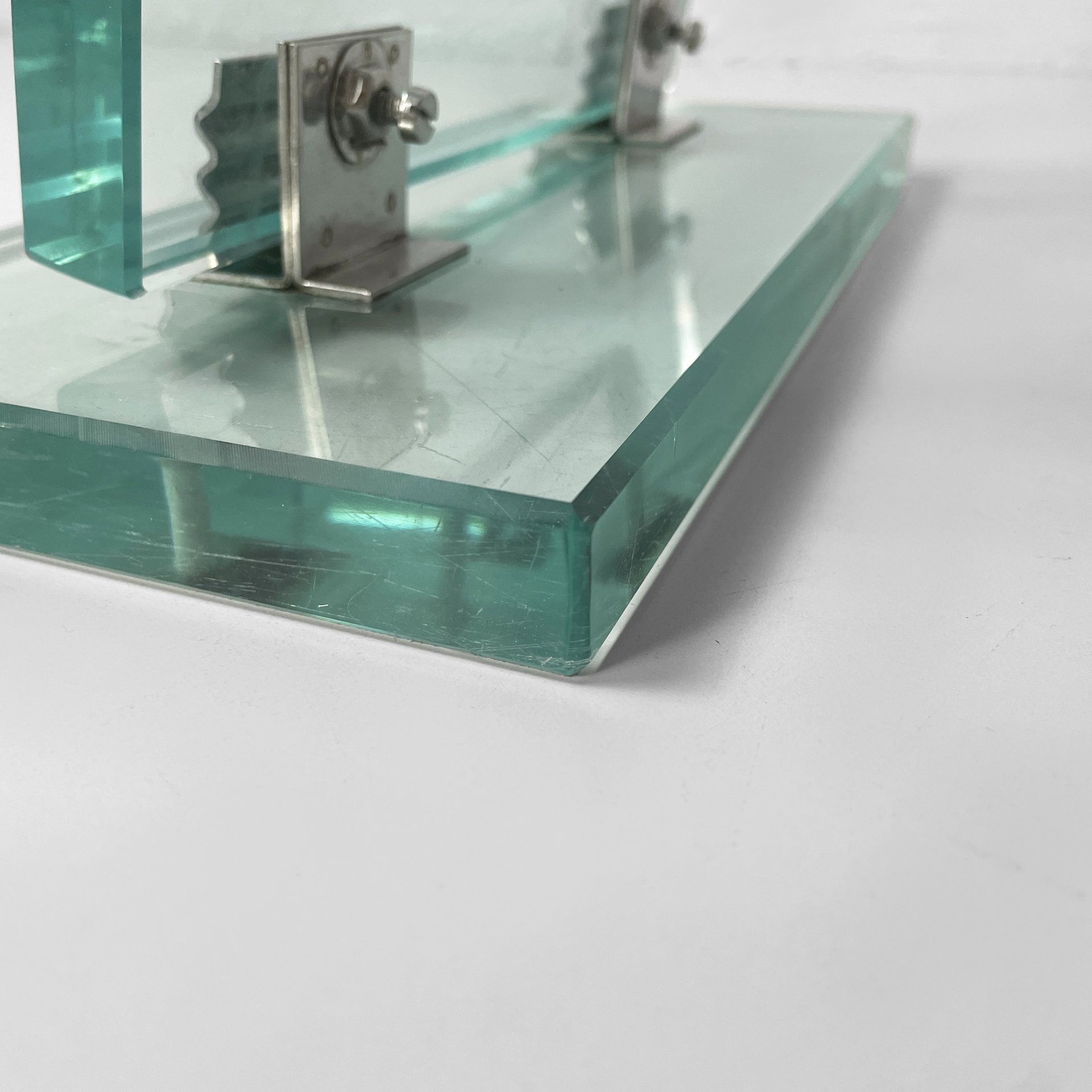Cornice portafoto da tavolo con cornice in metallo. La struttura è composta da una lastra di vetro di grosso spessore, la quale si incastra in due morsetti di metallo ancorati alla base. Base squadrata in vetro di grosso spessore.