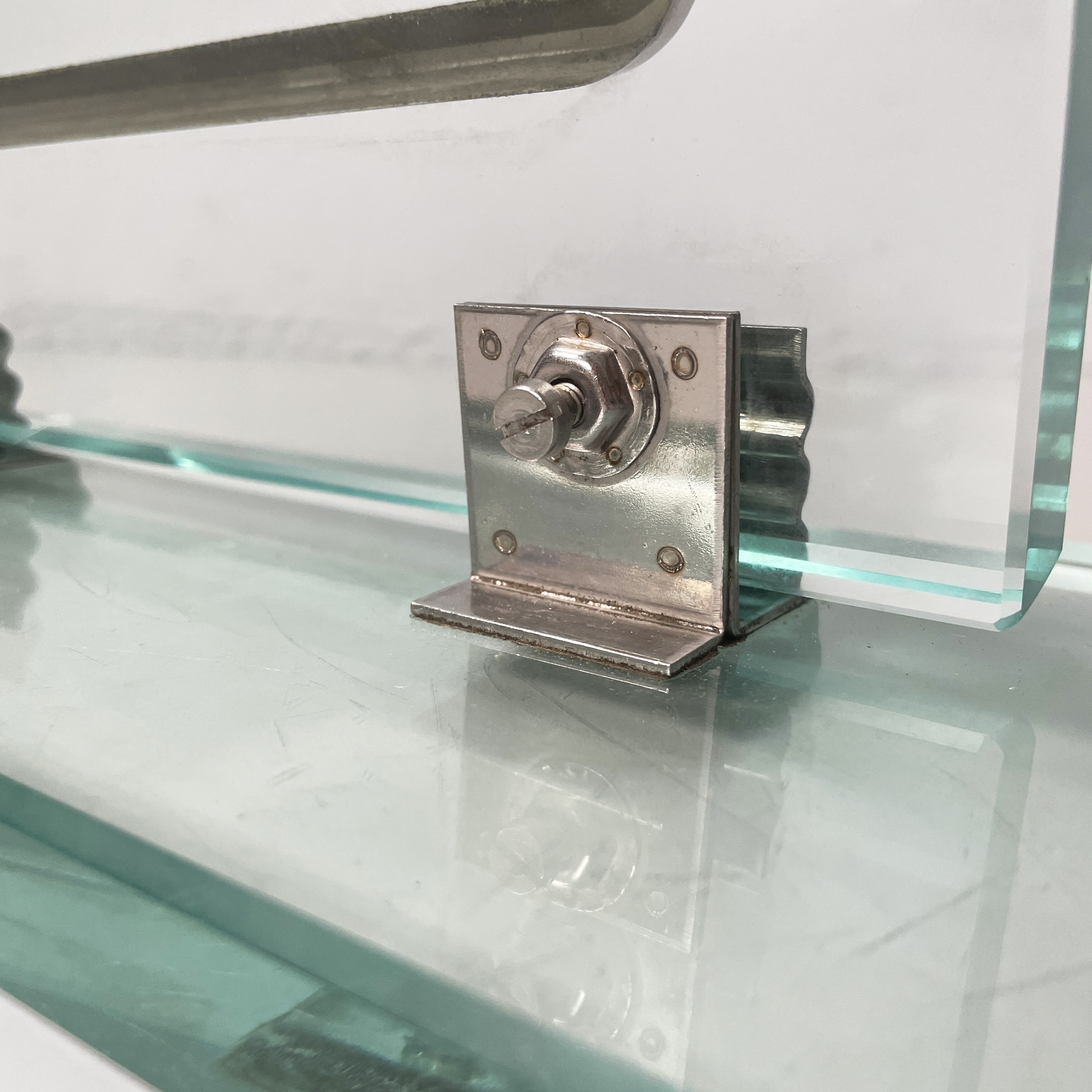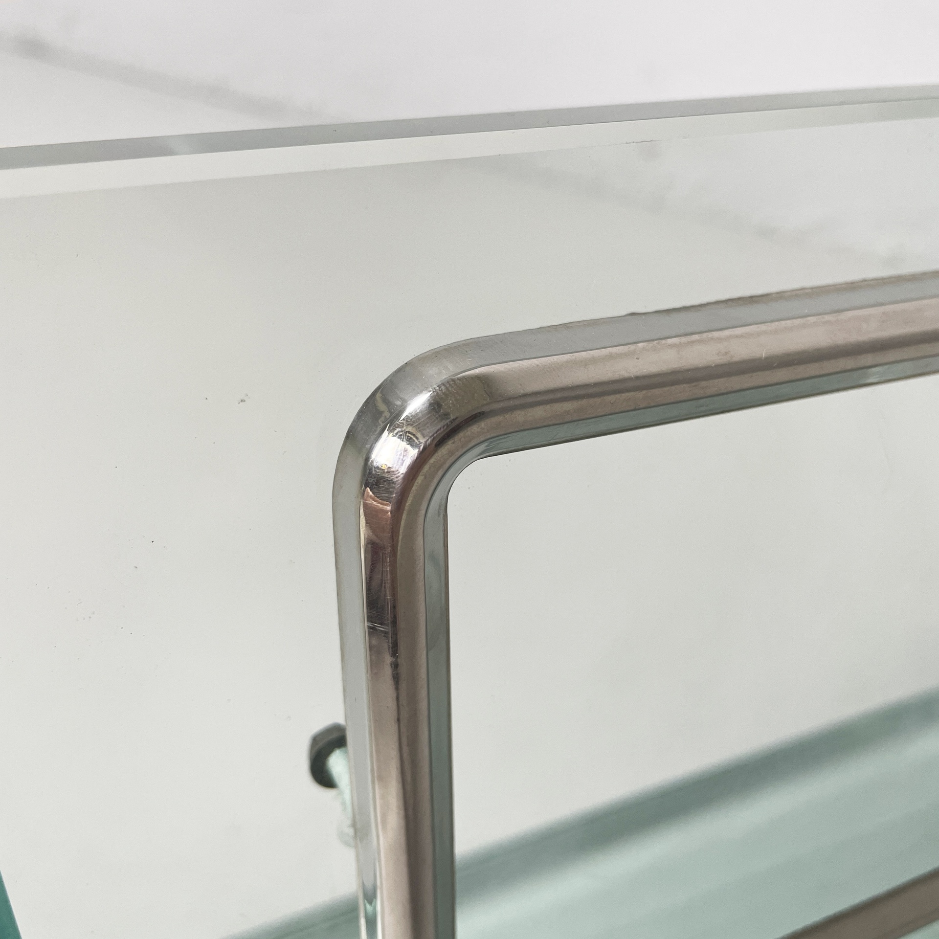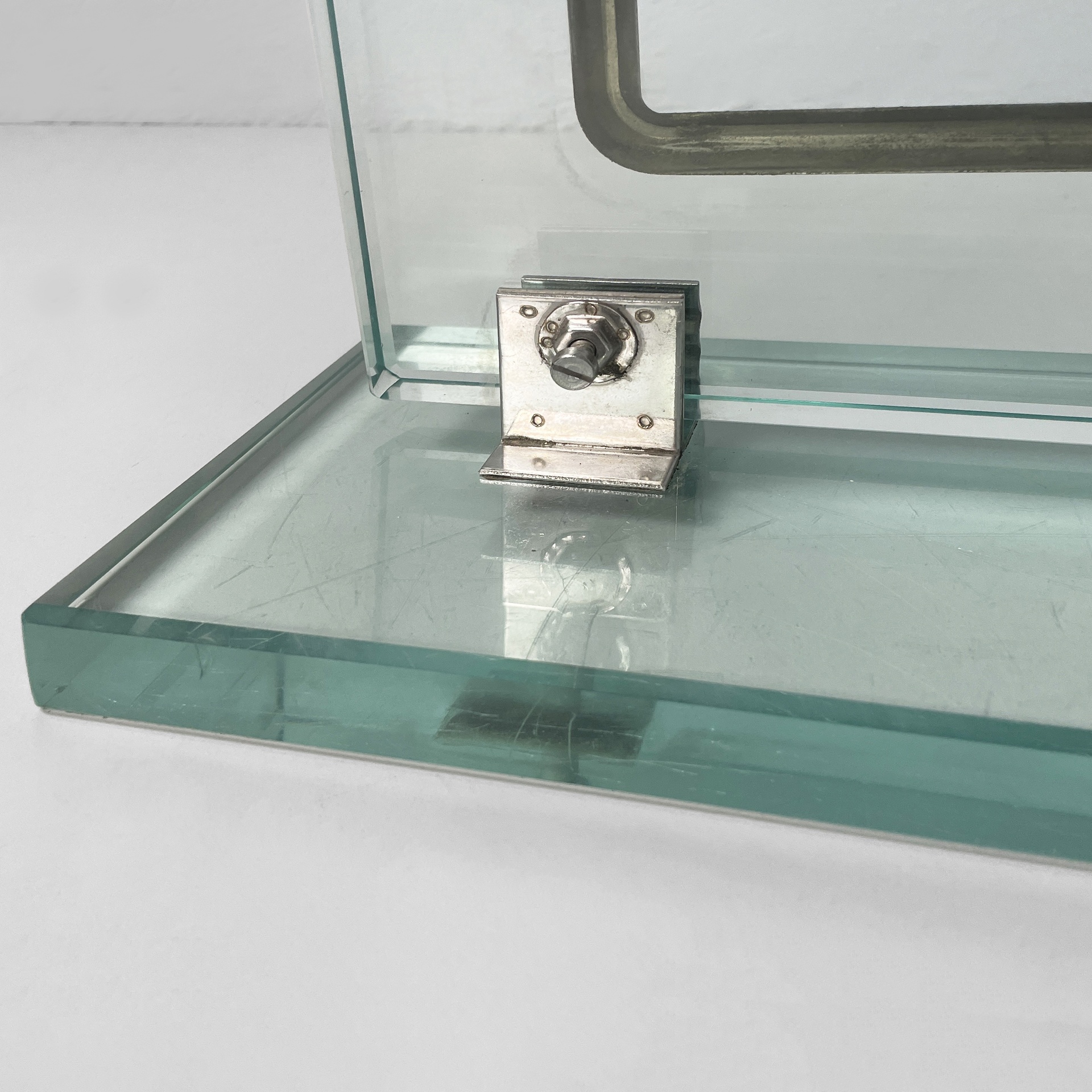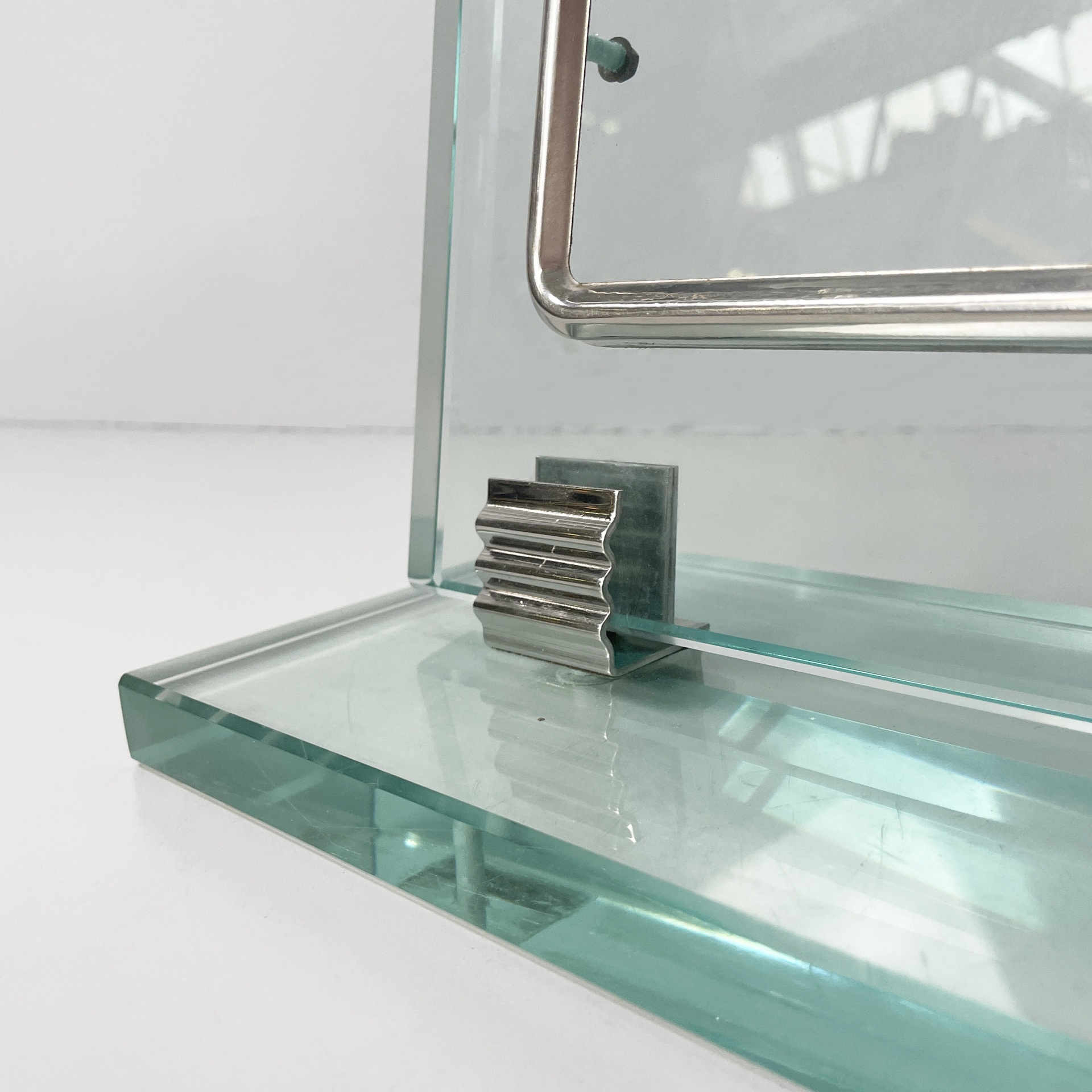 Cornice portafoto da tavolo con cornice in metallo. La struttura è composta da una lastra di vetro di grosso spessore, la quale si incastra in due morsetti di metallo ancorati alla base. Base squadrata in vetro di grosso spessore.