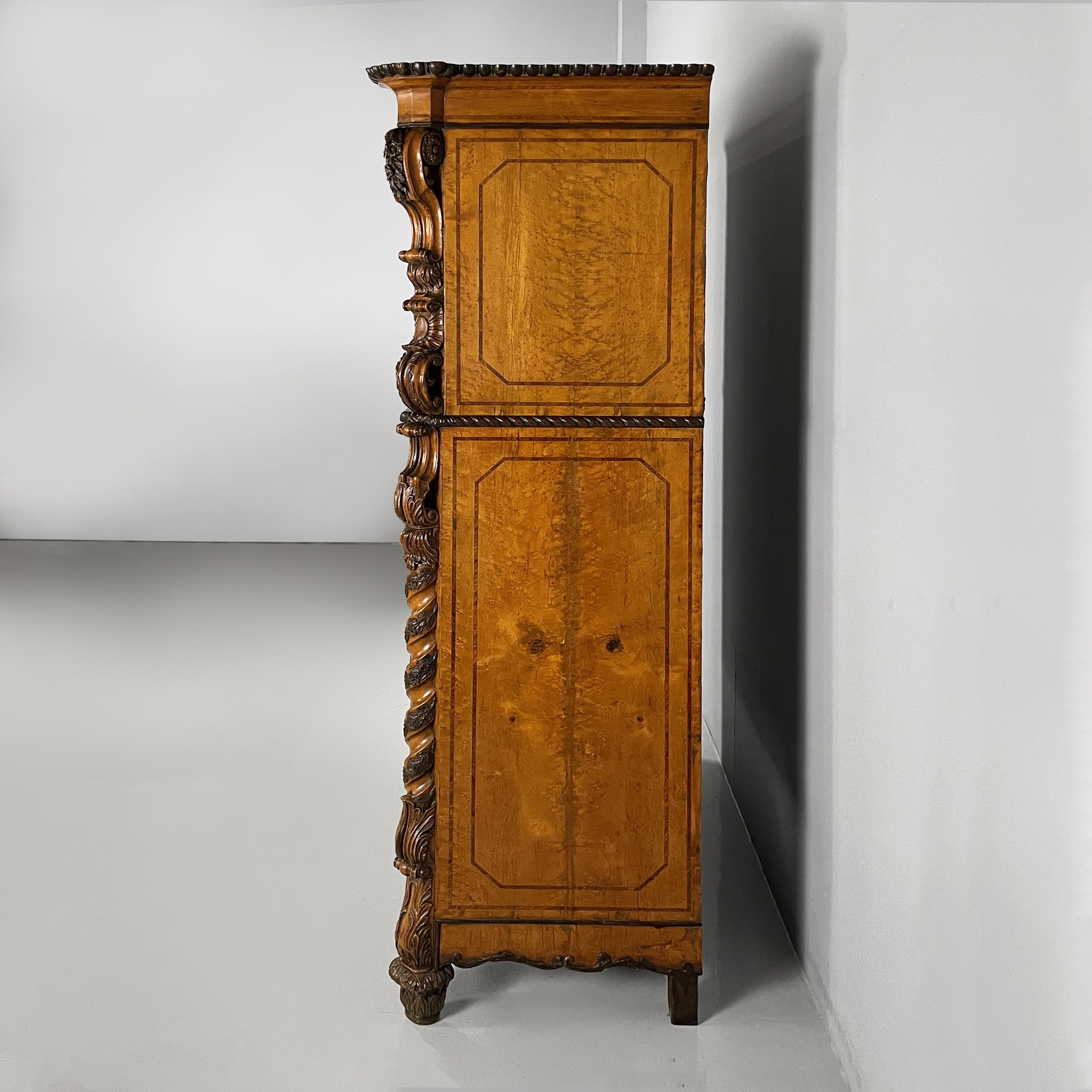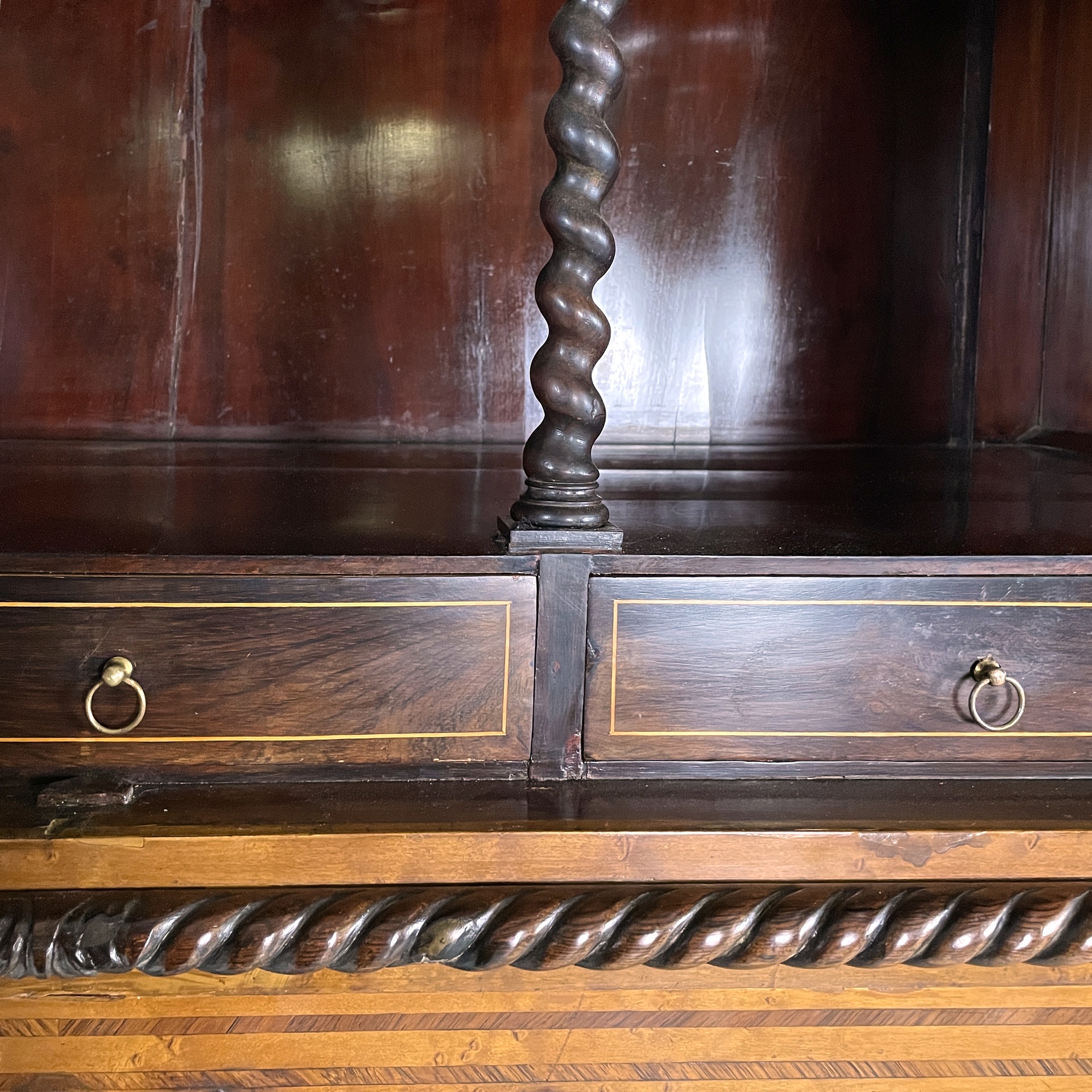 Credenza in legno finemente lavorato. Nella parte superiore presenta un vano con doppia anta a battente in legno lavorato e due specchi. All’interno è presente un vano con quattro colonnine in legno scuro tornito e tre cassetti in legno scuro con maniglie tonde in metallo. Nella parte inferiore è presente la cassettiera con cinque cassetti con serratura. Chiave presente. I profili del sideboard presentano decori in legno tornito. I piedini anteriori sono finemente lavorati, quelli posteriori sono squadrati. In stile Carlo X (inizio 1800 ca.) Utilizzabile come highboard