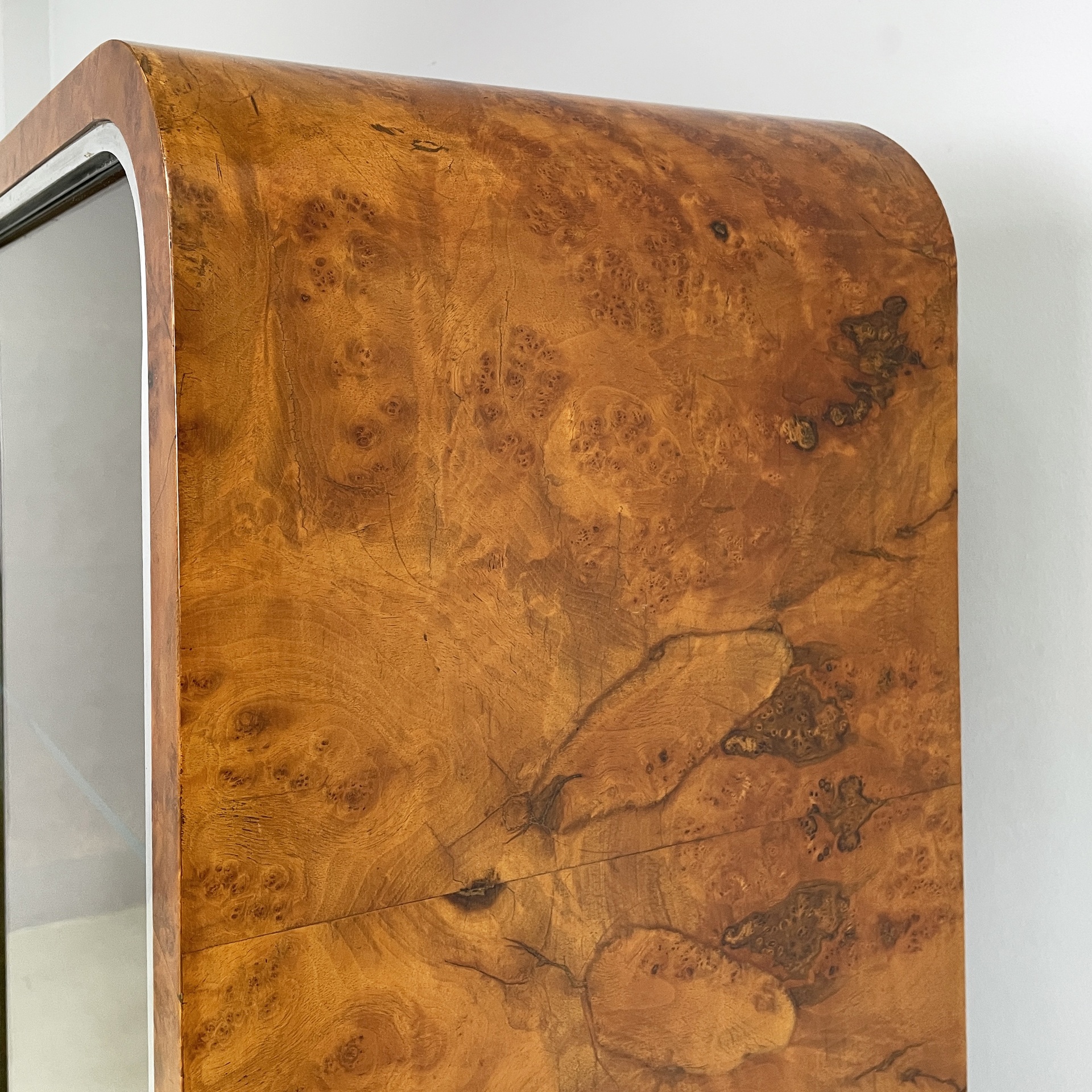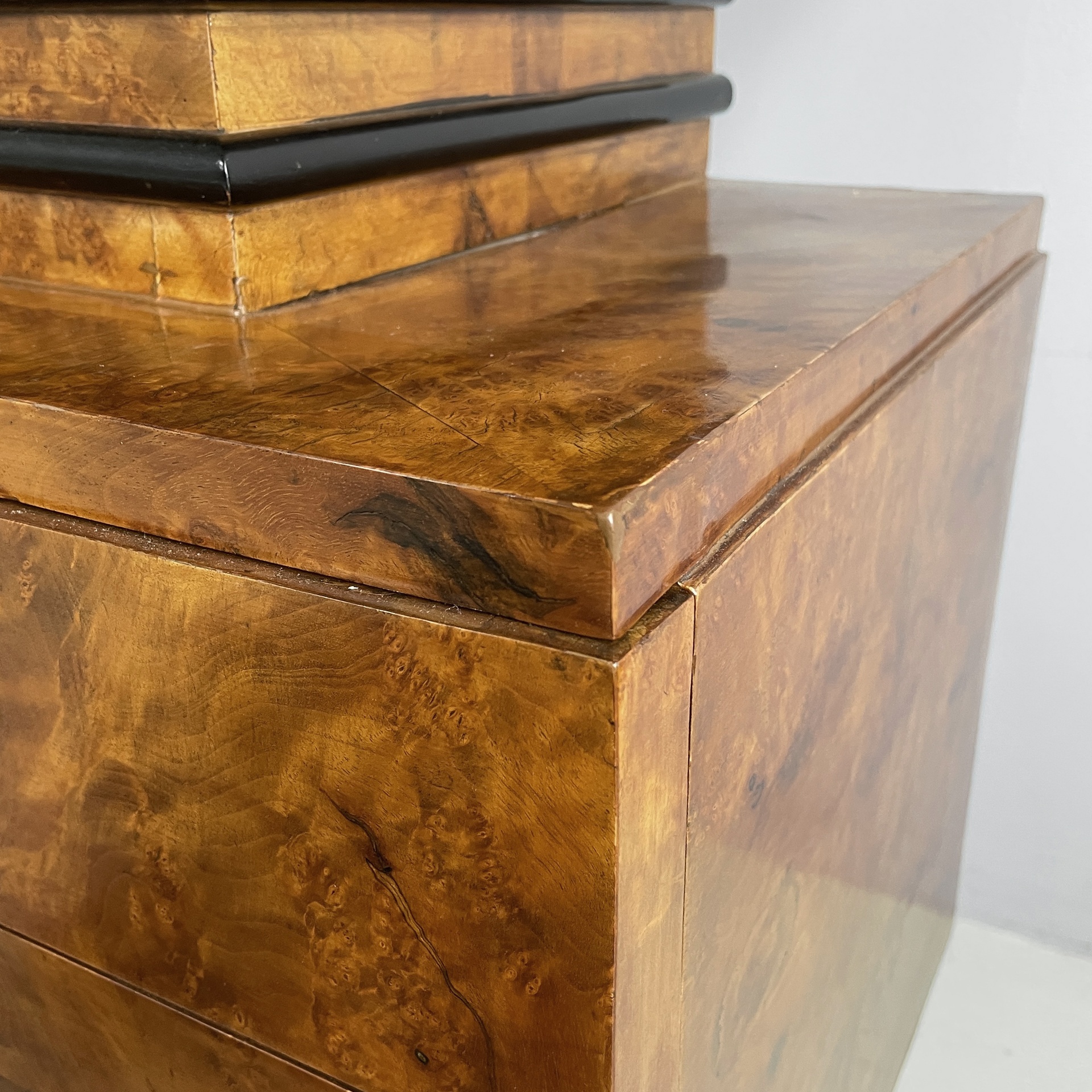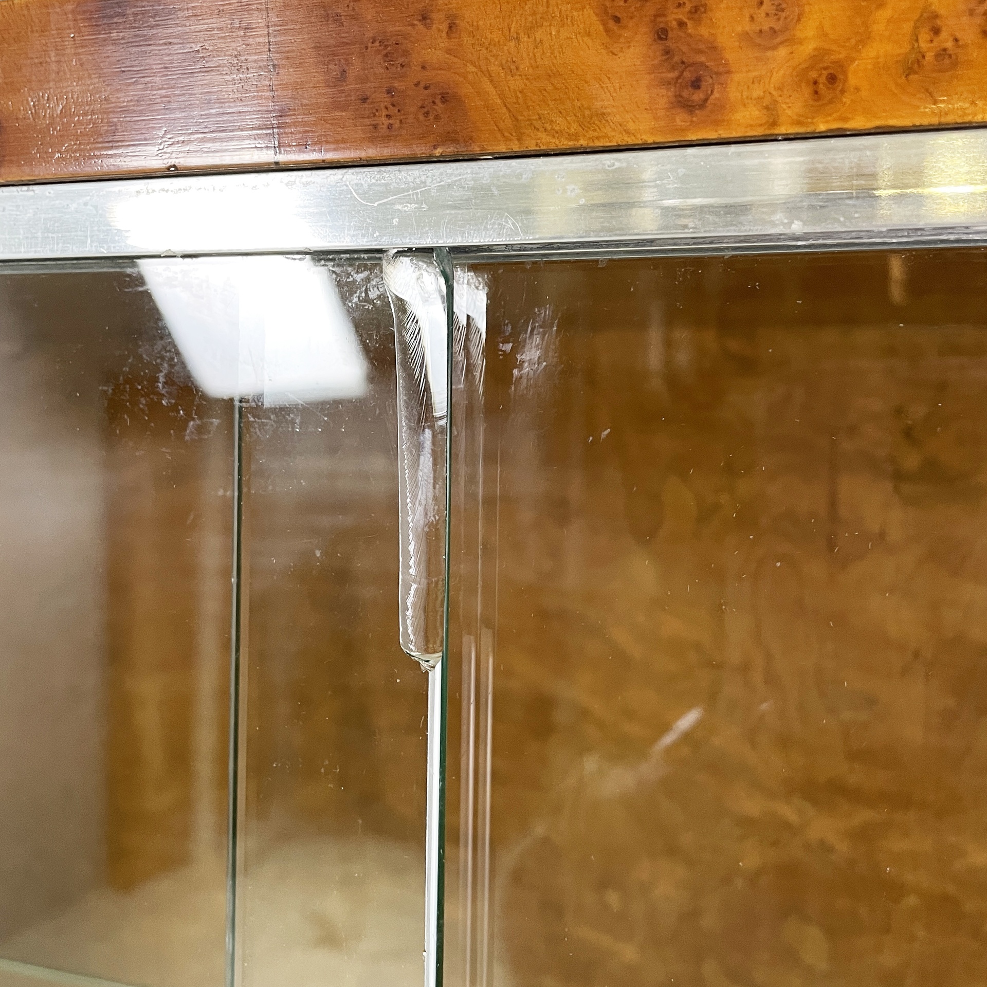 Credenza con vetrina asimmetrica in legno e vetro. Il vano superiore rettangolare ad angoli arrotondati in legno presenta due ante a scorrimento e due mensole interne in vetro. Nella parte inferiore in legno presenta un vano con anta a battente e tre cassetti. Maniglie tonde in plastica trasparente. Dettagli in legno nero in rilievo. Base rettangolare con dettaglio in metallo. Art Deco. Utilizzabile come highboard o sideboard.