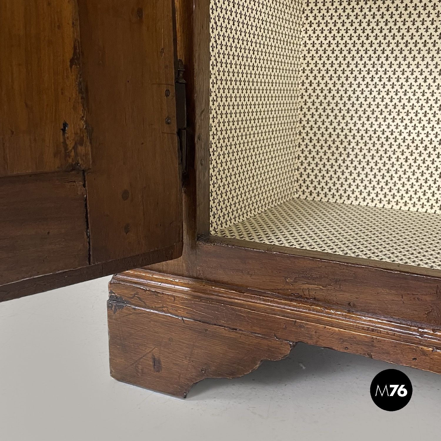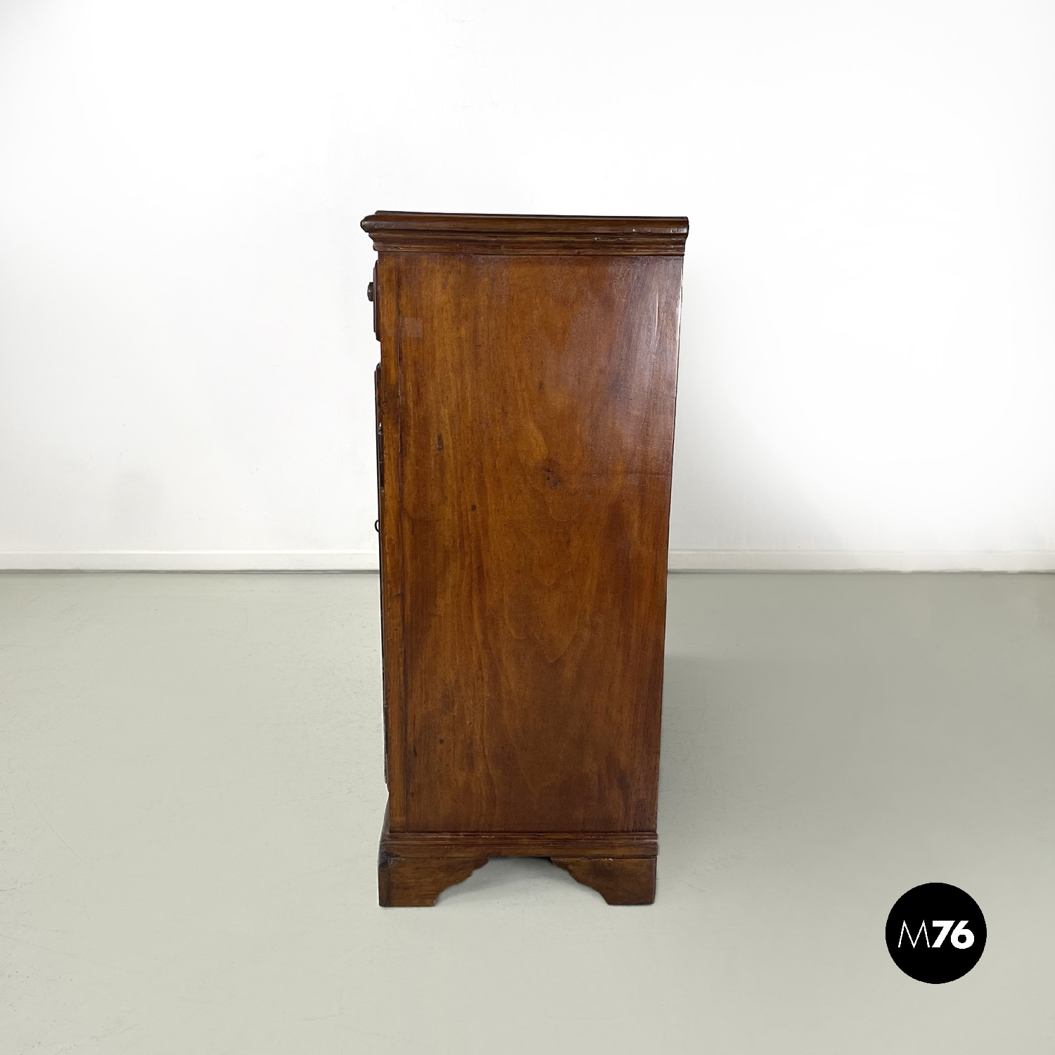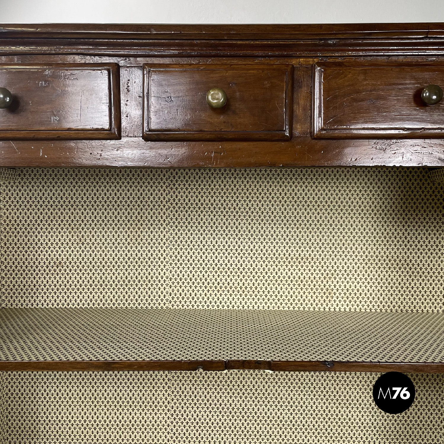 Credenza a base rettangolare interamente in legno. Presenta un piano con i lati del perimetro sagomati, sotto si trovano tre cassetti di cui quello centrale più piccolo con pomelli tondi in ottone. Nella parte inferiore presenta due ante, una con la serratura e la chiave, al cui interno si trovano due piani. L’interno è rivestito con carta da parati con decorazione. I quattro piedini sono sagomati e a sezione quadrata. Utilizzabile come madia.