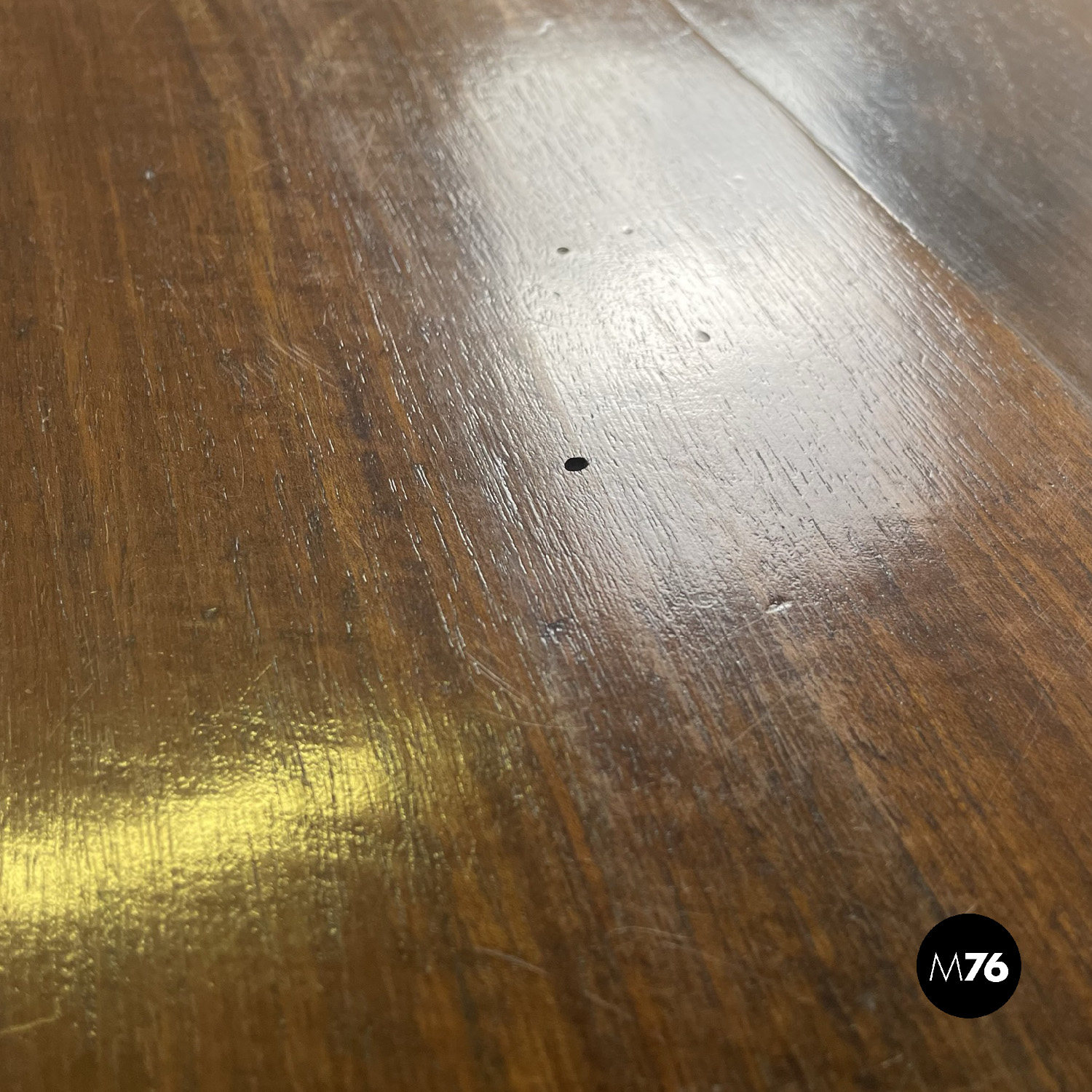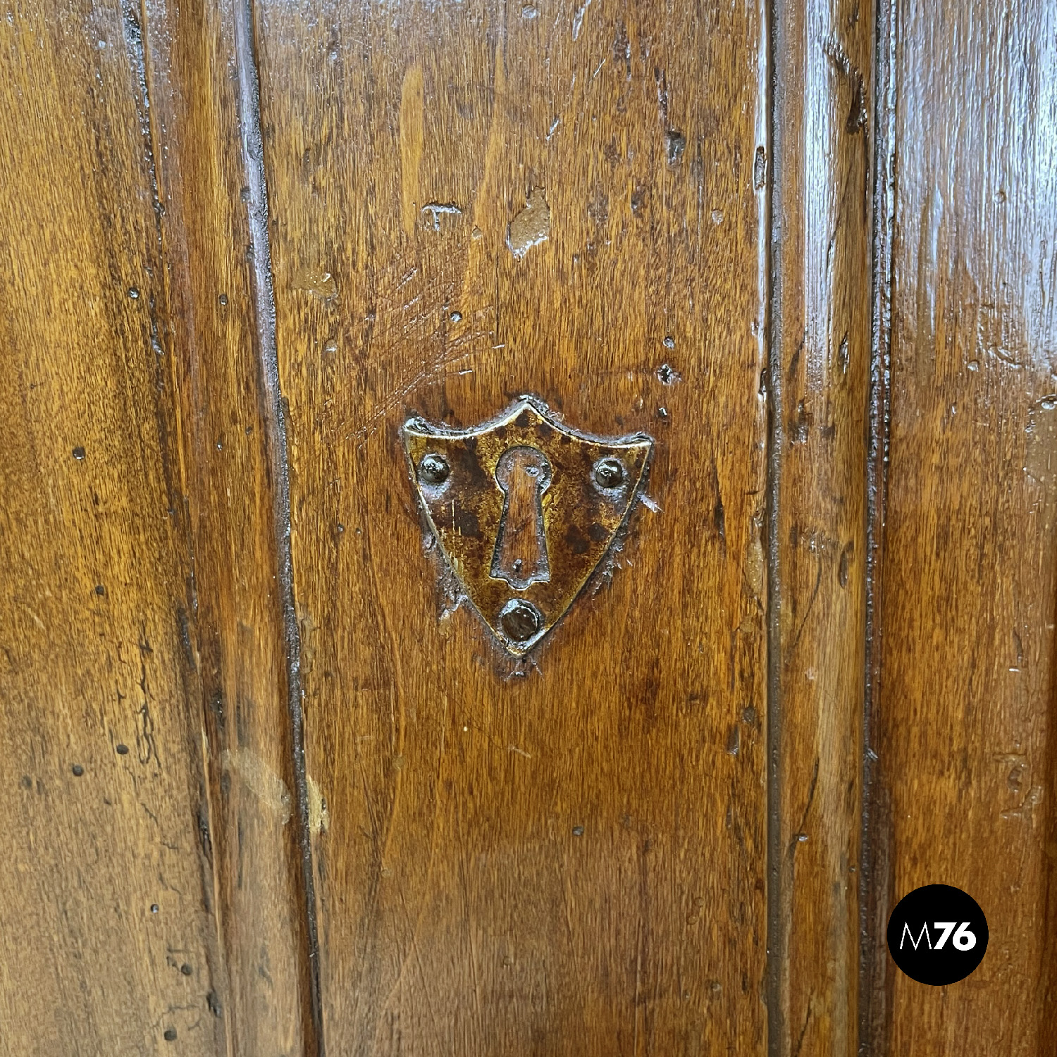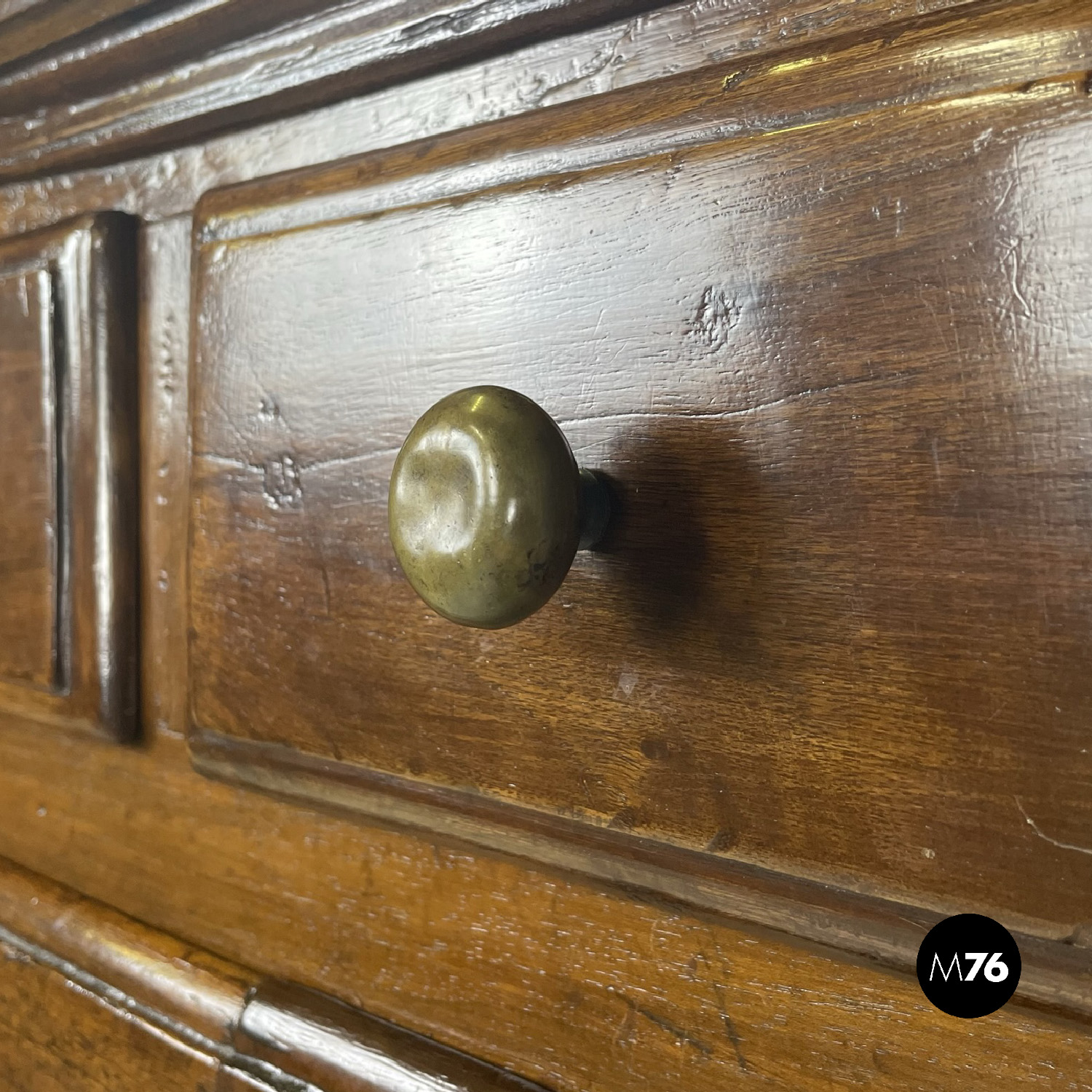 Credenza a base rettangolare interamente in legno. Presenta un piano con i lati del perimetro sagomati, sotto si trovano tre cassetti di cui quello centrale più piccolo con pomelli tondi in ottone. Nella parte inferiore presenta due ante, una con la serratura e la chiave, al cui interno si trovano due piani. L’interno è rivestito con carta da parati con decorazione. I quattro piedini sono sagomati e a sezione quadrata. Utilizzabile come madia.